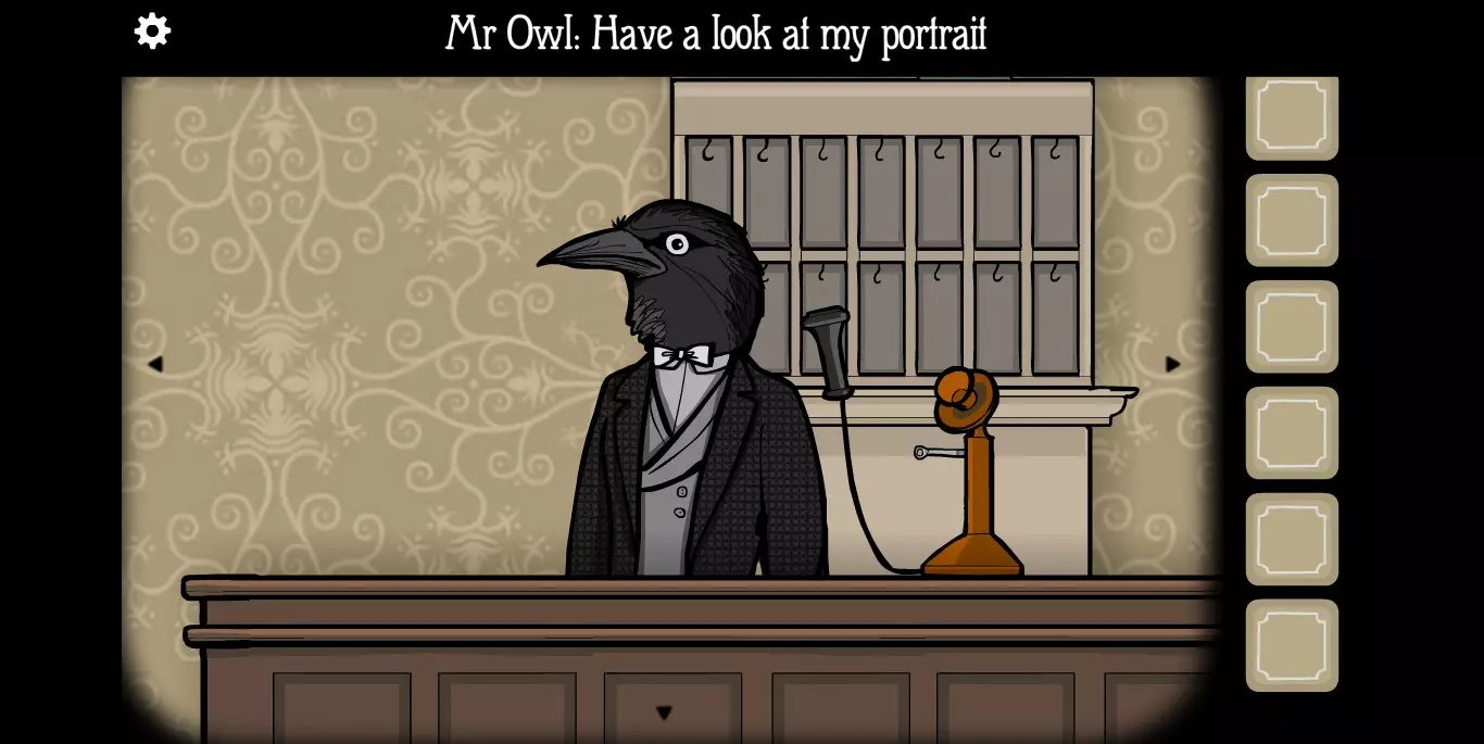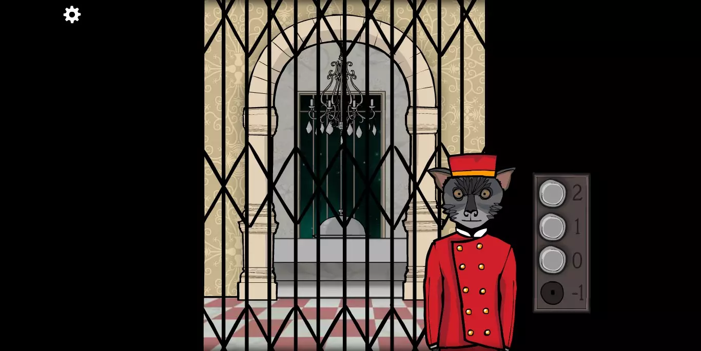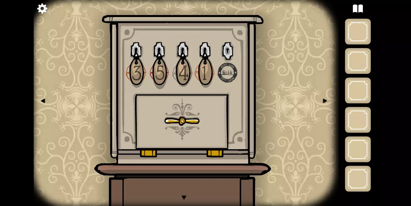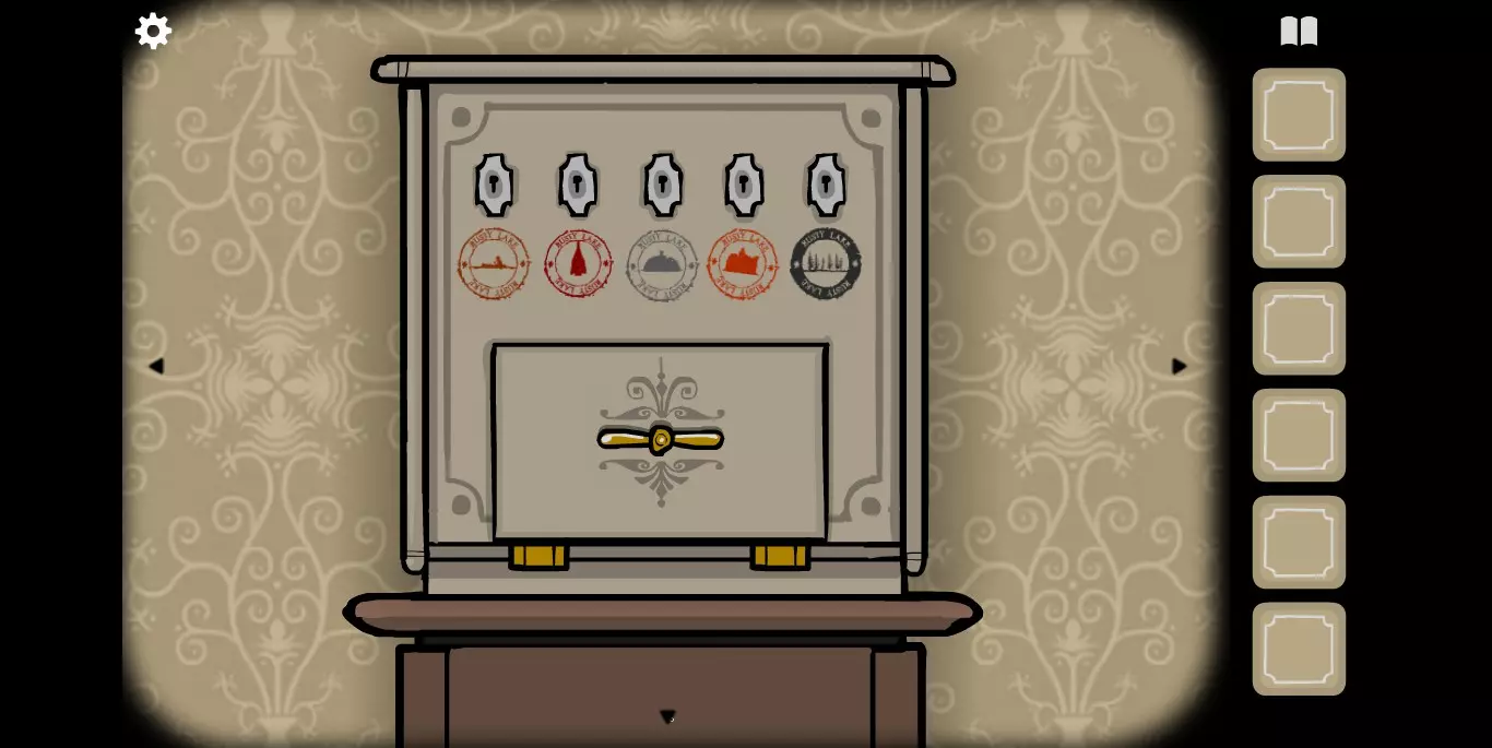 在大厅里还有一个细节需要注意,MROWL照片的下方有一个密码箱,需要五把插入顺序正确的钥匙,每个钥匙对应一个图标。在这里记得这件事情,涉及到与其他锈湖系列有关的秘密。然后直接走向电梯,去1楼。
