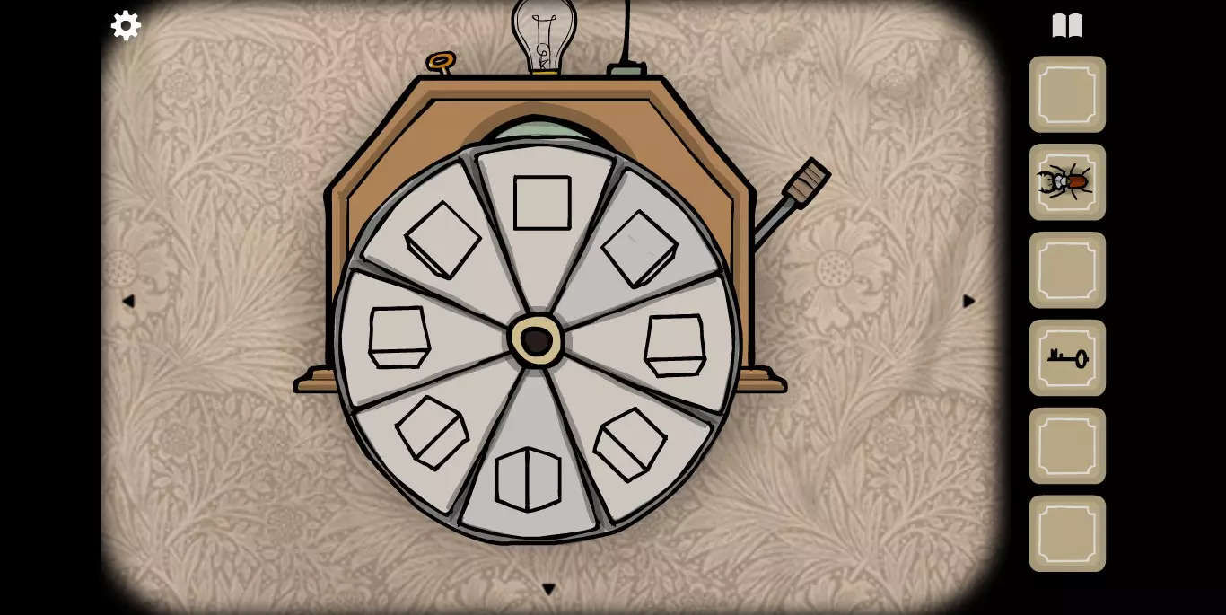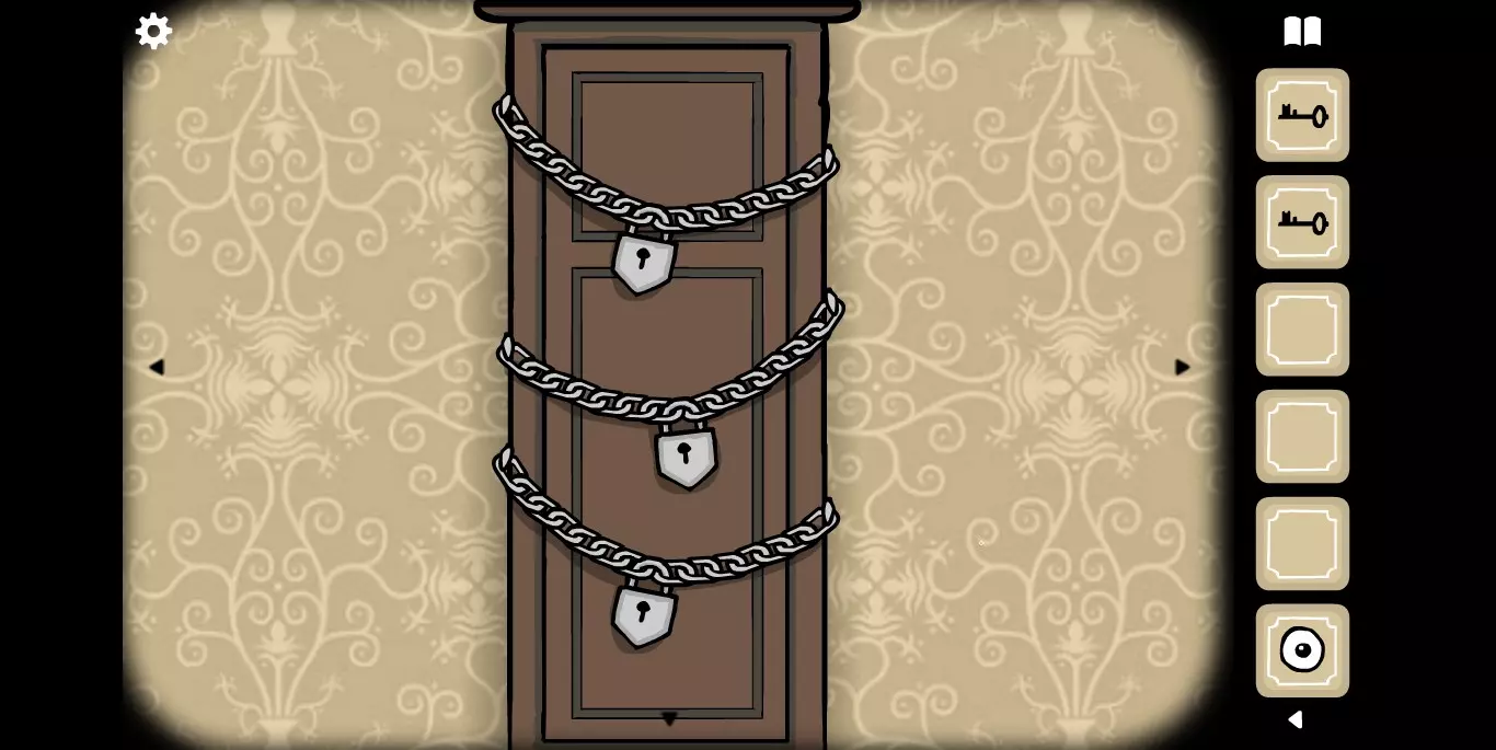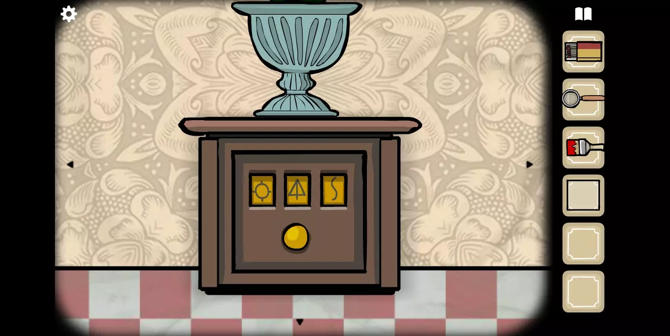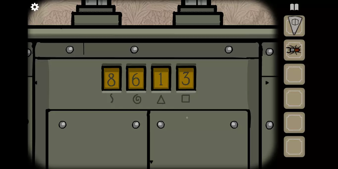 在大厅里还有一个细节需要注意,MROWL照片的下方有一个密码箱,需要五把插入顺序正确的钥匙,每个钥匙对应一个图标。在这里记得这件事情,涉及到与其他锈湖系列有关的秘密。然后直接走向电梯,去1楼。