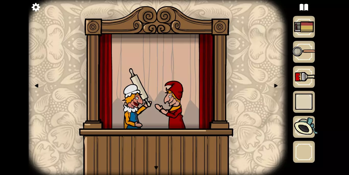 挂钟指针指向对应位置后会敲响,并掉落一个擀面杖。拉开左侧的幕布,里面有两个小人,将擀面杖递给左边的小人,让其敲打右边的小人。