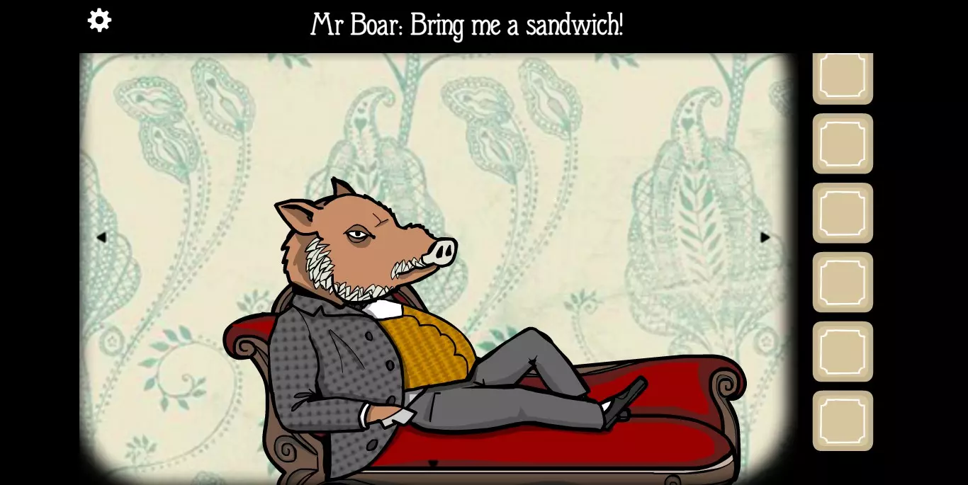 在这个场景的右侧柜子上拿到厕纸。拉开帘子递给MRBOAR,他就会从厕所里出来。再次寻找又能得到【SHIT】。继续用【SHIT】、生菜和面包制作三明治,这样反复三次之后,MRBOAR会开始便血。