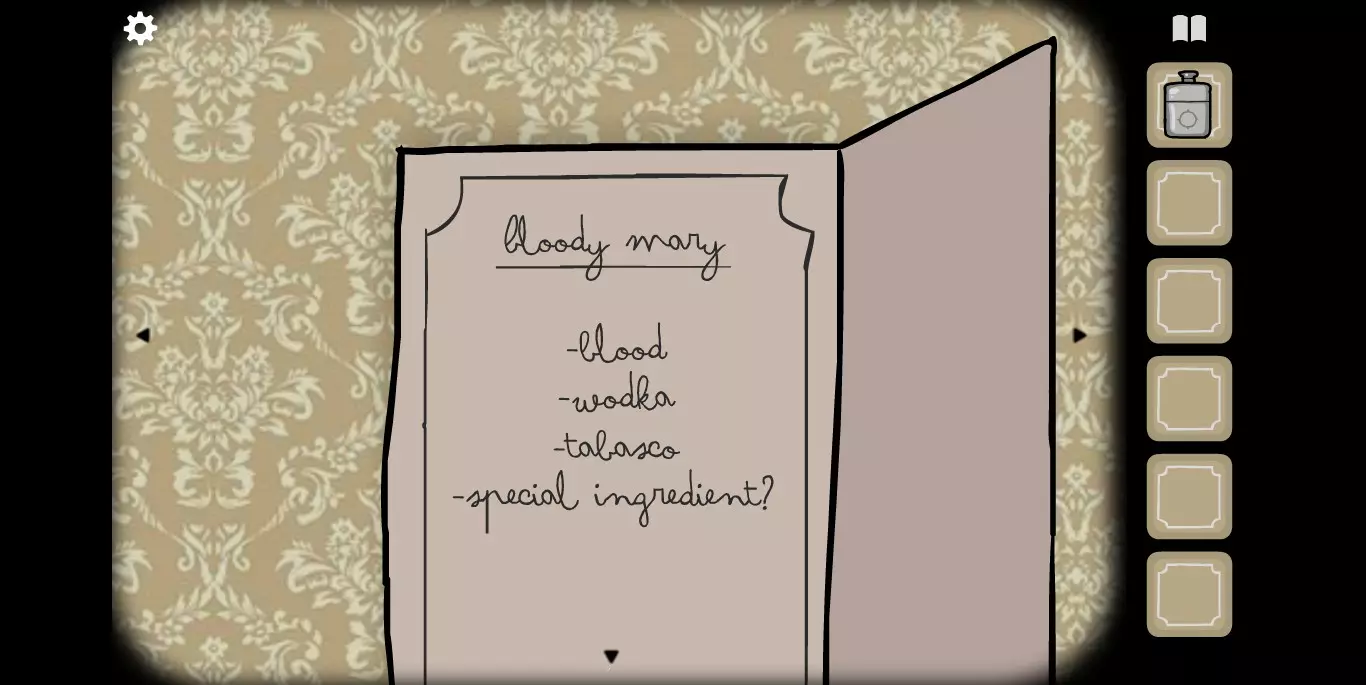 右手边的柜子上有一个竖着的纸卡,上面写的是【血腥玛丽】需要的材料,分别是【血】、【伏特加】、【塔巴斯科辣椒酱】和一些奇怪的东西(毒药)。