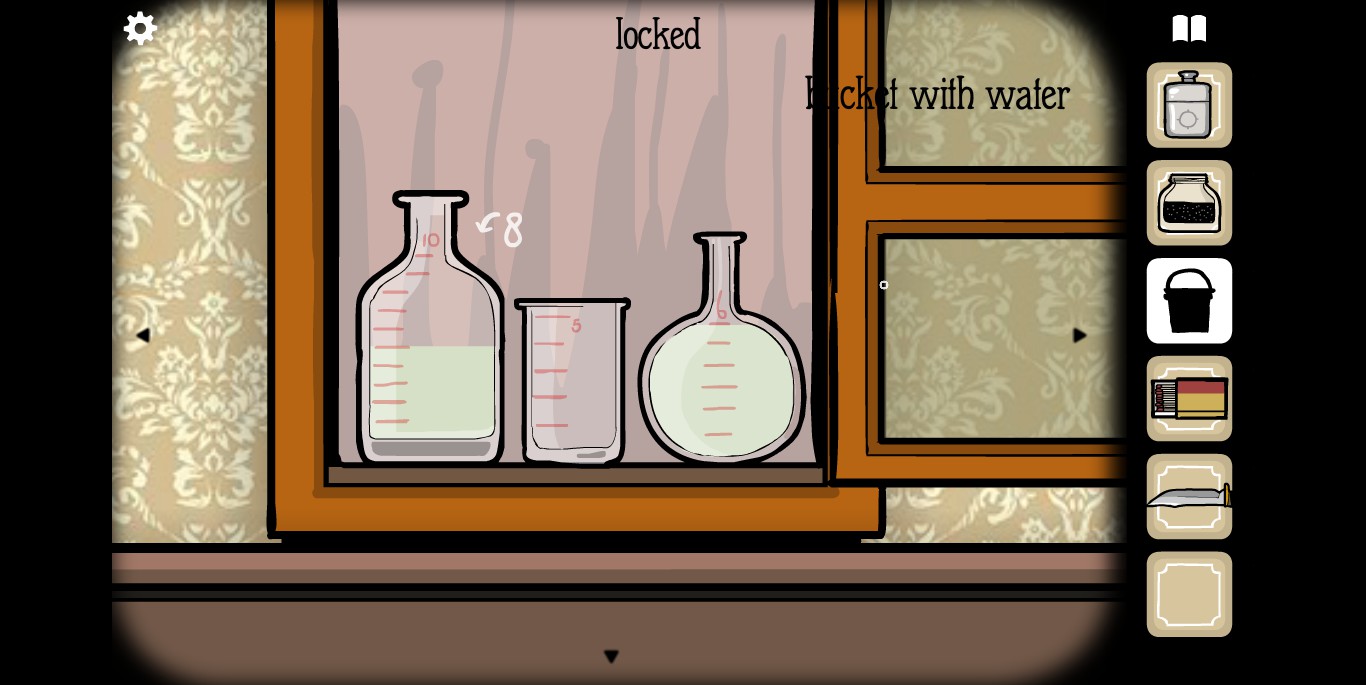 用钥匙打开玻璃柜,并用水桶里的水给烧杯注水。反复调换烧杯,获得8毫升的水。左、中、右三个杯子初始水量为左5、中0、右6,倒水顺序如下:右→中、中→左、右→中、左→右、右→中、中→左、右→中、左→右、右→中、中→左,此时左边的杯子里即为8格水量。
