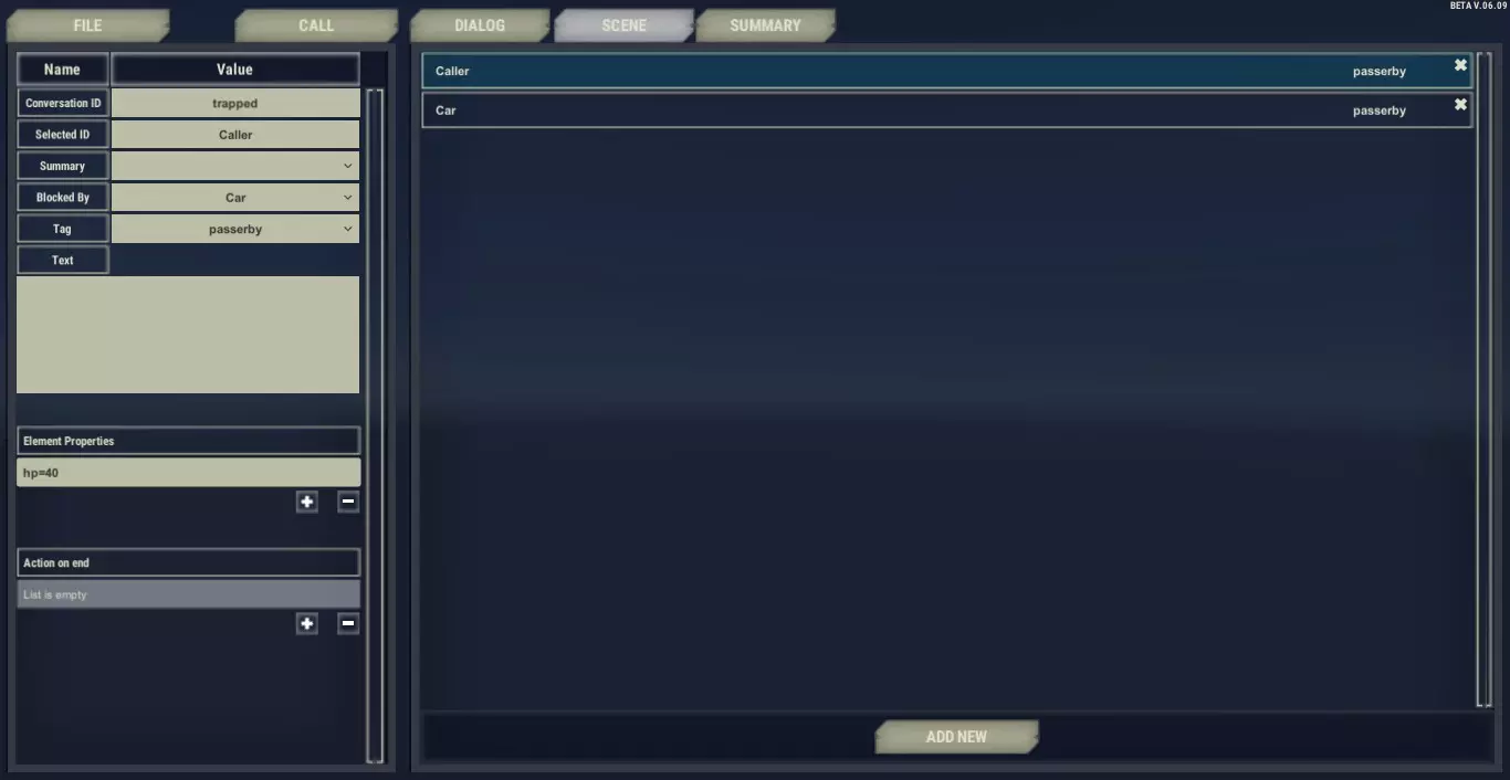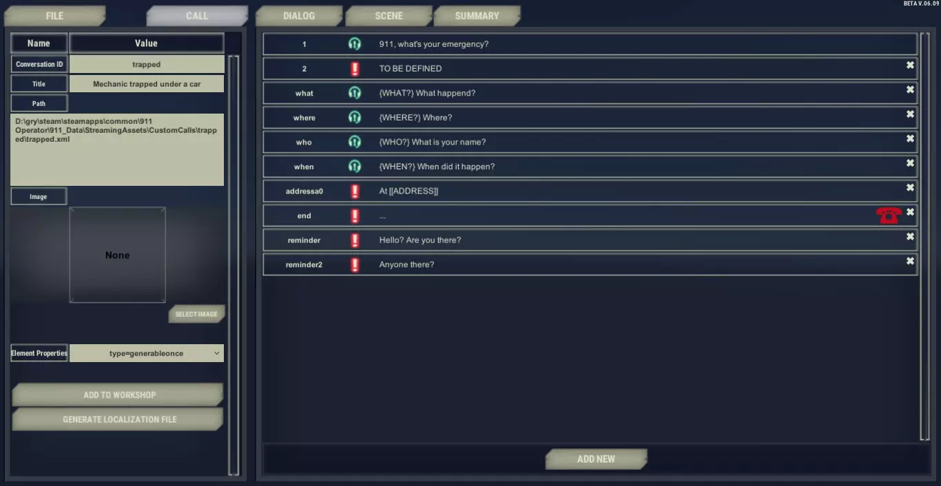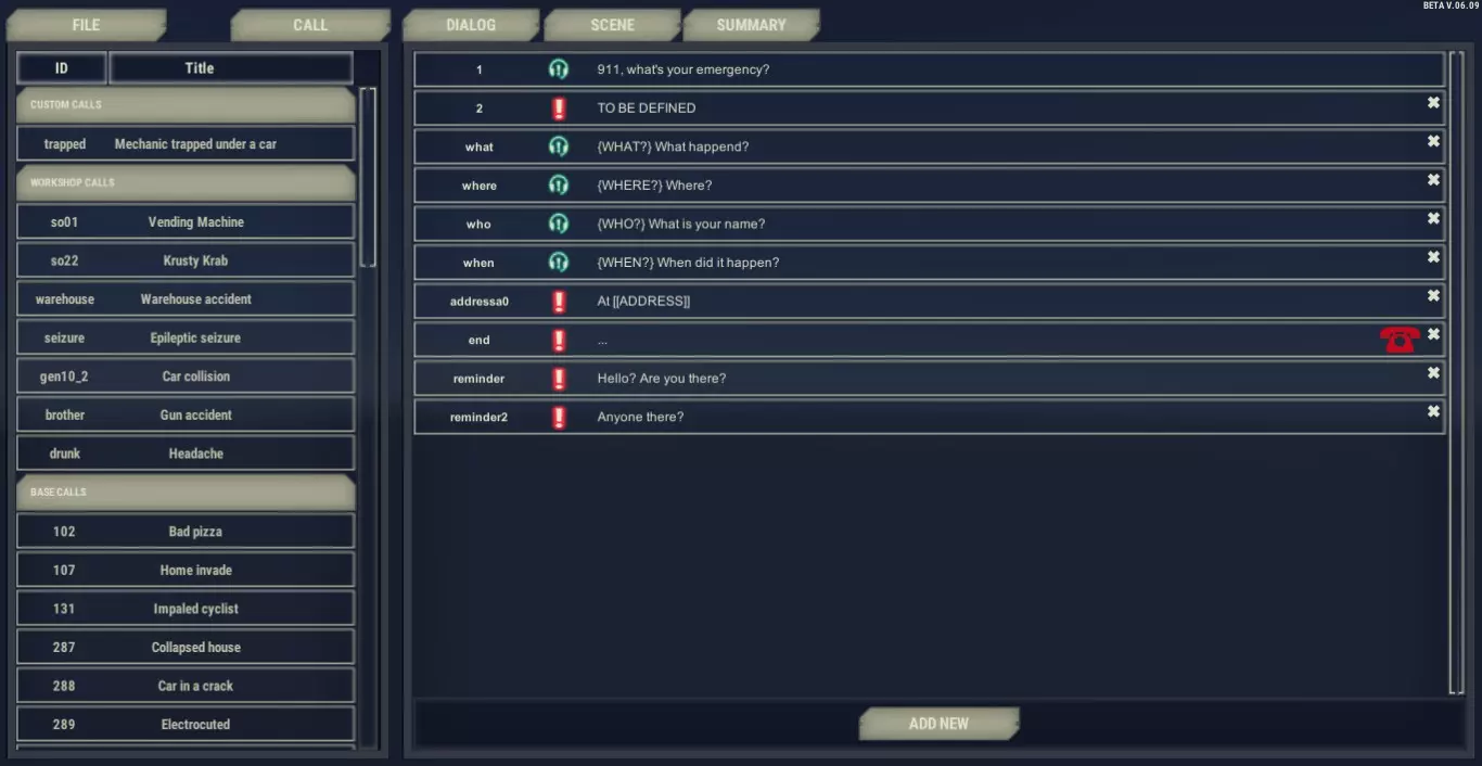 Text version of the tutorial: Here is quick instruction how you can make your first simple call. Let’s create a short call about a car mechanic trapped under the car. He can’t breathe, which makes the dialog short and allows only for a few questions. After launching the editor click FILE button Select NEW Now, you need to set short, unique ID name of this call (not displayed in the game) and its more descriptive title, which is visible for player as a name of the incident. It should be one word without spaces. DO NOT USE CAPITAL LETTERS! Write “trapped” as ID of the call and “Man trapped under the car” as a title. We added basic template with most common questions to help you with starting writing your own call. Click option ID 2 with red exclamation mark. This means that it’s caller dialog option. Go to the left and click in the box described as TEXT. Write there: “Help, I can’t breathe!” Add new option and write the response: “My… car… my car fell on me…”. That’s option should be spoken by caller. But we can see green operator icon next to option id. That is why we have to change the speaker. On the top left you can see “Speaker” dropdown. Click and choose caller. Now we will add some transitions. Select the first option with id what (“{What?} What happened?’”). Go to Element Properties and click ADD DIALOG TRANSITION. Click on the option with id 3 (Help, I can’t breath). You can check the linking by clicking on any of them: green highlight is showing next option and red stands for the previous one. Let’s connect the address now. Click on option id “addressa0”, go to text box on left. You can edit the text, but make sure that you won’t delete [[ADDRESS]]. This will be replaced by text address provided by action “actionSetLocation”. You can see it below, in Action on end panel. Add another option with id:4. Change speaker for Operator and write “The help will be there soon!” in Text box. Click on the option id 3 and link it to the option id 4. Let’s add the last option. Click on option ID “end” and modify the text for “Okaaay. . . . . .” This will be the last dialog option but we still have to connect it using transitions to option id 4. Click on the option id 4 and add transition to id “end”. Now we can check if all the options are linked. As you can see we didn’t use options id “Who” and “when”, they are not connected anyhow. That is why we need delete them. Delete the unused options using cross icon on the right. The text of the dialog options is finished. Now, go to Scene tab. Click on “sceneElem_1” This element will be our trapped man, so put Caller as a description in the text box. Change his tag to the injured and set level of his health in the element properties by clicking plus and writing hp=40. We also need to determine his gender: in this case click plus in the Element Properties and type sex=M. Let’s proceed to the third part of the editor called summary. Here, you can determine what player can see in the summary in the description of this call. Click “story_1” and write: “The man lost his consciousness”. Go back to the Dialog tab in order to determine which option will activate that piece of the summary. Select option with id end, go to the top of the left panel click Summary and choose story_1 from the dropbox. Congratulations, you’ve finished your first call. Click on the FILE button and click SAVE. Now, you can test it in the game by pressing “~” during a duty and entering “startcall trapped”. Good practices ID names: We recommend using short, descriptive word as an ID. Numbers are difficult to handle when the dialog is a bit more complex. For Example, use the id “where” for a dialog option “{WHERE} Where are you sir?” “end” option: An option with an ID “end” will be displayed if there are no more options available. It’s a good idea to put “end” option in a dialog as a rescue wheel: in case of an error in transitions between options, when there are no more dialog options and no “actionHangup”, the game won’t freeze, but it will display “end” option. Ending the dialogue: The last option should be spoken by the caller, because as a rule 911 operator stays on the line until a caller hangs up. Address: A player should have a possibility to ask about the address as often as it possible during the dialog - usually he should to that at the beginning anyway, but allow him to choose otherwise. Advanced Dialog Creation Transitions In order to make a dialog transition: 1) Click on the dialog option 2) Click ADD DIALOG TRANSITION on the right 3) Select dialog option By using ADD DIALOG TRANSITION you’re choosing the next option in the dialog. If you add transitions to more than one Operator’s options, a player will have a choice between them. Dialog option abbreviation While writing operator’s lines, you can prepare a short version of the dialog option, which is displayed for the player at the dialog option’s BUTTON. When player chooses that option, the full version will be displayed. In order to make an abbreviation of dialog option, put the short version of the text in curly braces before the first sentence. Example: {HELP HIM} He might have a heart attack. Don’t be afraid and help him! Good practices for dialog option abbreviation: Keep the sentences in curly braces short Abbreviation should be short version of operator’s words, NOT the description of operator’s actions. "Back" as a dialog option"Back" option allows you to display options from two steps back in your transition path. If you add “back” option after caller’s answer, it will add all remaining options from previous Operator's line. That function is very useful for creating small branches of the dialog. For example, use “back” option after obtaining the address, because after that you might want to go back to any part of a dialog. Call TypesThere three type