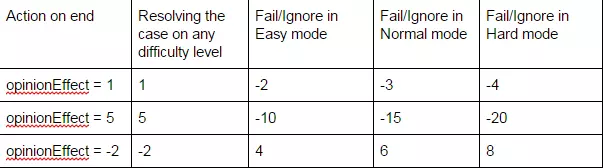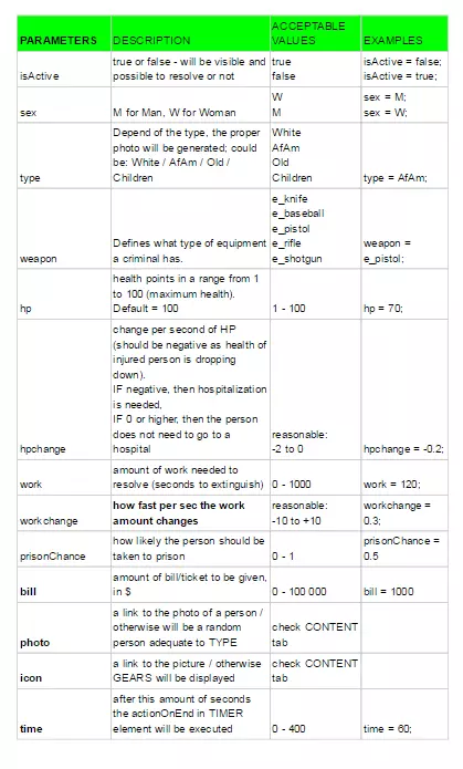 You should set the negative value as opinion Effect if the call is irrelevant (like prank call) and a player should get the reward just for ignoring it. If the opinionEffect has been already set in a call, you can modify it by using + before = eg. option id:1 opinionEffect=5 option id: 2 opinionEffect+= 2 Summary: opinionEffect = 7 If opinionEffect wasn’t set during call creation, it has a standard value: 3. onIgnore If you want to have a different value for ignoring or failing to resolve the case than the opposition of opinionEffect, you can use onIgnore functionality. OnIgnore is also used in Action on end column. It allows you to set any value for ignoring the case. It should be used along with opinionEffect for setting a number of reputation points for positive action. e.g. opinionEffect = 2; onIgnore = 5 onIgnore is also modified by difficulty level, exactly the same as opinionEffect: 2x in easy mode 3x in normal mode 4x in hard mode Modifying scene by “action on end” Action on end functionality allows for editing the scene elements during the call. You can put a modifier in every dialog option using Action on end section. In order to do that: 1) Choose dialog option 2) Click + under Action on end 3) Write proper parameters in scheme: <ID element on scene>.<parameter><= OR +=<value> You can modify every parameter described in Scene section. Here are examples how to use that functionality: caller.hp=30 (For element on Scene with ID "caller" level of health is changed to 30) caller.hp += 30 (caller gains 30 points (added to basic value set in Scene tab)) caller.hp += -30 caller’s level of health is decreased by 30 points (subtracted from basic value)) caller.hpchange=+0.1 (from now on the caller will be gaining 0.1 points of HP per second) caller.hpchange=-0.1 (until now caller will be losing 0.1 points of HP per second) caller.hpchange+=0.1 (until now caller will be gaining 0.2 points of HP per second added to the basic value set in Scene tab) Speed You can also set parameter Speed in Action on End panel. In that case, you don’t need to choose specific element on the scene, but just set the value and whole scene will start moving. eg. speed = 80 Dialog options and scene elements availability The game allows for setting availability for any dialog option or scene elements. It means that you can hide some parts of the dialog and activate them in some circumstances occurs (e.g. player choose proper dialog option). There are two ways of doing it, slightly different for dialog options and scene elements. Setting the availability of dialog option You can also set the availability of dialog options from the dialog itself. Thanks to that, you can enable or disable a branch of the dialog, depending on the player’s choices. To do that, you need to specify the ID of the dialog option, add “->active=” and specify if it should be active or inactive. By default, all options are active. For example: address->active=false in “actionOnEnd” section will disable the “address” dialog option from the conversation Setting availability of scene element Every element on scene can have active (default) or inactive status (invisible to a player). You can set it in parameters of the scene element (by typing isActive=true or false in Element Properties in Scene tab). But it also possible to change that statuss during the call. To do that, you need to specify the ID of the dialog option, add “.isActive=” and specify if it should be active or inactive. For example: caller->active=false in “actionOnEnd” section will disable the “caller” scene element Multiple dialog paths (generable calls) In 911 Operator you can find calls in which caller might say different answers for the same questions. In Call Editor you can set different caller’s options as a response to one operator’s option and the game will randomly choose of them. How to make a call with different variations of caller options: 1) Create a dialog 2) Create at least two different Caller options 3) Link all of them to the Operator’s question 4) Now the game will choose one of them randomly while playing a dialog Writing a call with different variations of caller options is much more difficult than writing a “normal” dialog. We recommend writing a few simple calls before making a call with different variations. Also, it’s worth to carefully examine calls from 911 Operator with “gen” in their IDs as an example (eg. gen18). Chance 1.You can modify the probability of randomizing the option by setting the “chance” parameter for the dialog option 2.Go to the option which you want more or less possible to draw. Go to Element Properties and write chance=<insert_value_here> The default value is 0.33. If you want to make option more possible set the larger number. Using the Search mechanic (SaR DLC) In Search and Rescue, we've added the Search mechanic that requires the player to find an object in a specified area. To enable the mechanic in your calls, enable "Searching" in the Call tab. Search Area determines how many sectors will appear - the number of sectors equals to a square of the number you've put in. It's best to keep the number between 2 and 9, although any number will work. Search Work determines the amount of work that a unit will have to do when sent straight to the incident, instead of checking sectors one by one. It should be bigger than the number of sectors multiplied by 6 (every sector takes around 6 seconds to clear, and checking them manually should be more effective), for example - if you set Search Area to 5, it means that there will be 25 sectors. 25 times 6 is 150, so Search Work should be set to more than 150. In the next step, go to the Scene tab. In order to make an element searchable, put "toSearch" in its properties. Not all elements on the scene have to be searchable, for example - if the Caller reports a thief on the run, only the thief is supposed to have "toSearch" in Element Pro