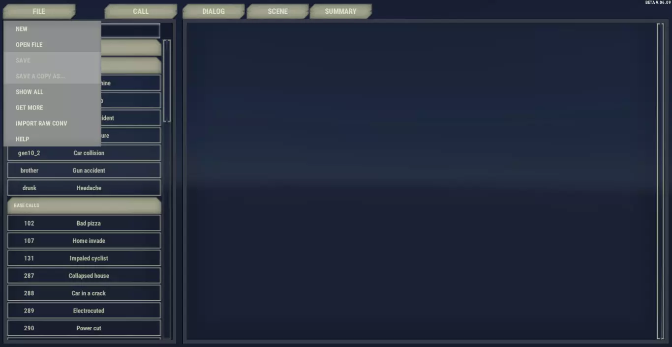左上角: 文件 显示以下选项: 新建 创建新对话, 打开文件 打开包含对话的.xml文件, 保存 保存当前工作, 另存为... 不想覆盖原文件时保存副本, 显示全部 查看游戏副本中所有可用的通话, 获取更多 打开创意工坊并允许下载新内容, 导入原始对话 允许打开从谷歌表格导出的文件(创建通话的旧方法), 帮助 打开通话编辑器的文档。