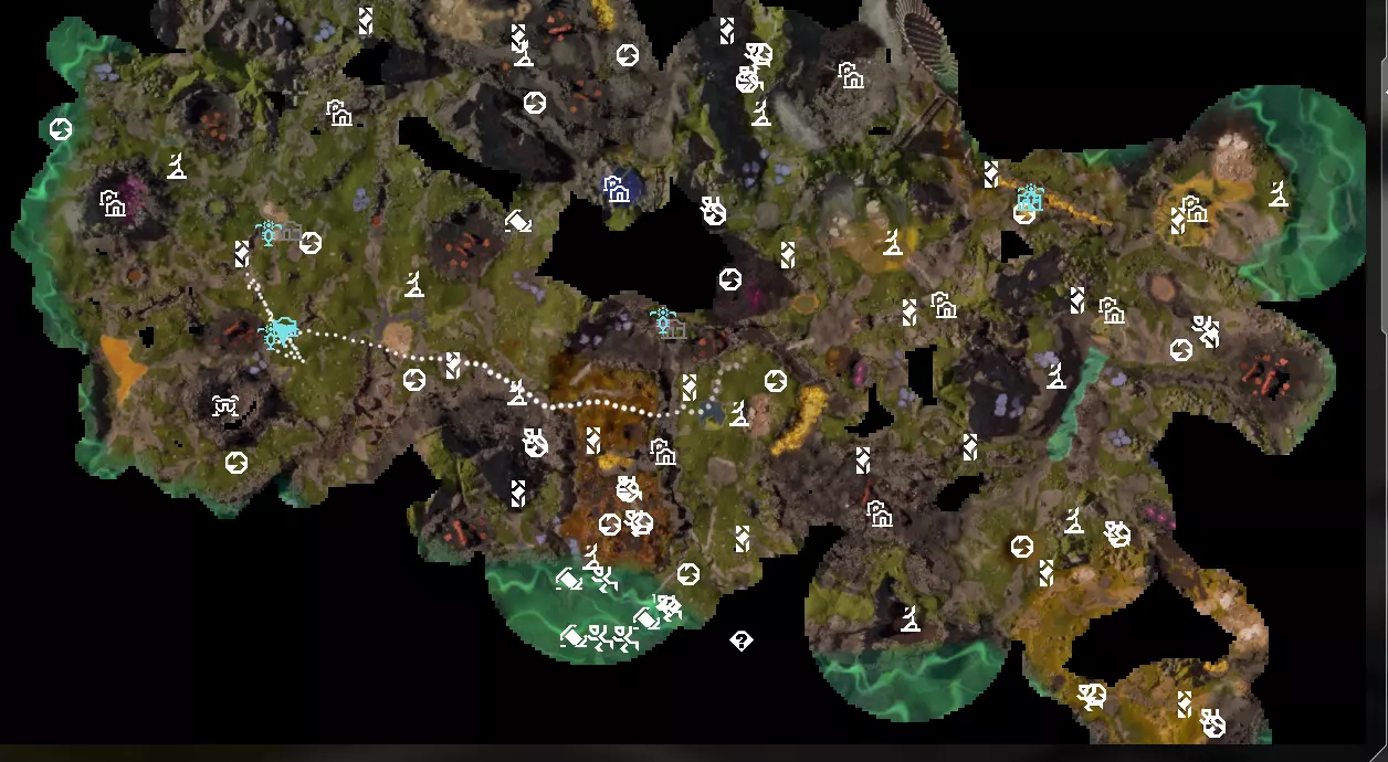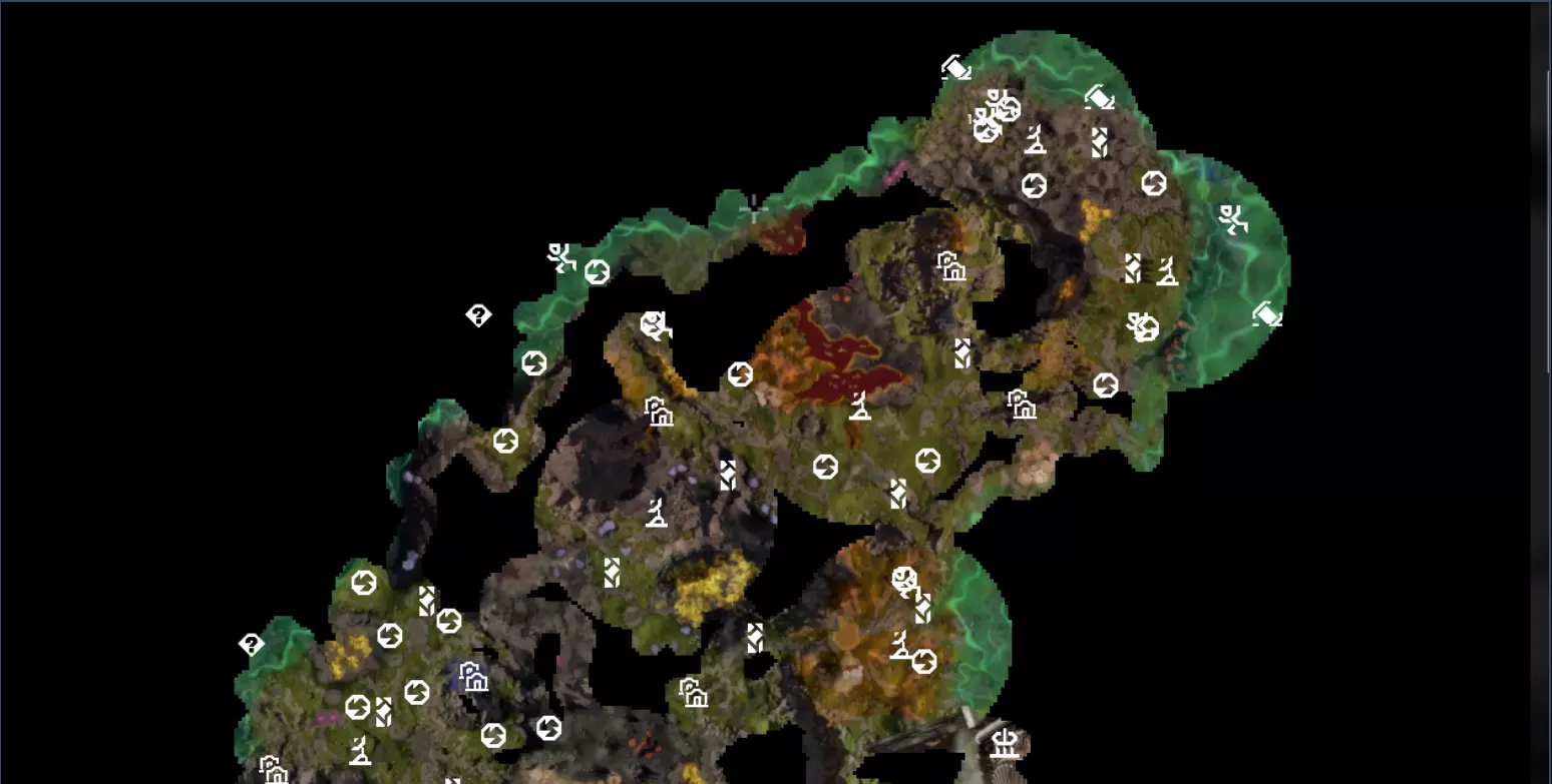 这是游戏通关后包含所有兴趣点的地图 抢先体验版游戏地图 这是一张已探索所有兴趣点和资源点的地图截图,如果你正在寻找合适的基地建造地点,或是想查看兴趣点的位置,这张图或许能帮到你。