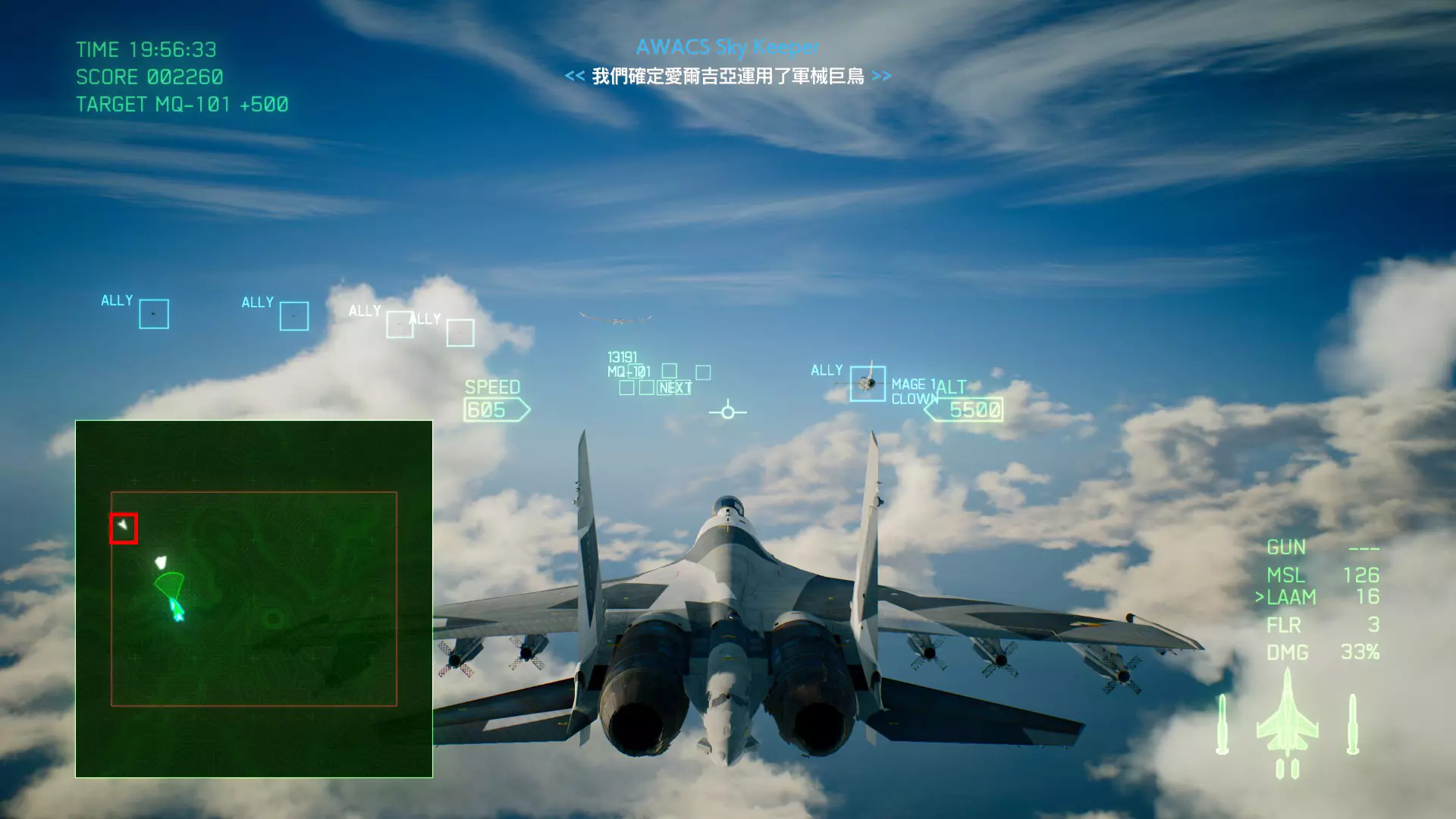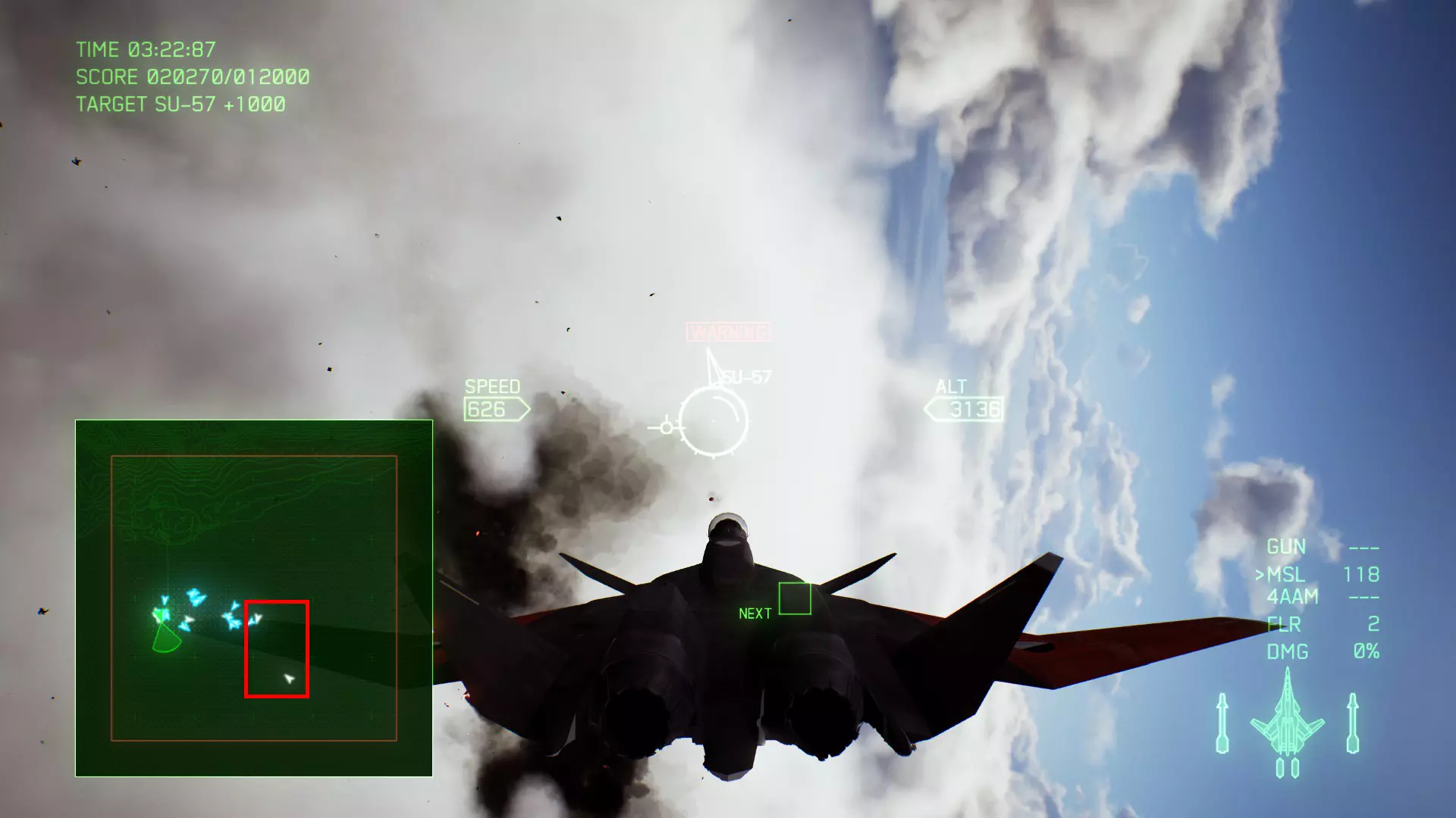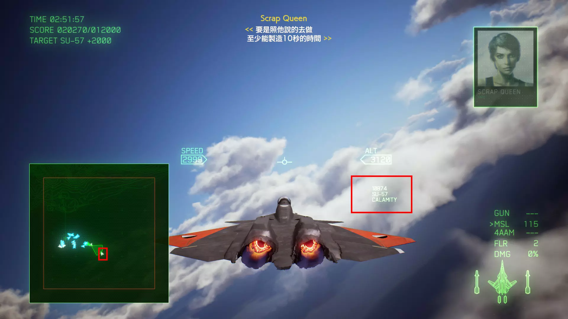 冠名机 第十九关:【灾难】【风暴】 本关共一架冠名机:SU-57、F-22A SU-57方法:第一阶段时击破分达到20000即可,冠名机会在地图中部出现。