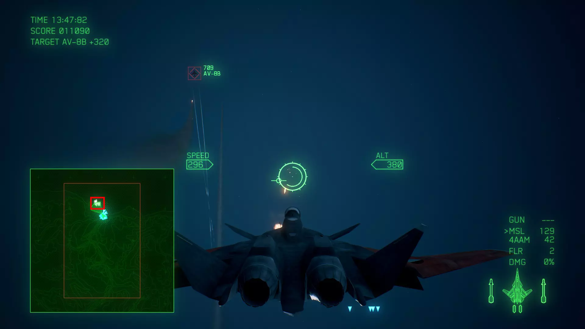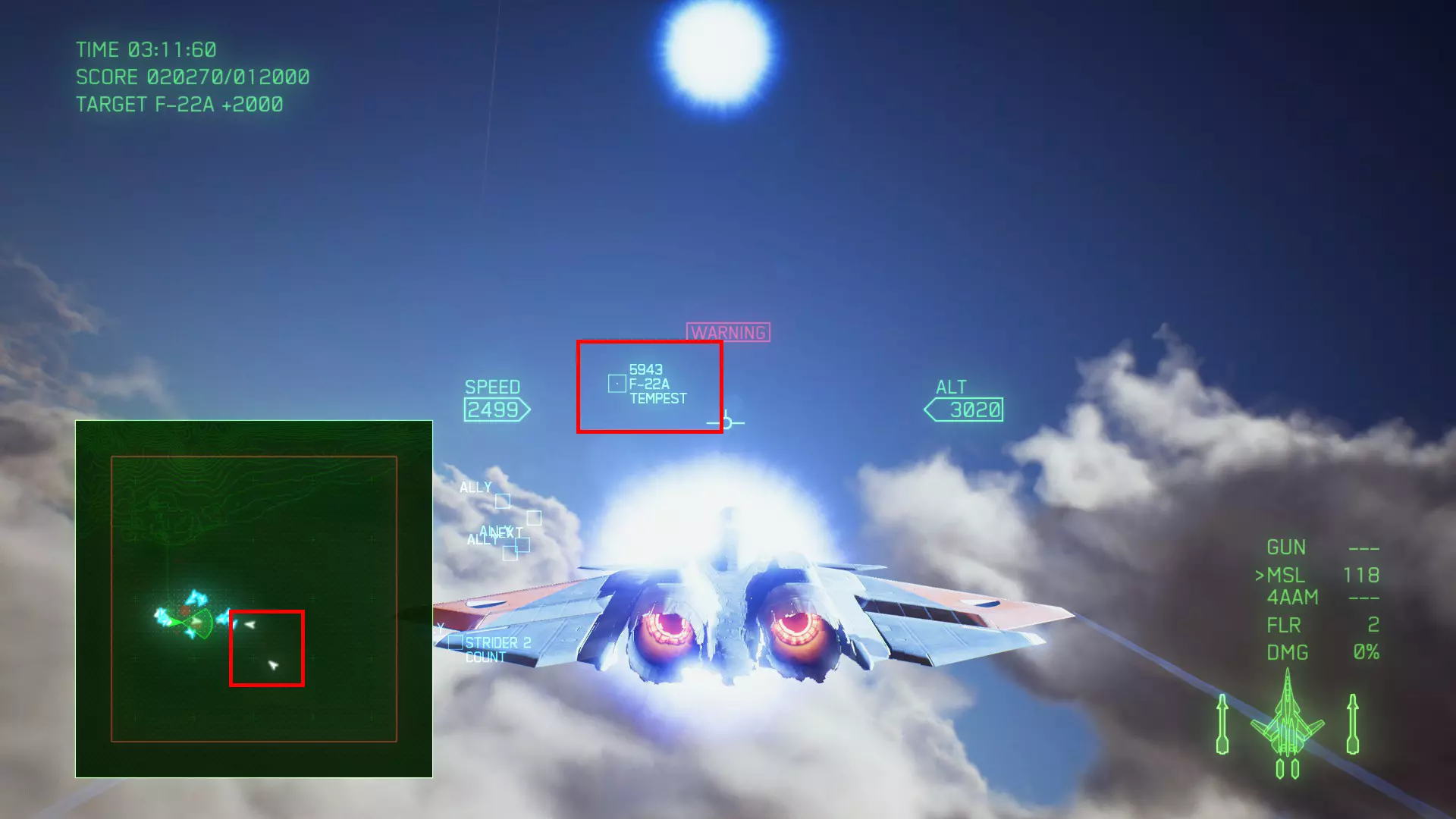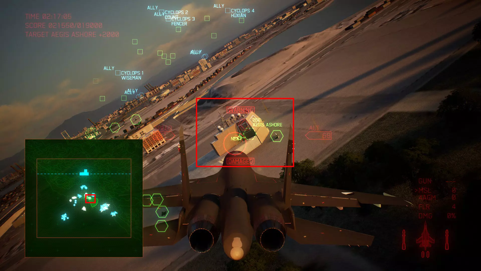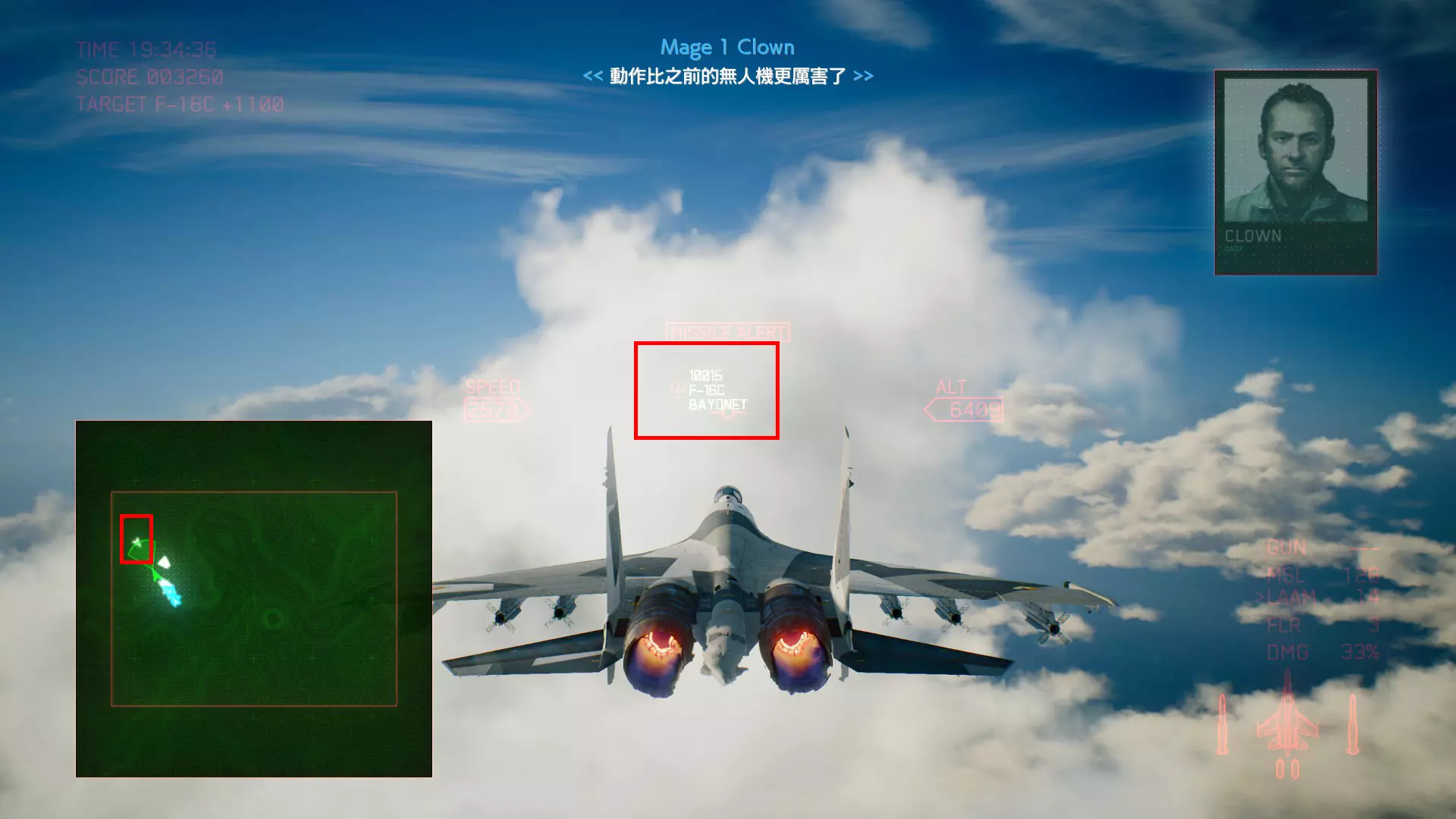 冠名机 第三关:【BAYONET】 本关共一架冠名机:F-16C 方法:选择携带SAAM或LAAM等长射程特殊武器的战机(LAAM可轻松过关),在开局1分30秒内击坠敌方初始的8架战机,第二阶段开始后冠名机会与无人机同时出现在地图西北方(左上角)。