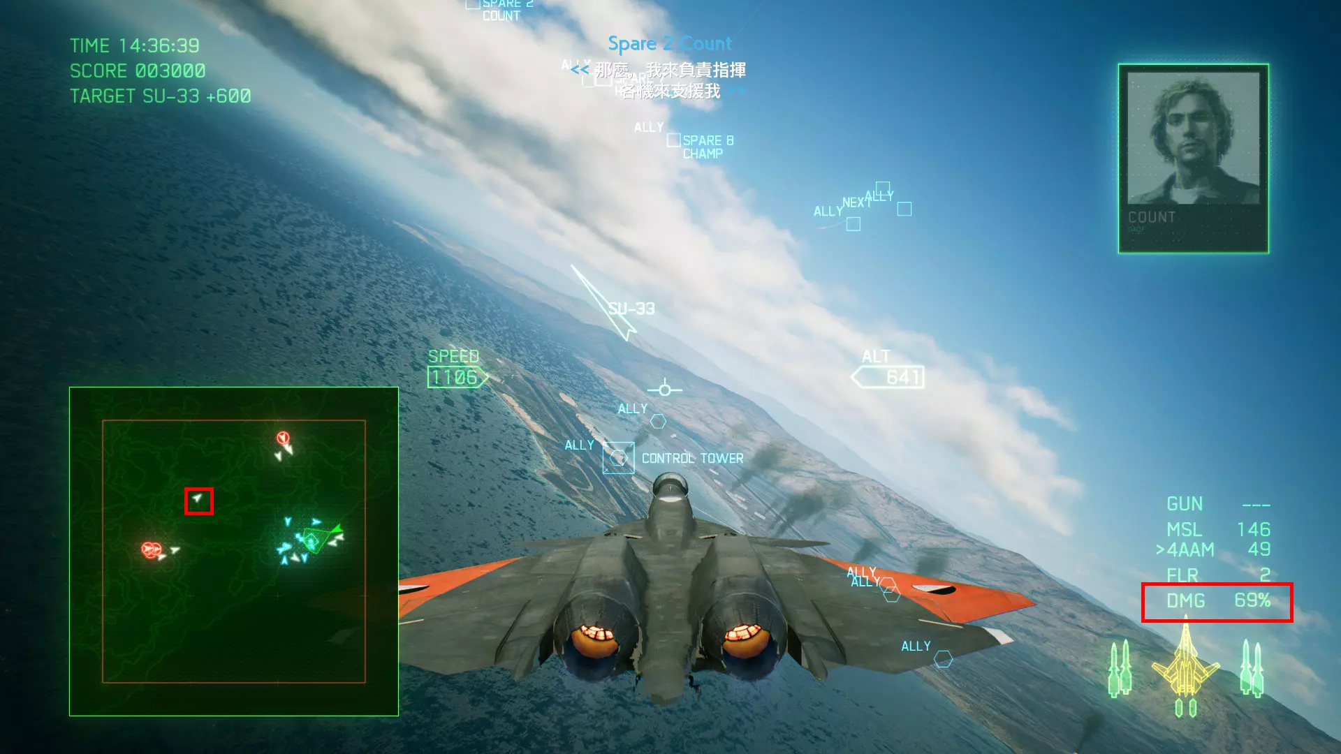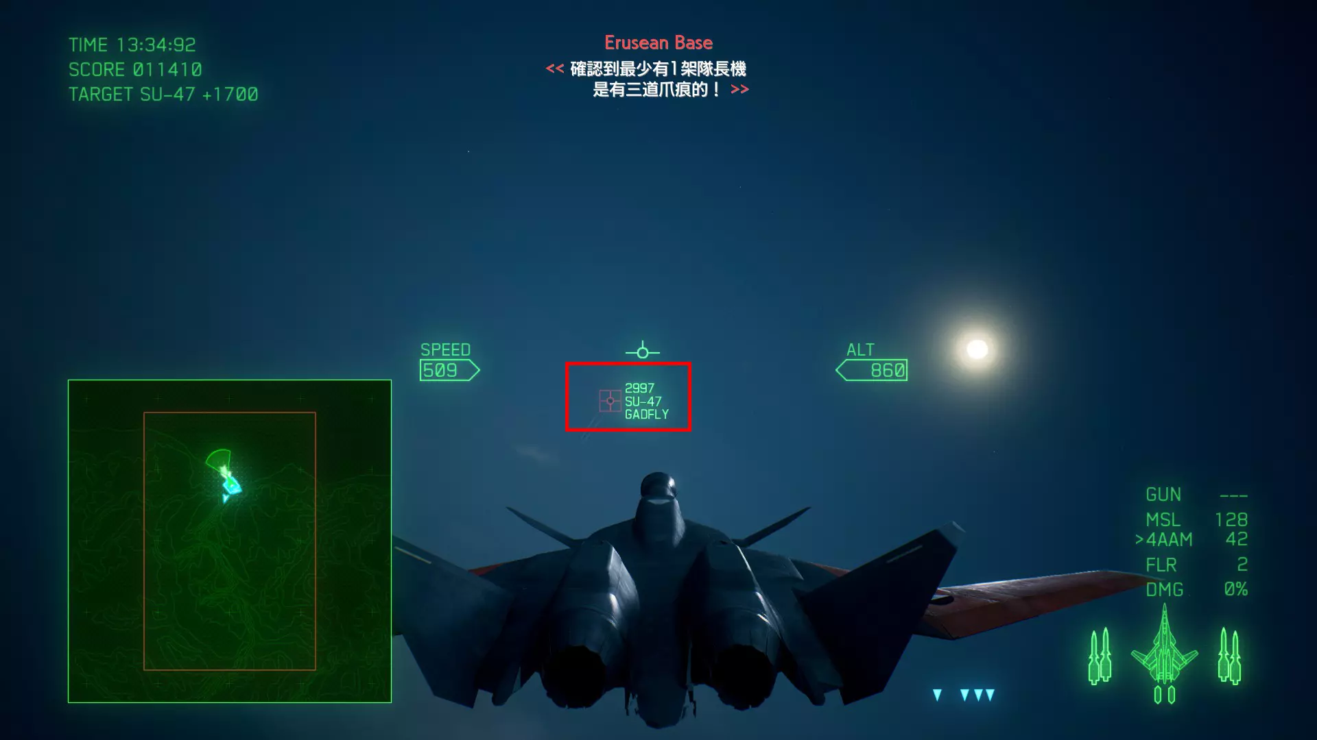冠名机地图位置 第十六关:【AXEMAN】 本关共一架冠名机:SU-35S 方法:击破分达到10000分以上,冠名机出现在地图的西北方(左上角)。需要先识别再击坠