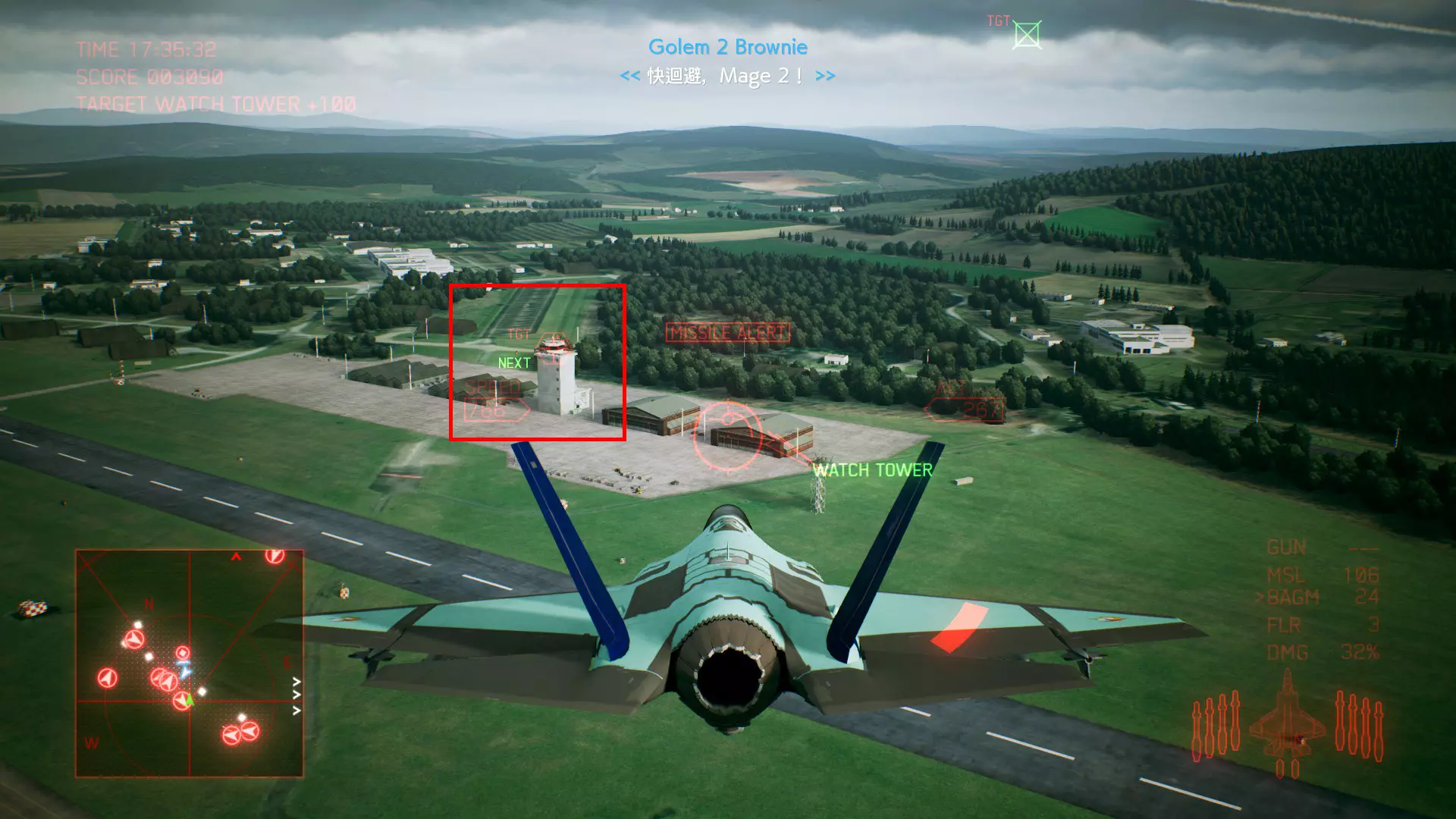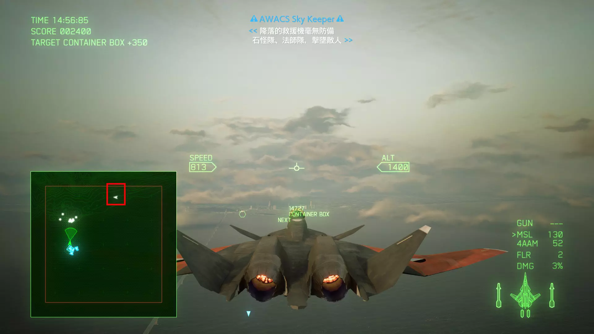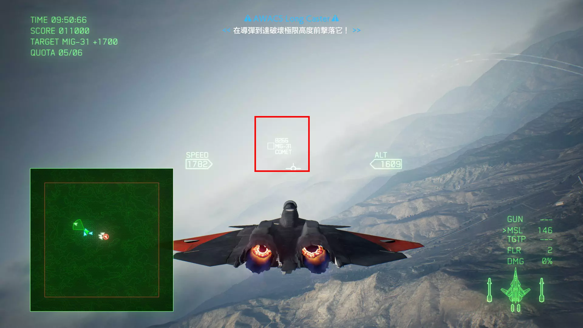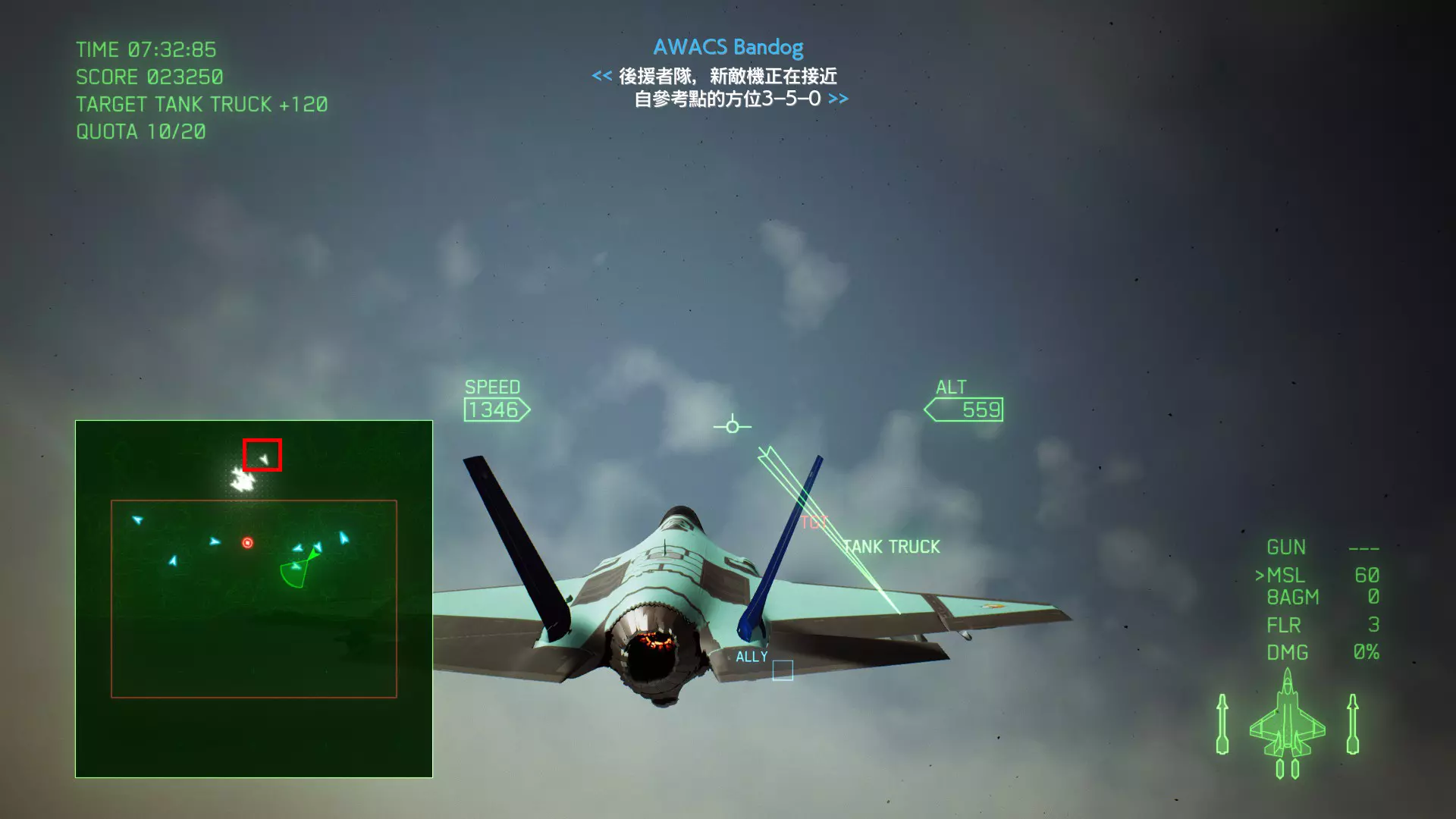 冠名机 第四关:【浪人】 本关共一架冠名机:F-15J 方法:以低于180的高度(ALT)突破敌方雷达网,第二阶段开始后冠名机会出现在地图北方向西飞行。(高度降下来后使用左右平移即可轻松突破)。