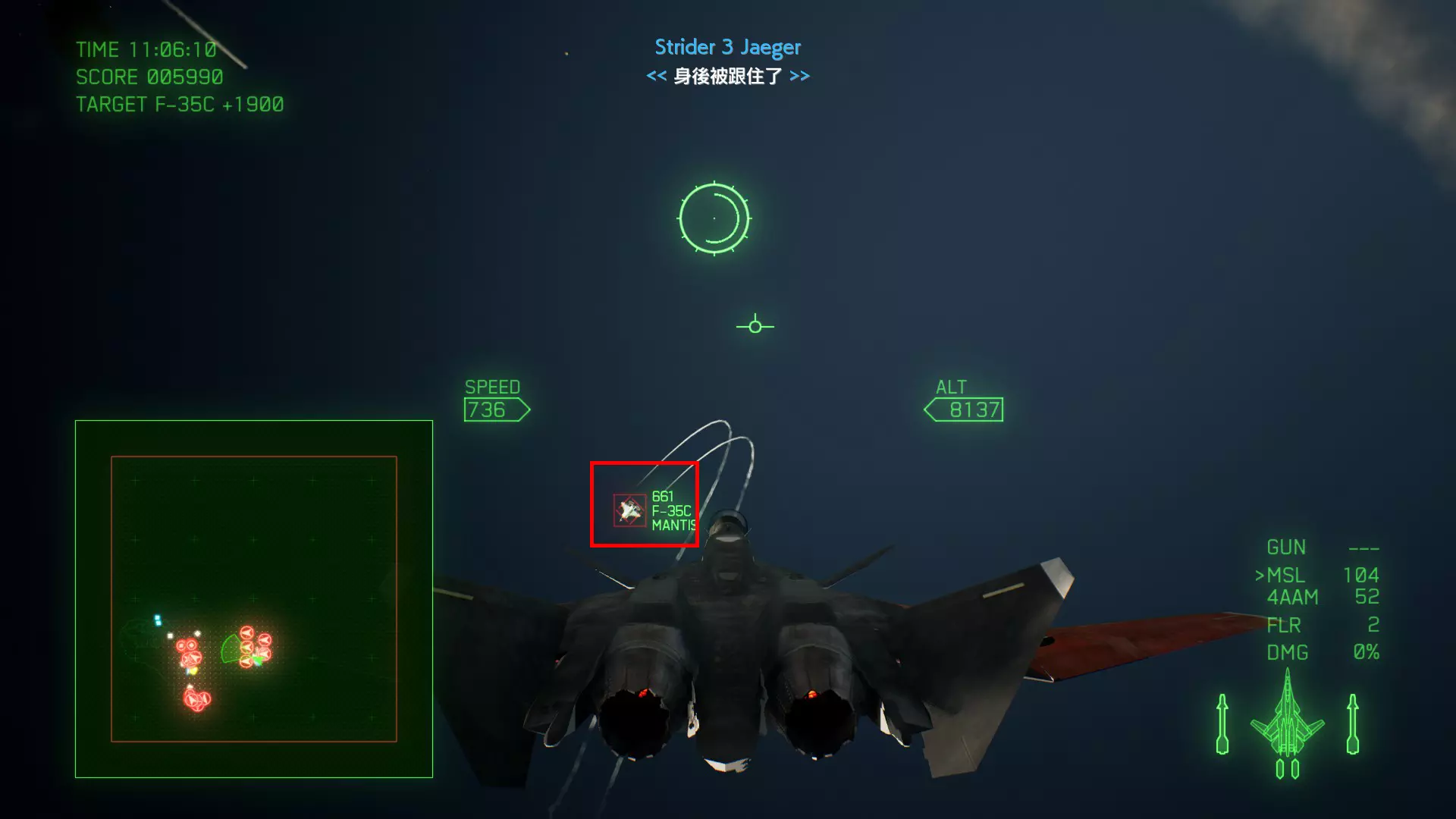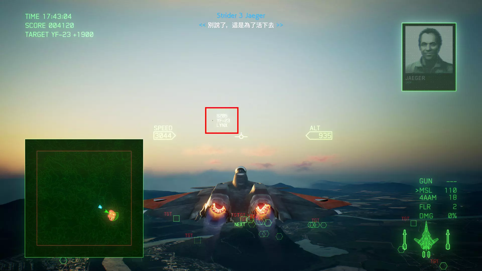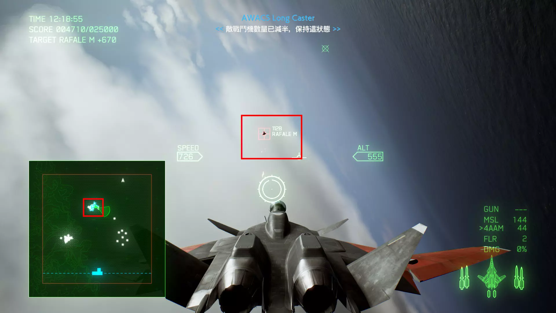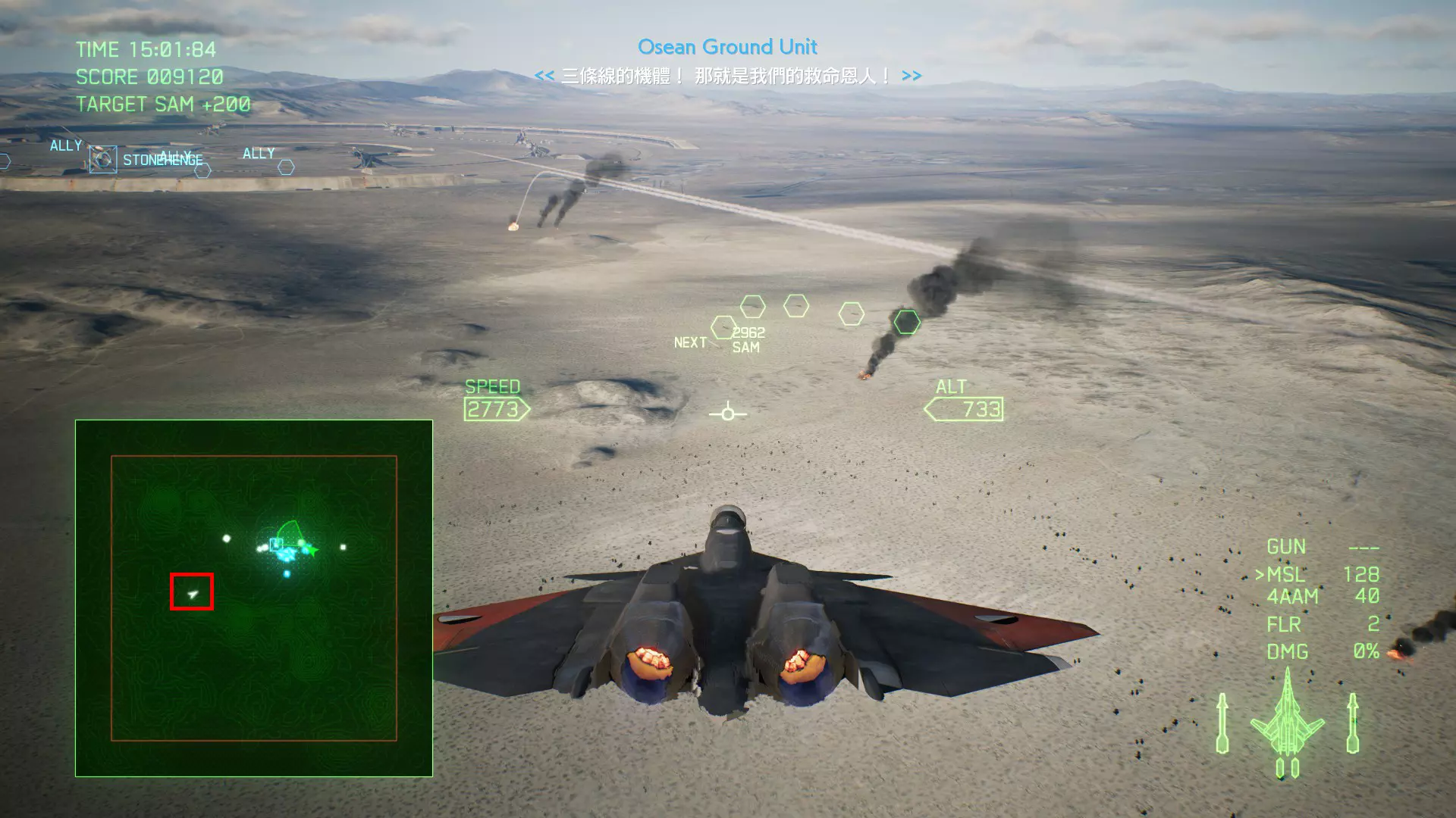冠名机 第四关:【浪人】 本关共一架冠名机:F-15J 方法:以低于180的高度(ALT)突破敌方雷达网,第二阶段开始后冠名机会出现在地图北方向西飞行。(高度降下来后使用左右平移即可轻松突破)。
