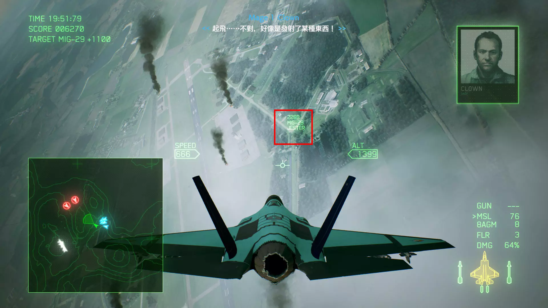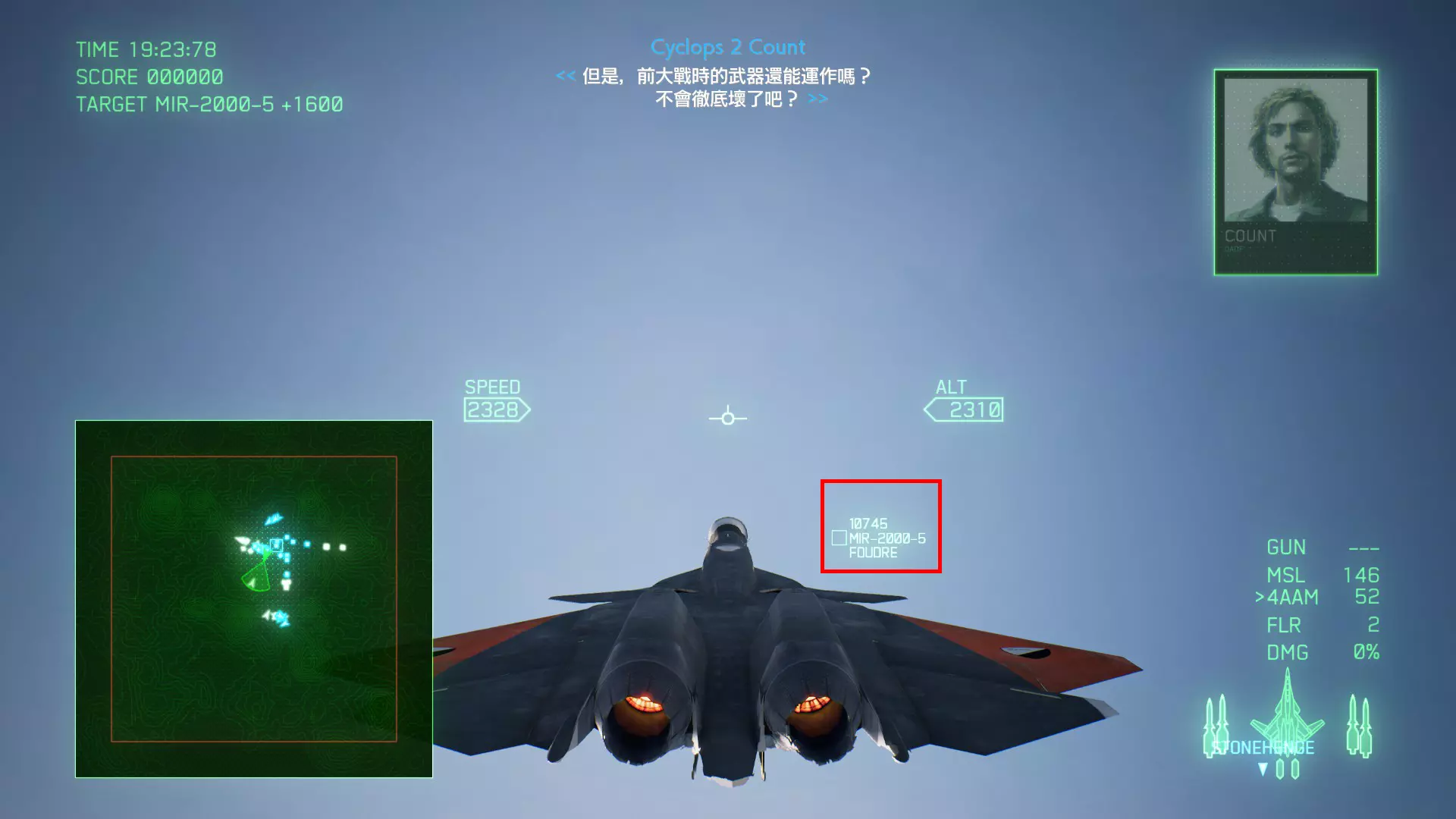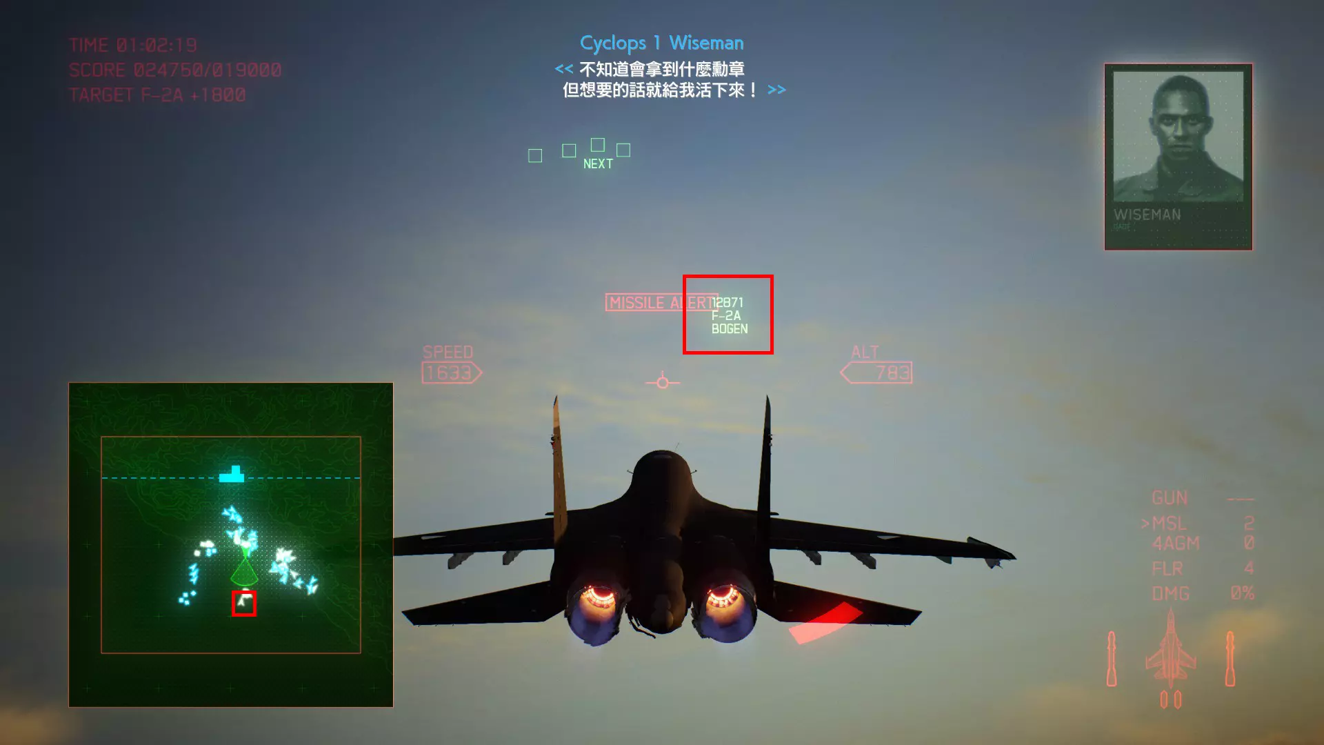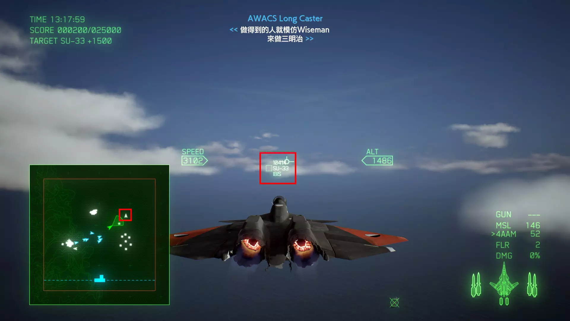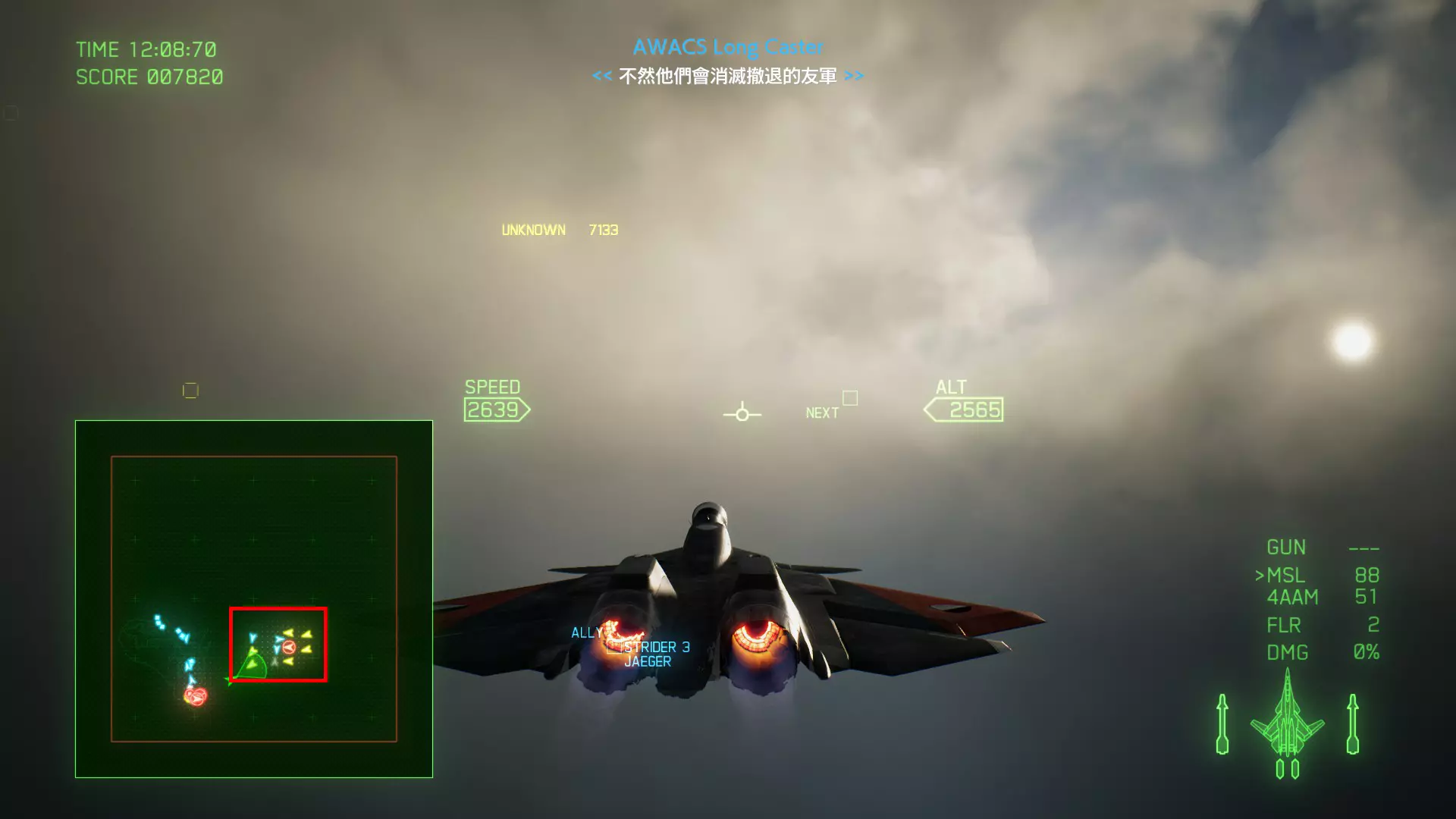 冠名机 第四关:【浪人】 本关共一架冠名机:F-15J 方法:以低于180的高度(ALT)突破敌方雷达网,第二阶段开始后冠名机会出现在地图北方向西飞行。(高度降下来后使用左右平移即可轻松突破)。