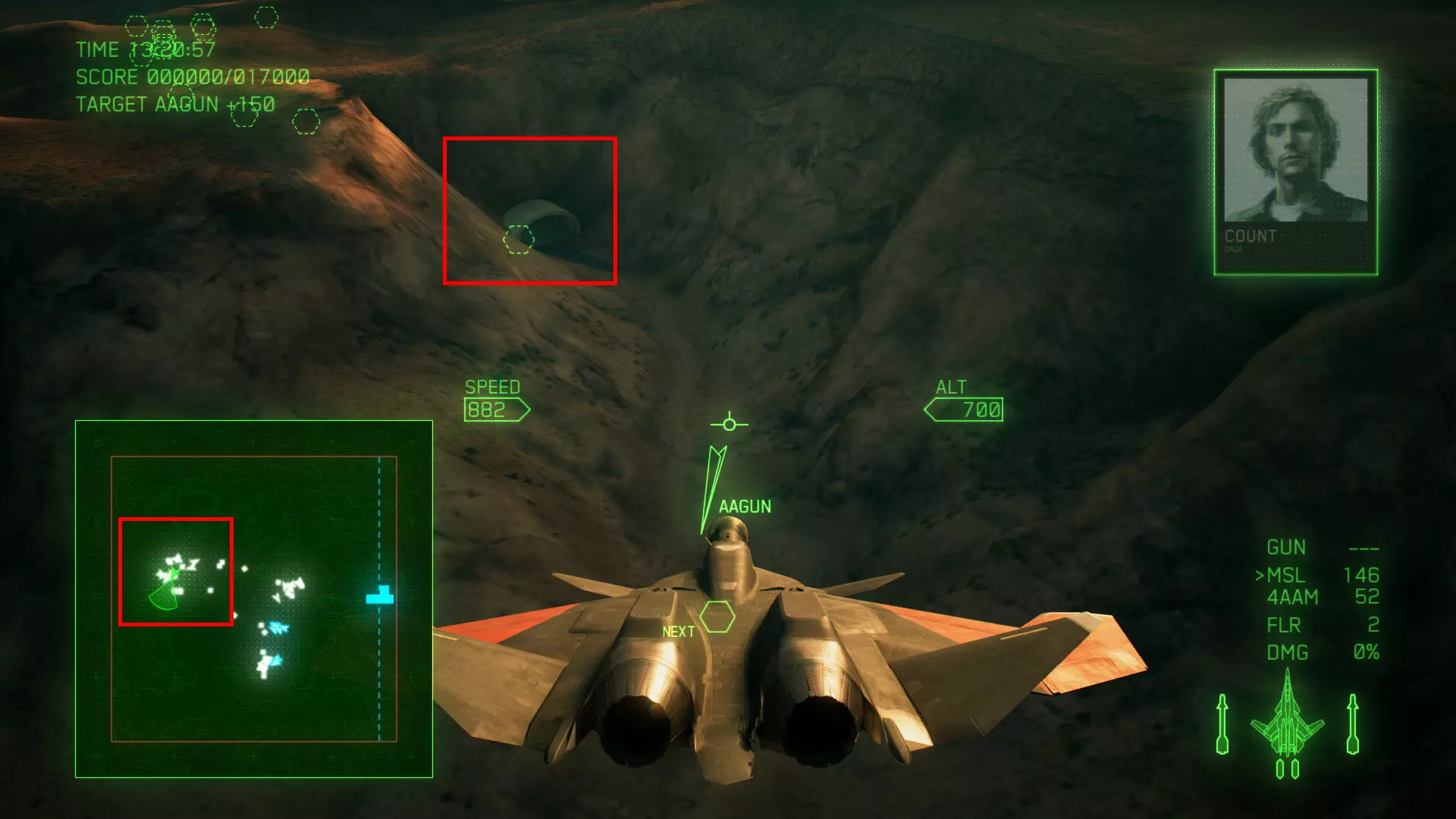 冠名机 第十四关:【GADFLY】 本关共一架冠名机:SU-47 方法:2分20秒内飞过峡谷区域(速度1000以上即可,多试几次,带触地减伤),穿过后,击破敌军地面部队及飞机,冠名机会与增援的战机出现在地图北方。
