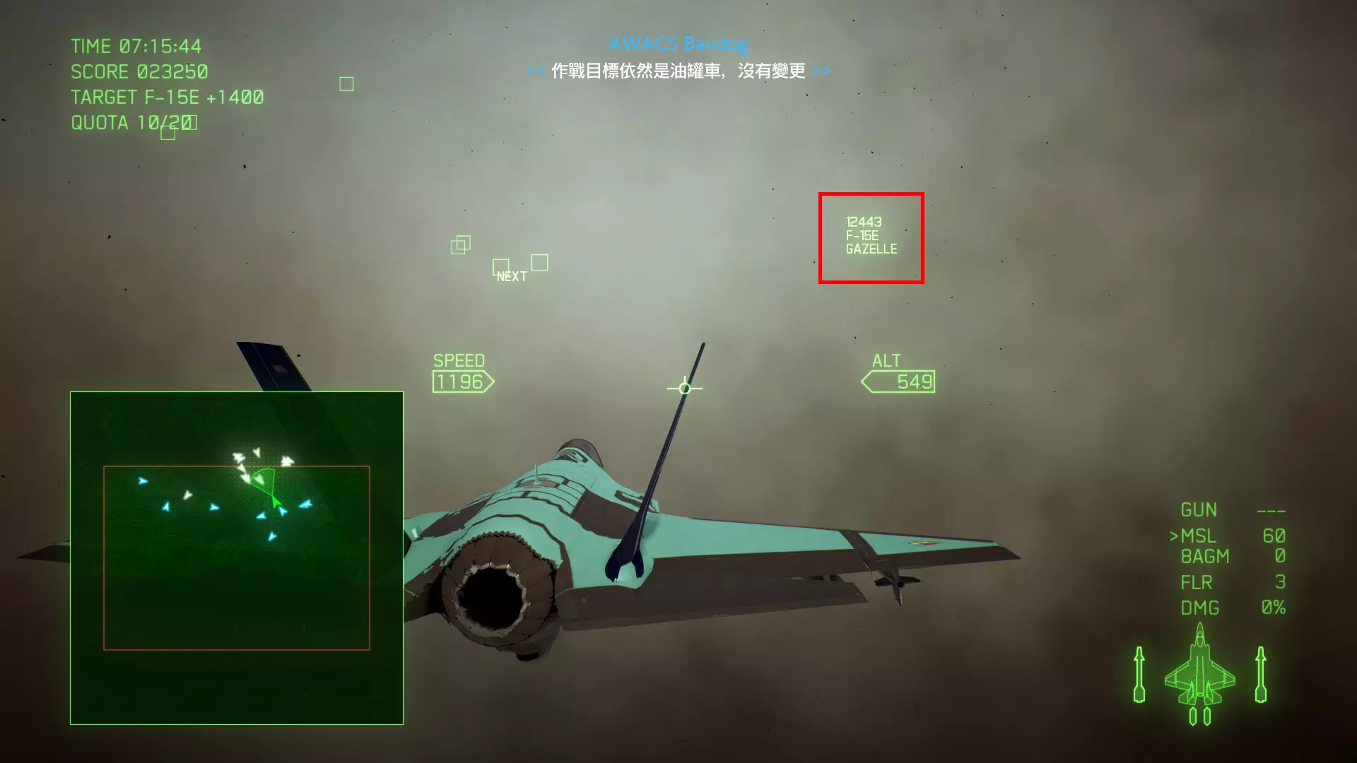 冠名机 第八关:【GAZELLE】 本关共一架冠名机:F-15E 方法:在第一阶段的5分钟内击破所有地上油罐,在第二阶段击破10个以上油罐车。冠名机会与无人机一起从地图北方向南飞。