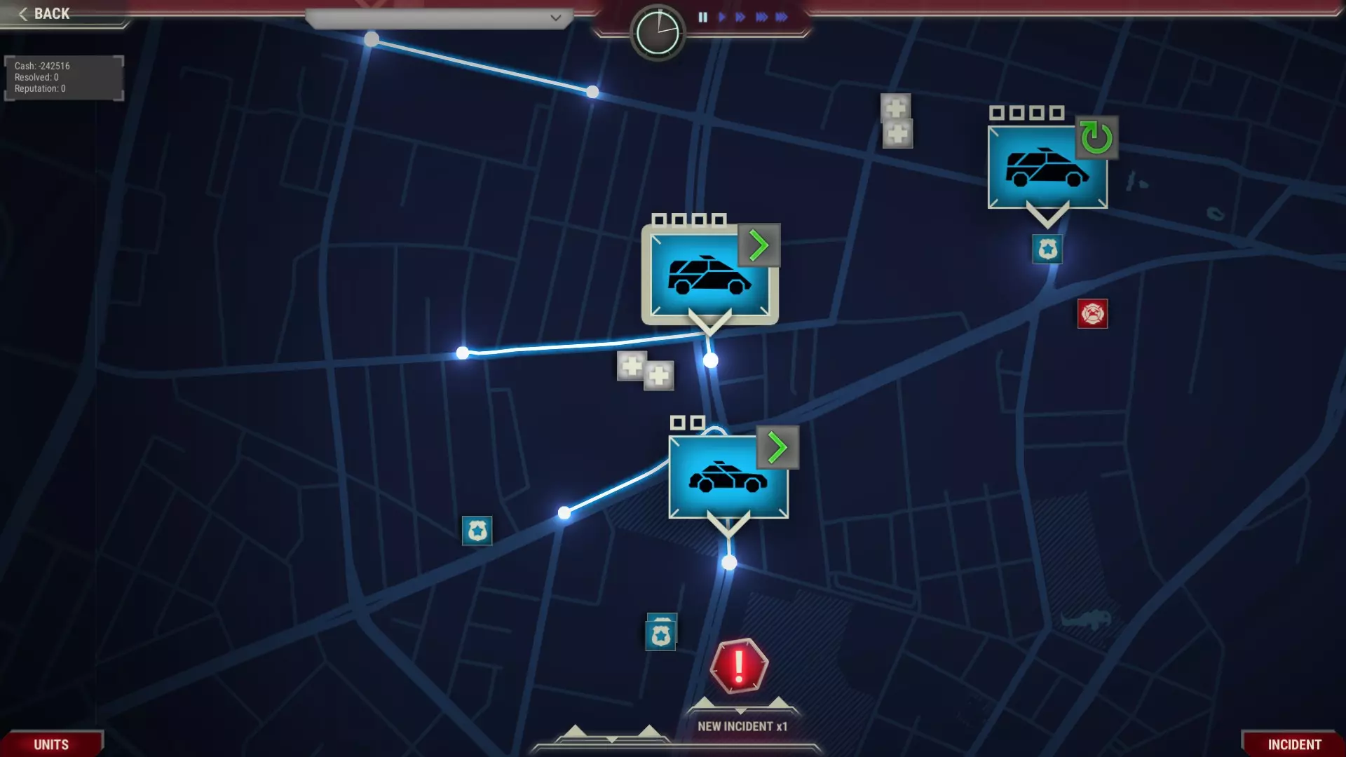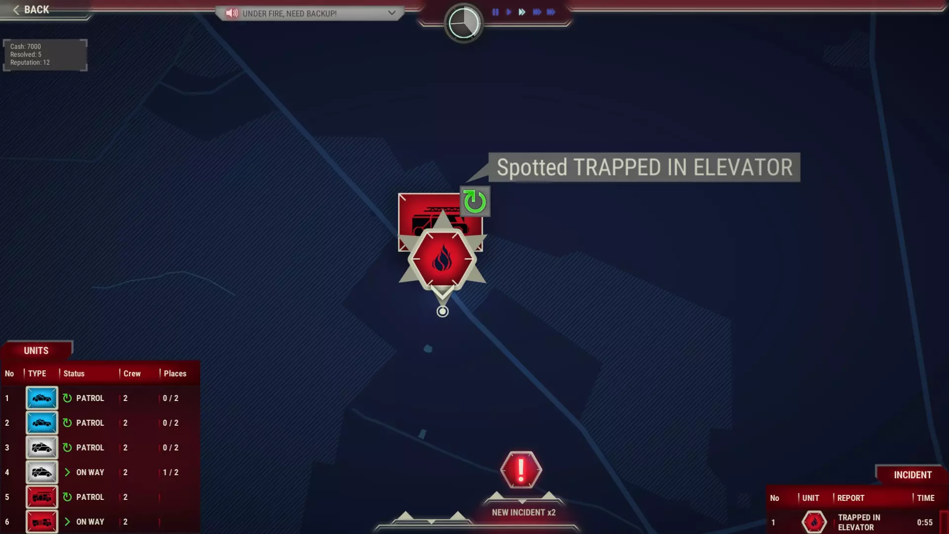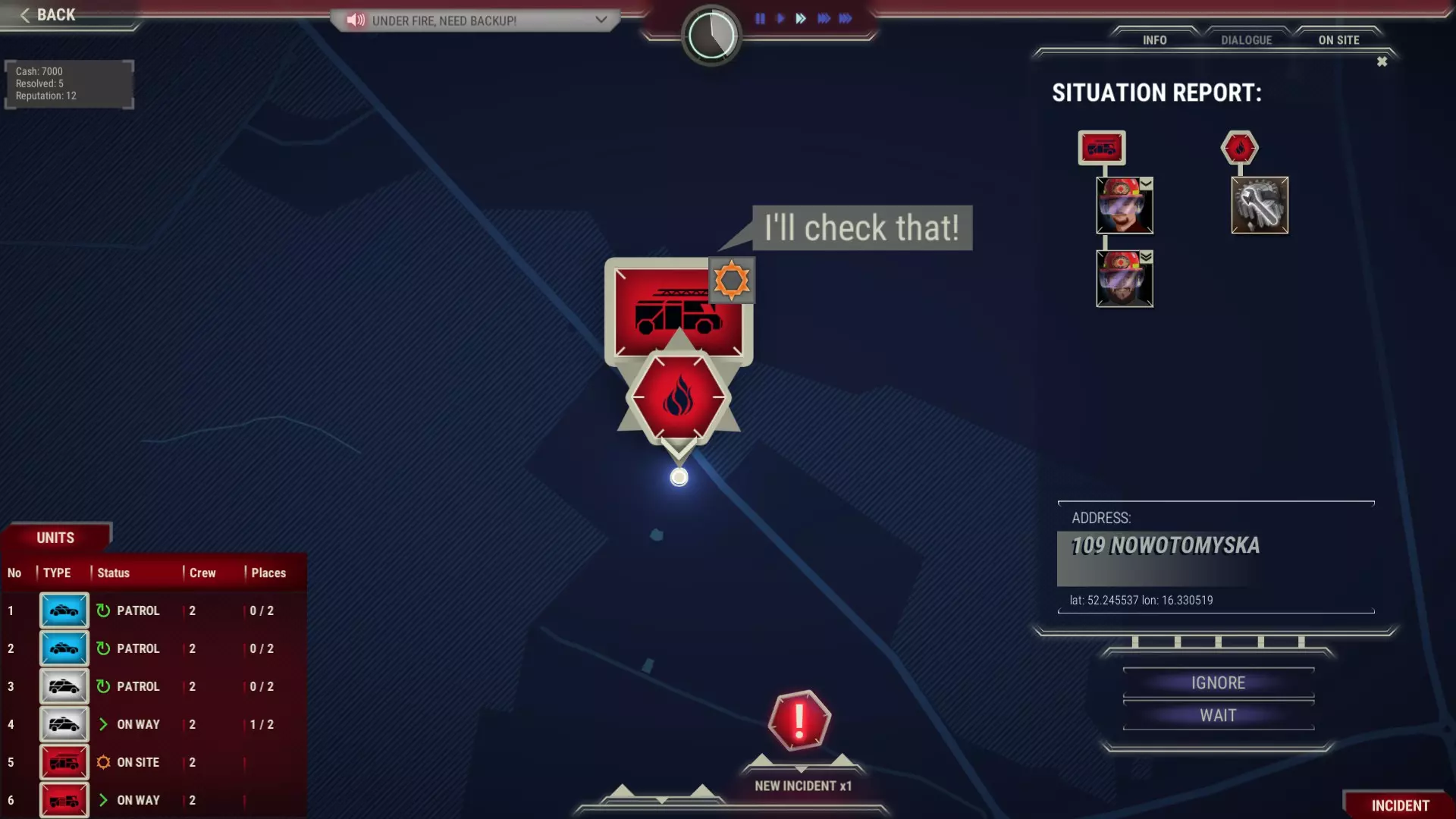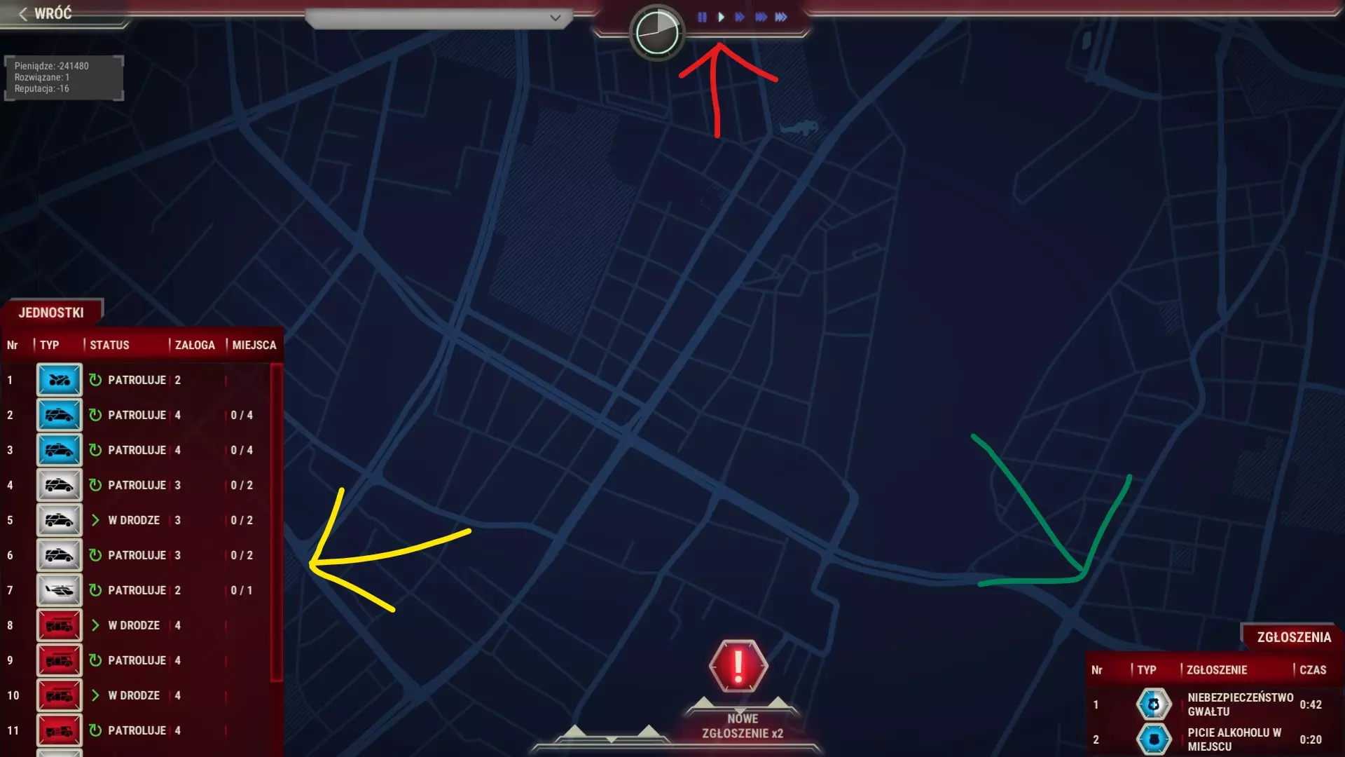 红色箭头表示时间面板,黄色表示单位面板,绿色表示活动事件记录。 请仔细阅读事件描述。注意受伤人数和袭击者数量。思考应该派遣哪些单位前往现场。如果从情况描述中得知干预将以罚款结束,那么派遣配备武装警察的厢式货车前往现场毫无意义。 蓝色图标表示需要警察,红色表示消防部门,白色表示现场有需要医疗救助的人员。双色或三色图标表示需要两个或三个救援部门。 检查单位是否确实到达目的地。