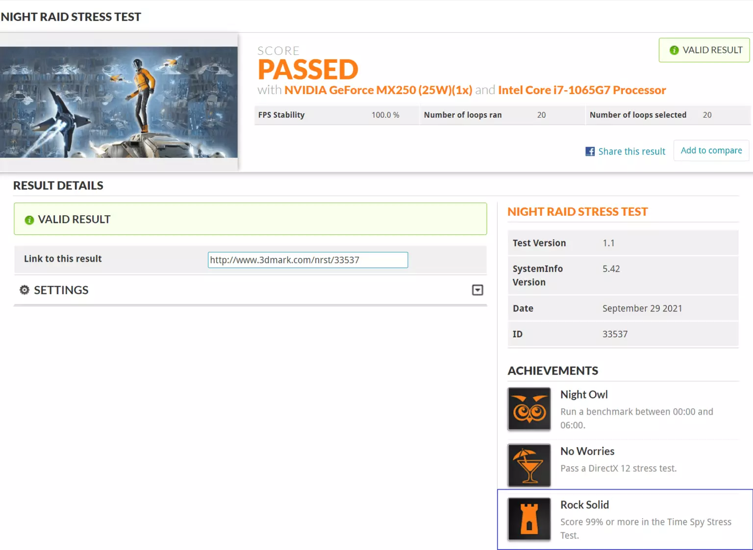 通过一次DirectX 12压力测试。 难度:⭐⭐⭐⭐ 引用自相关内容:要通过测试,你的系统必须完成所有循环,且帧率稳定度至少达到97%。 DirectX 12的压力测试包括Night Raid压力测试和Time Spy压力测试。通过的条件是【FPS稳定度】大于等于97%。 可以使用笔记本来进行跑分,因为性能越弱的话,跑分的FPS基数就小,波动幅度自然也小。也可以在超频软件中将显卡的频率拉低。