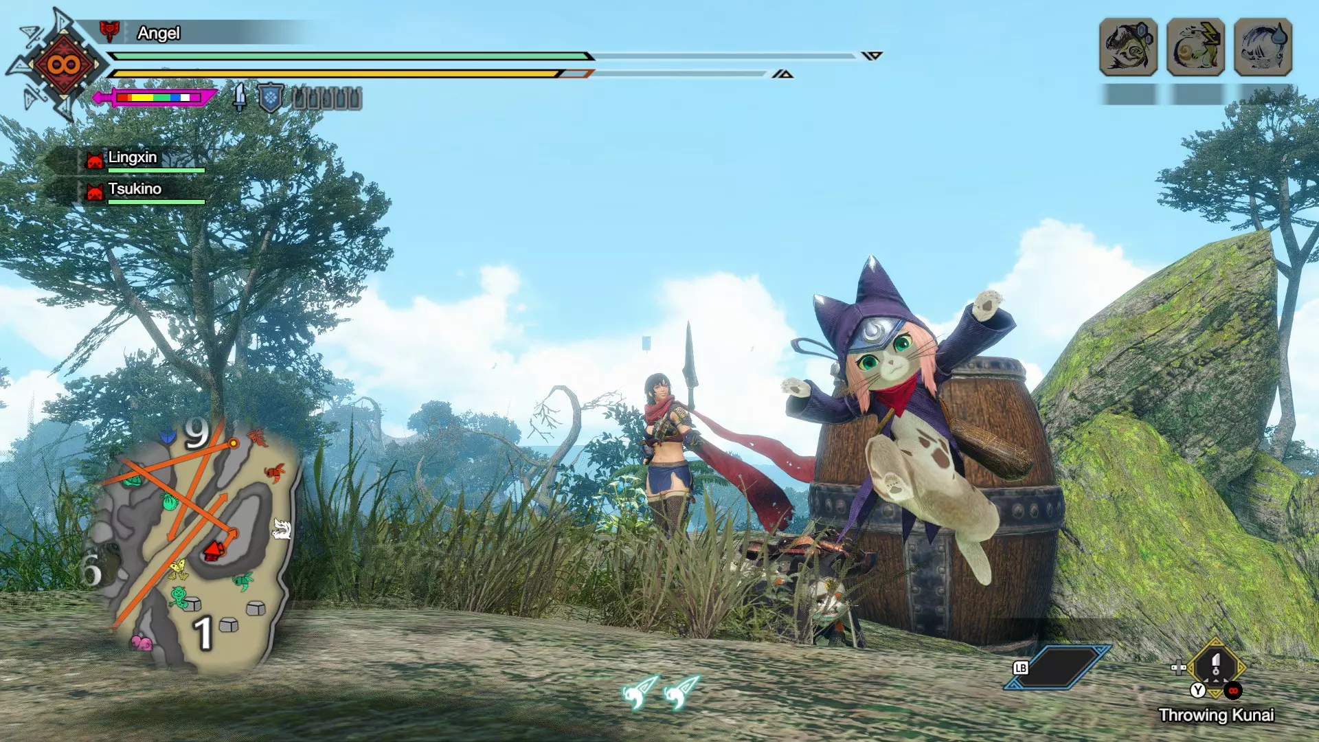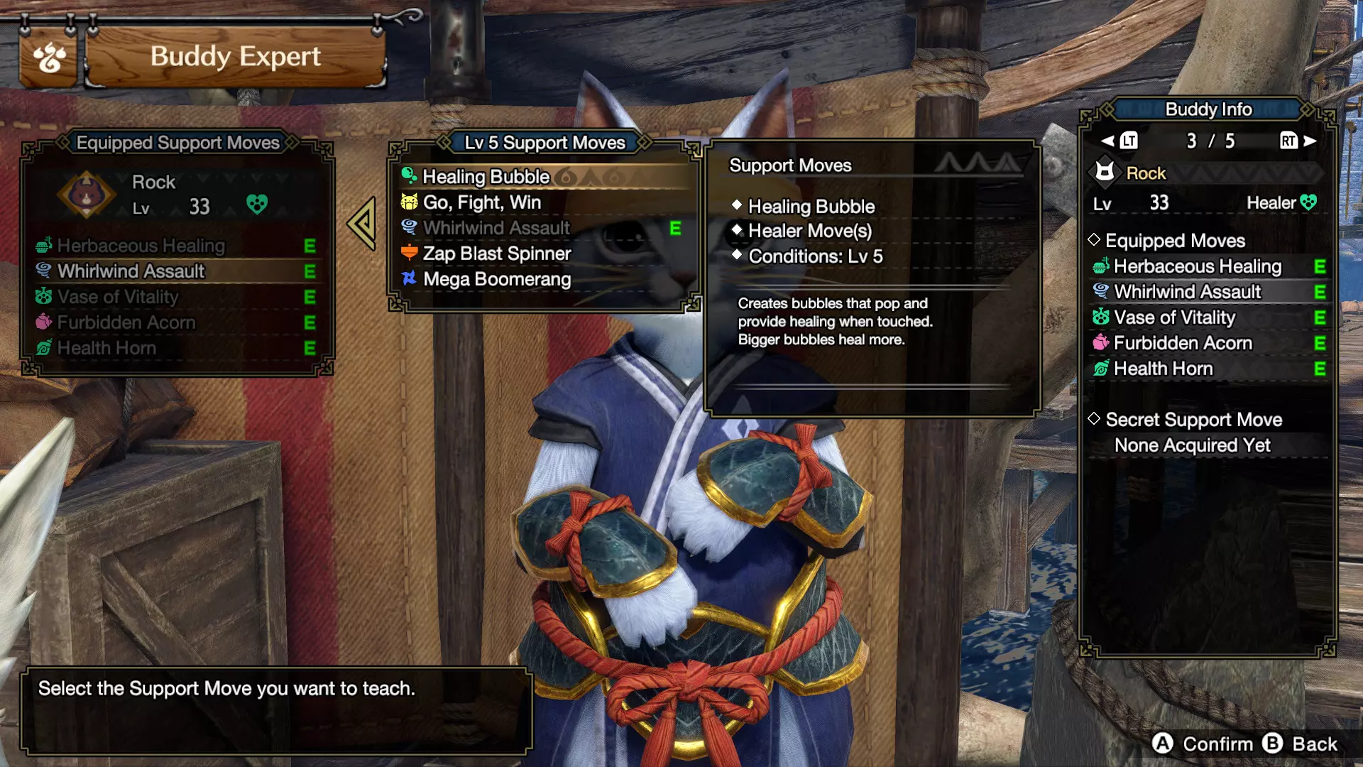 现在无需在每次狩猎后都查看伊织是否为你找到了完美伙伴,因为在资料片中,你最喜爱的伙伴通过适当训练可以胜任任何事情! 我当前在《怪物猎人崛起:曙光》中选择的伙伴 类型:艾露猫 支援类型:治疗者(在单人模式中为治疗者+收集者) 支援动作:治愈泡泡、力量鼓、冲击陷阱师 特殊支援动作:猫的强化 / 猫的烟火 伙伴技能:状态攻击提升、KO之王、无效麻痹、无效睡眠、无效中毒、全耐性 有关这方面以及更多新功能的详细信息,请查看衍生作品的说明。在雇佣艾露猫和牙猎犬时,一定要留意这些【击晕之王+状态攻击强化】。初始能力较弱的情况下,更高的生命值和攻击力意义不大。但它们能够击晕怪物或施加状态异常的概率则更有价值——尤其是在游戏后期!我的艾露猫经常能通过让怪物陷入睡眠或麻痹状态,为我争取到短暂的恢复时间。当敌人进入睡眠状态时效果最佳,此时你可以使用大桶爆弹造成额外伤害——这都要归功于状态攻击强化和合适的伙伴武器!