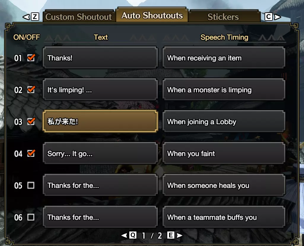 在多人游戏中,如果你需要暂时离开键盘,一定要使用【返回玉】。这样游戏不会暂停,但至少你在营地时不会因失去意识而倒下。 你是否喜欢艾露猫提示你怪物已经瘸腿,让你知道可以使用陷阱进行捕获? 你可以编辑多人游戏中的自动喊话,这样即使没有艾露猫,你也能告知其他人是时候进行捕获或完成任务了。