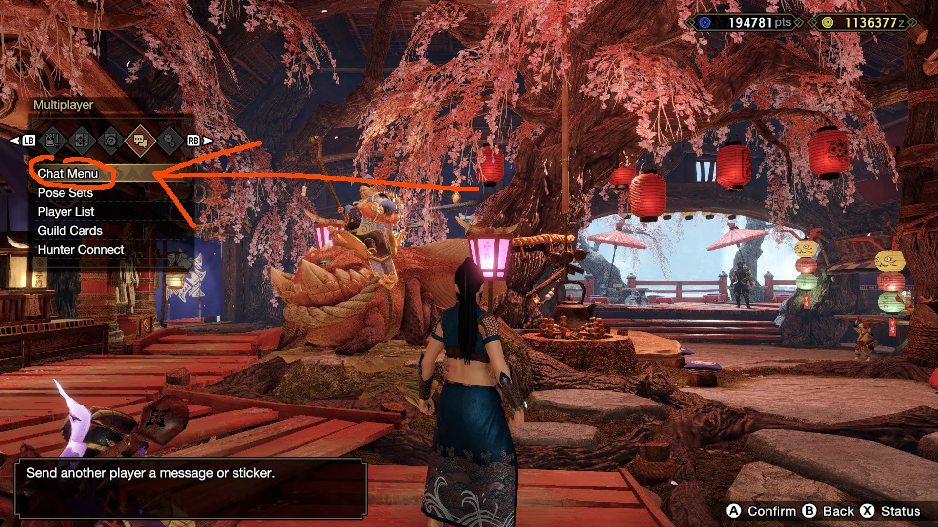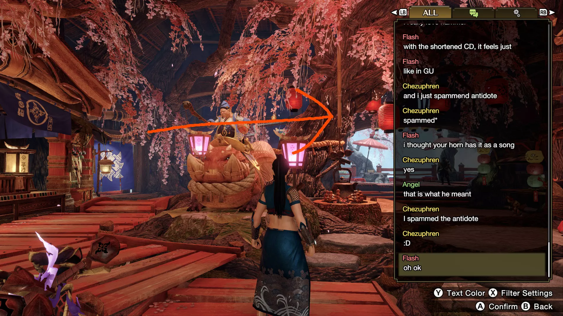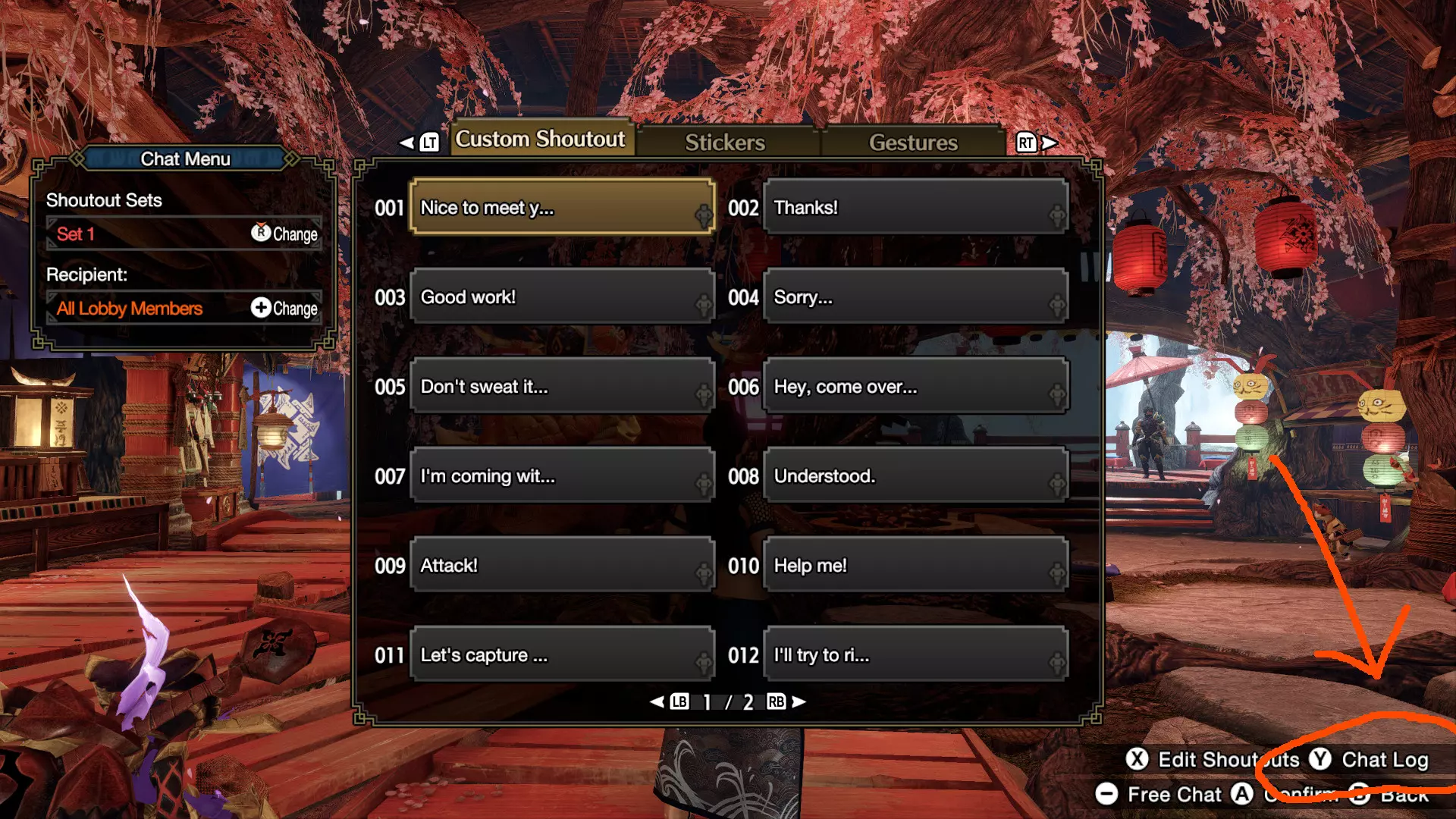 顺便一提:如果你成功爬到训练区顶部,会发现一个秘密。 聊天记录 怪物猎人系列最初面向主机平台,由于大多数交流通过其他方式(如表情贴纸、直接交谈等)进行,因此对聊天功能的需求不大。但对于我们PC玩家来说,聊天仍然很重要,尤其是在不使用任何第三方应用的情况下。 最大的问题是屏幕上显示的聊天内容非常有限——几秒后就会消失,最多似乎只能保留两到四条聊天消息。不过,确实有一个更长(虽然仍然较短但比即时显示的更长)的聊天记录可供查看,让你能重新阅读错过的消息。 要查看聊天记录,你需要打开聊天菜单并调用聊天记录功能。