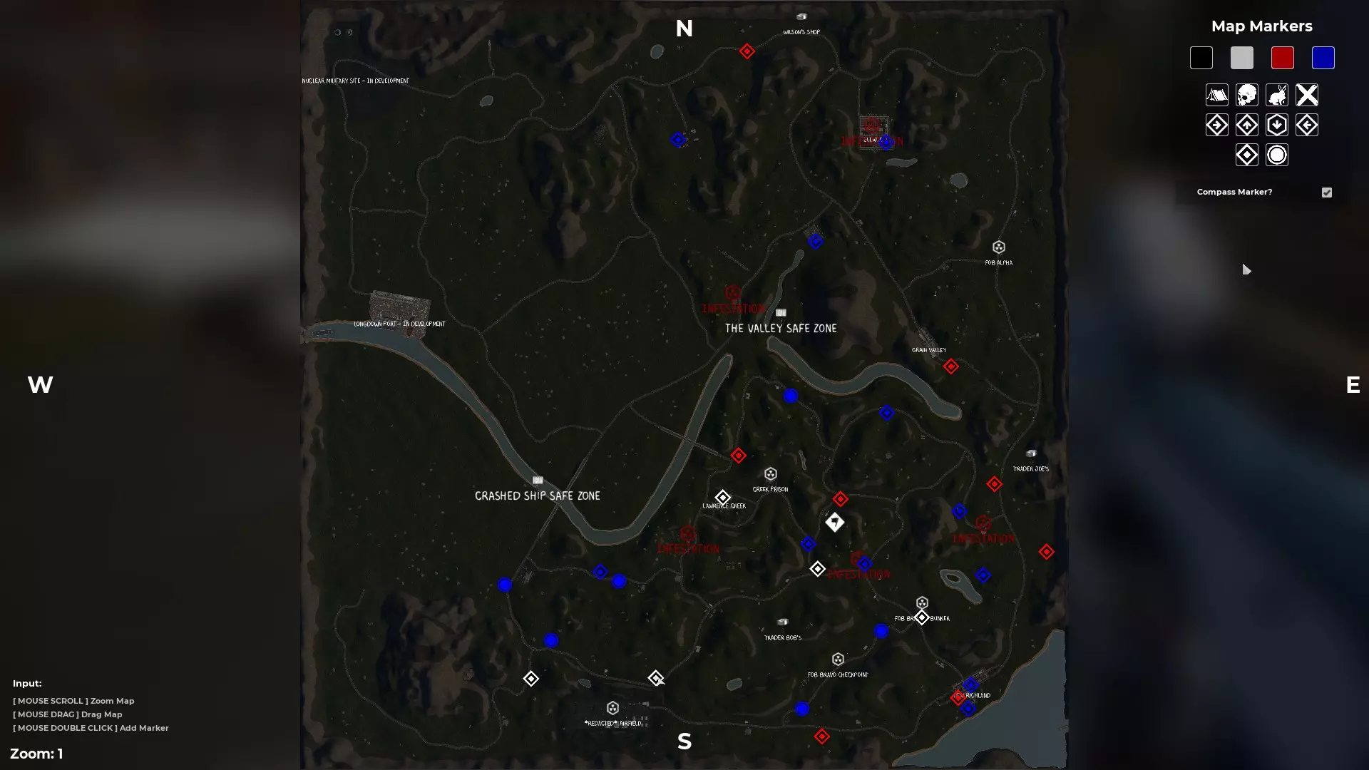 2023年6月13日 版本1.3.8 标识说明: - 蓝色菱形:保险箱 - 红色菱形:武器柜 - 白色菱形:保险箱和武器柜 - 蓝色圆形:流浪商人 - 菱形中的旗帜:随机事件【坠毁的直升机】,有僵尸守卫 标记位置并非完全精确。 我尚未探索所有区域。