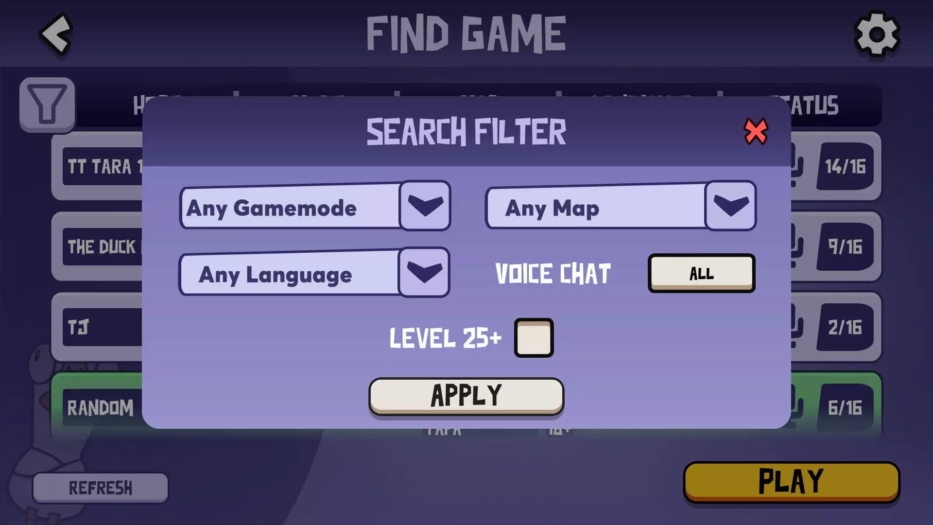 如何寻找游戏? 寻找私人游戏: 你可以从官方Discord获取私人游戏。阅读规则后,前往顶部的【频道和角色】部分并选择【英语】(你也可以分别选择【鹅】或【鸭】来为自己设置绿色或红色名称)。现在你应该可以访问【LFG频道】,该频道分为18+和全年龄段。你可以将7位代码复制粘贴到【自定义游戏】下的【加入游戏】选项中。 寻找公共游戏: