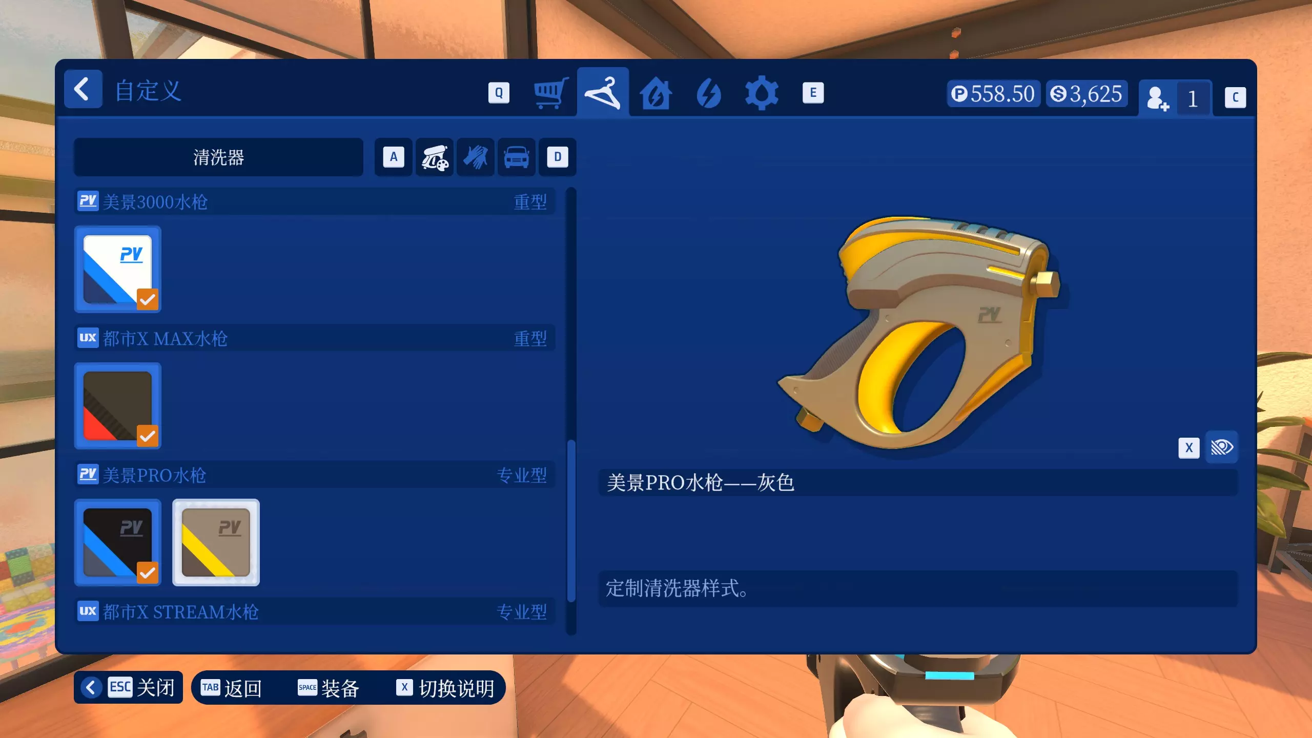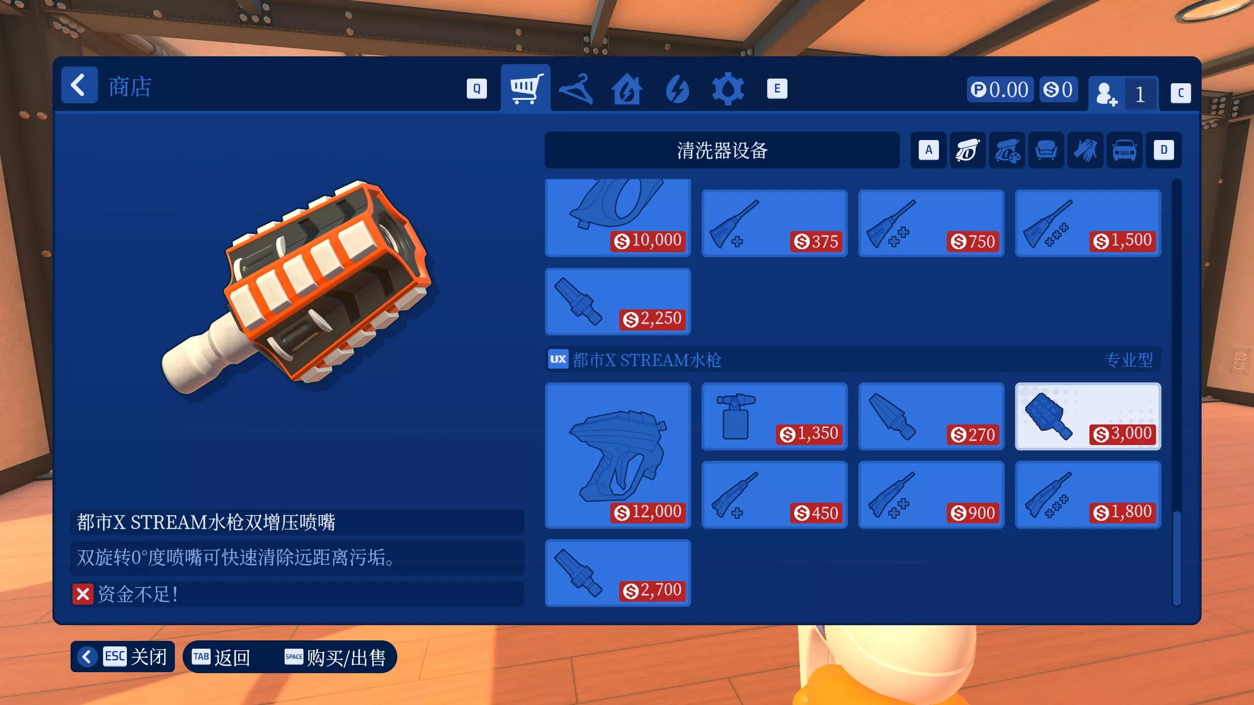 配置齐全 同时拥有所有清洗器及其附件 要买下所有清洗器和附件总共需要70285 购买清洗器的货币只有在剧情工作中才会获得,自由模式重玩只能得到皮肤家具货币。 最后一次清洗任务可以获得3万,只有到最后才能有足够钱买所有清洗器和附件。