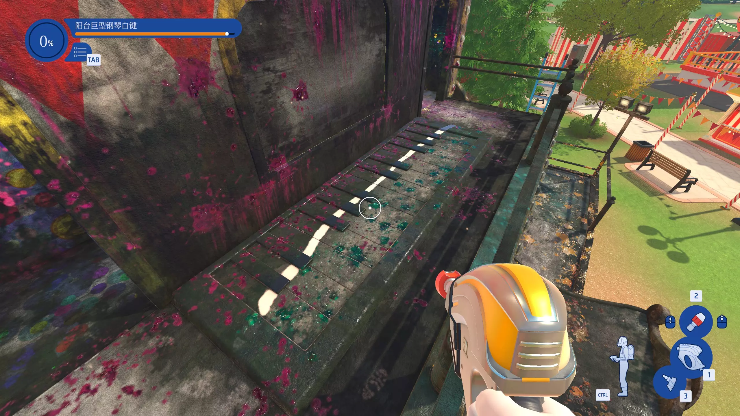 琴键滑奏! 在游乐屋工作中,按照从低音到高音的顺序敲击所有巨型钢琴键。 使用楼梯爬到游乐屋的二楼阳台,地上会有一排钢琴键,只要用水枪从左到右扫一下即可。