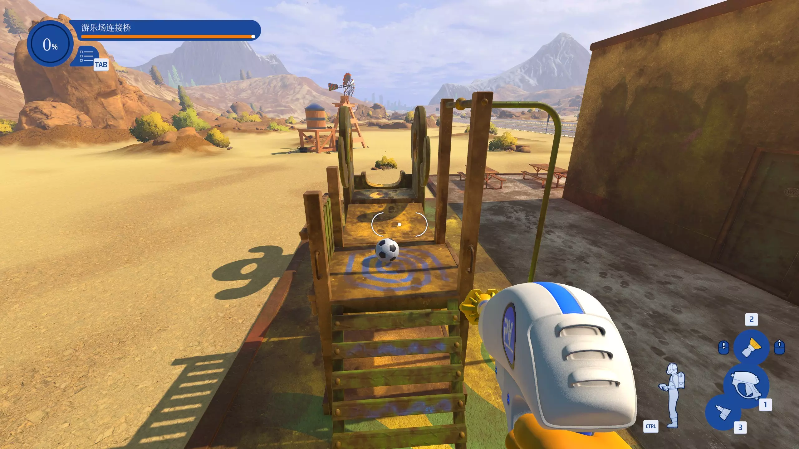 滚球入道 在加油站工作时,让球从游乐场滑梯上滚下去。 超级简单,加油站背面有一个游乐场,就在楼梯旁边,用红色喷嘴对着足球喷一下,把它喷飞到滑梯上即可。