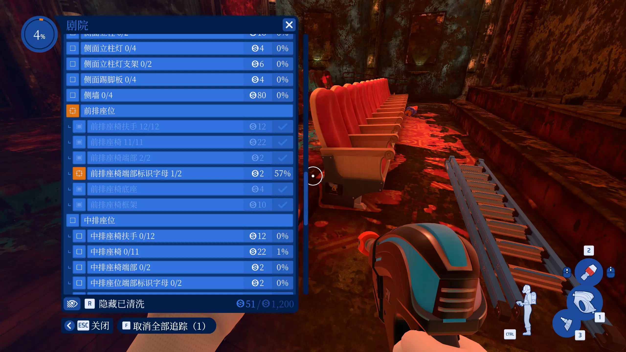 前排座椅 在剧院工作中,优先清洗整个前排座位。 依旧是惯例,先将前排座位列表内的所有物品全部清洗干净即可。