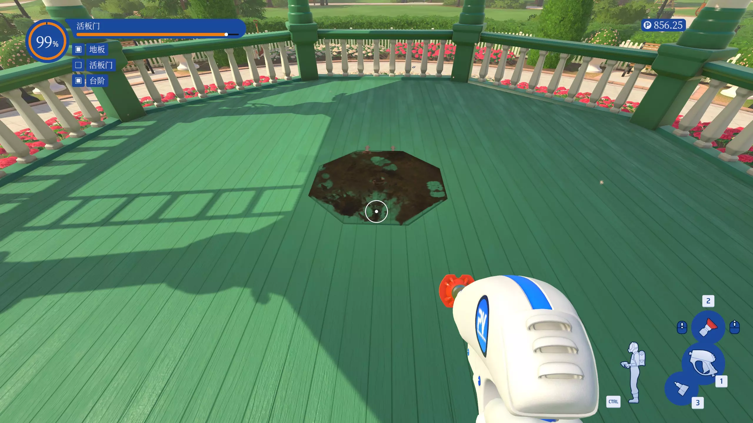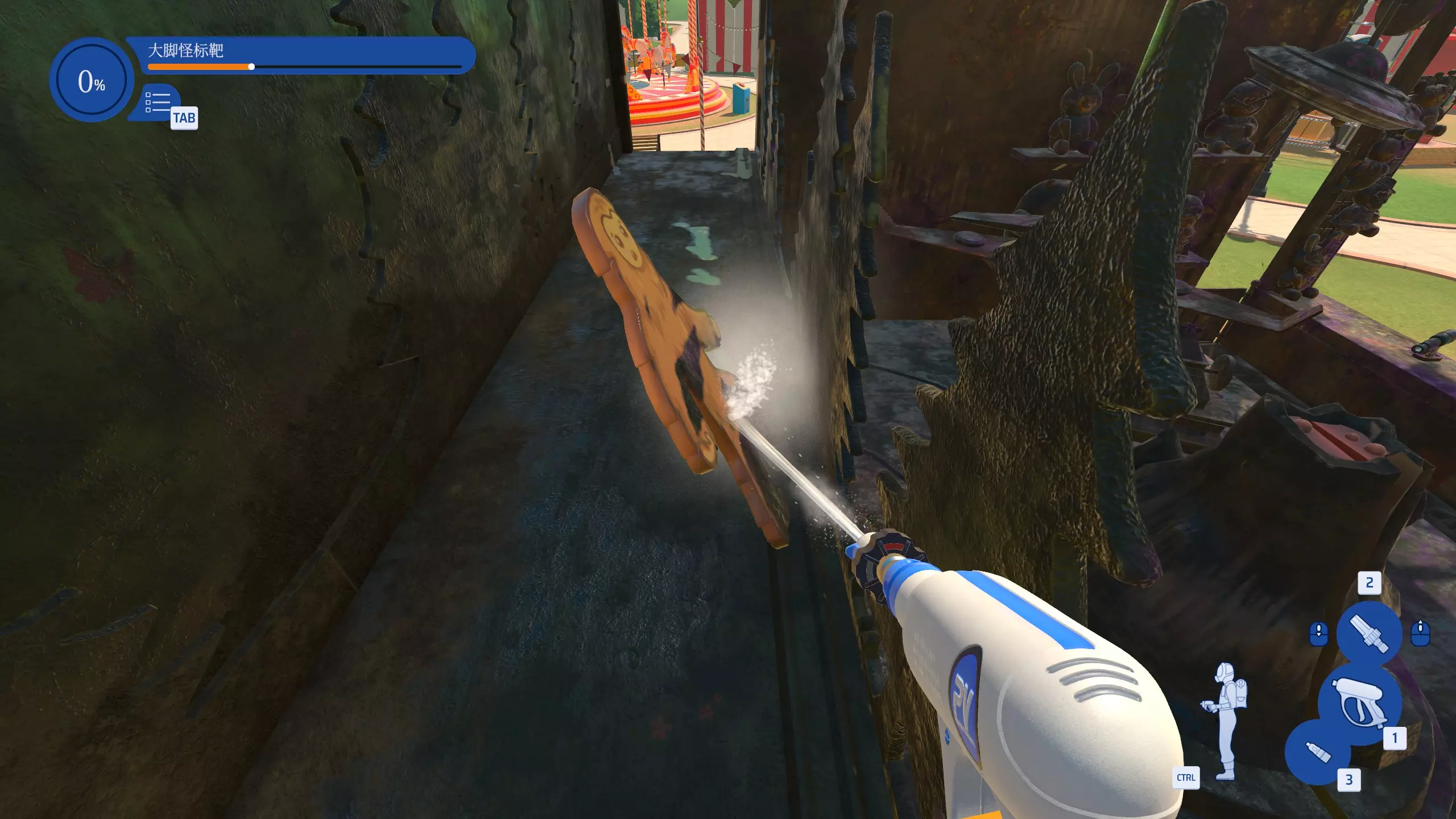 通过梯子从右边上到二层,就能近距离清洗大脚怪。用水枪射中大脚怪正面会让其后仰一段时间,更方便清洗。
