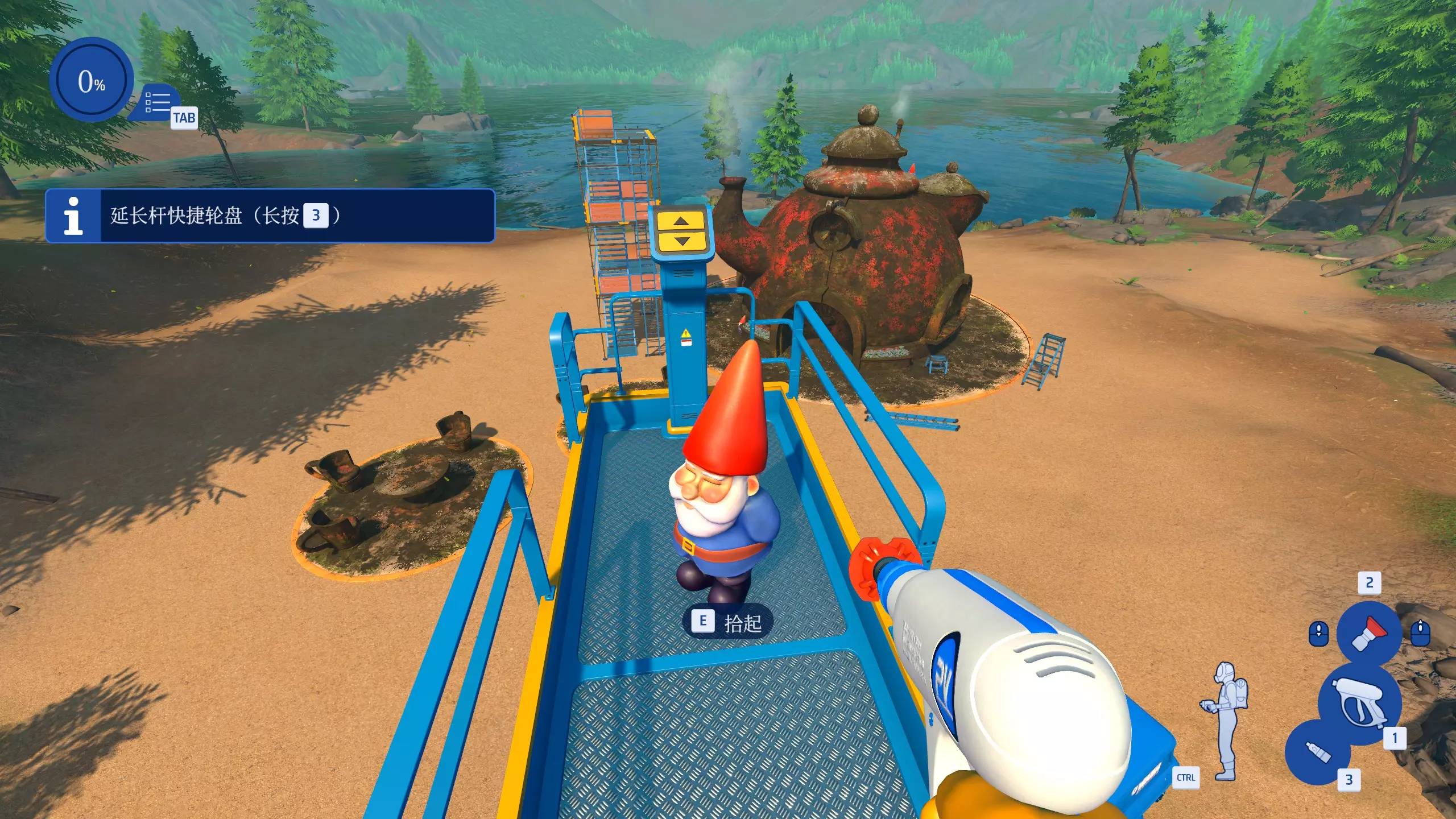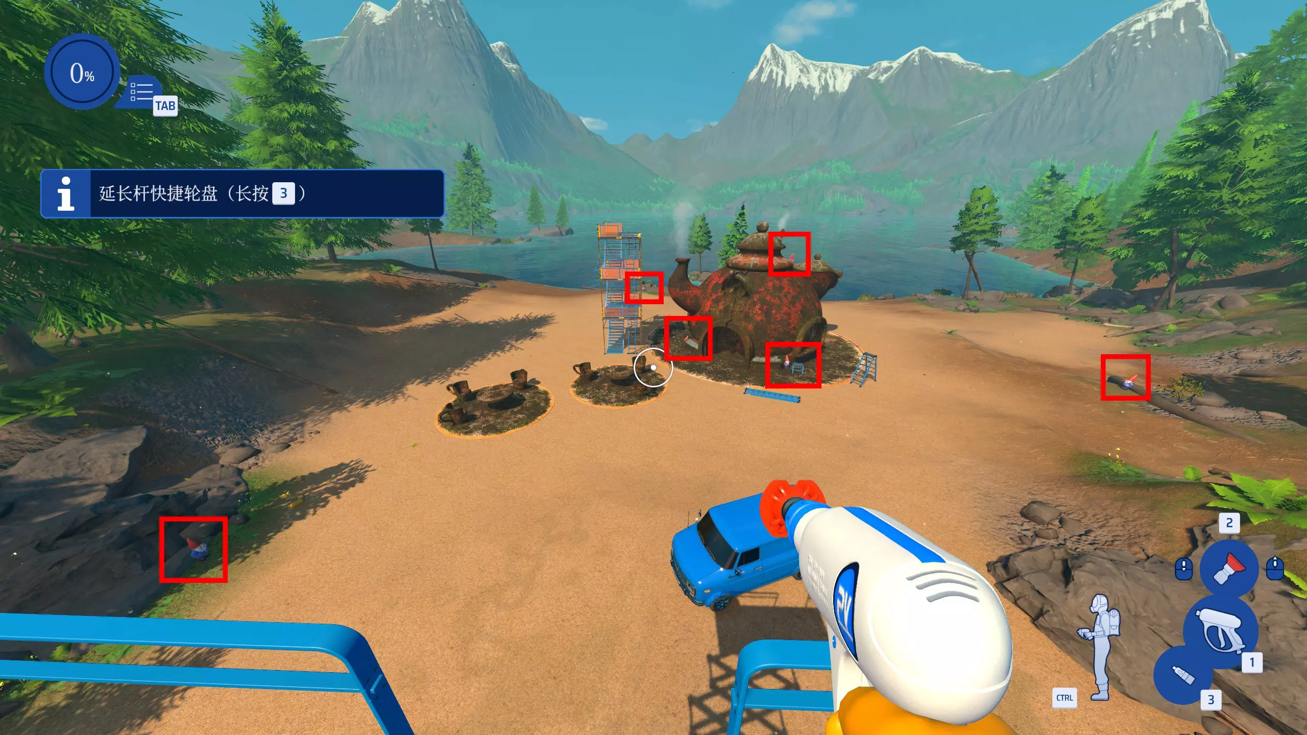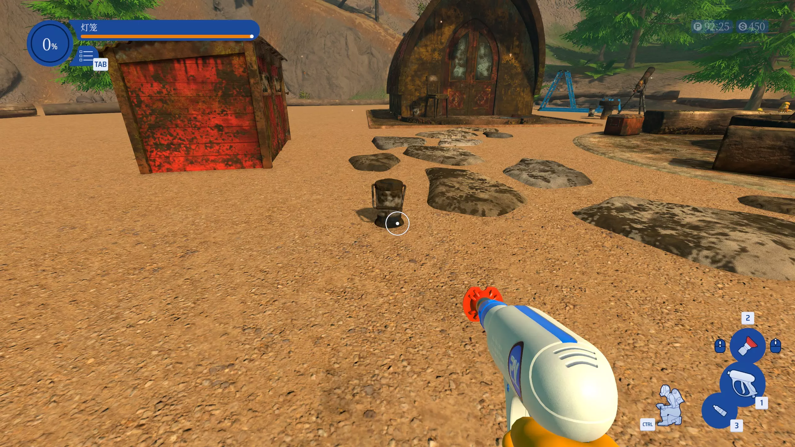 点亮灯火 在露营地工作中,仅使用红色喷嘴优先清洗所有灯笼。 工作开始时,切换到红色喷嘴,然后先把路边的4个看起来像油漆桶的灯笼清洗干净即可。(不包括吊灯)