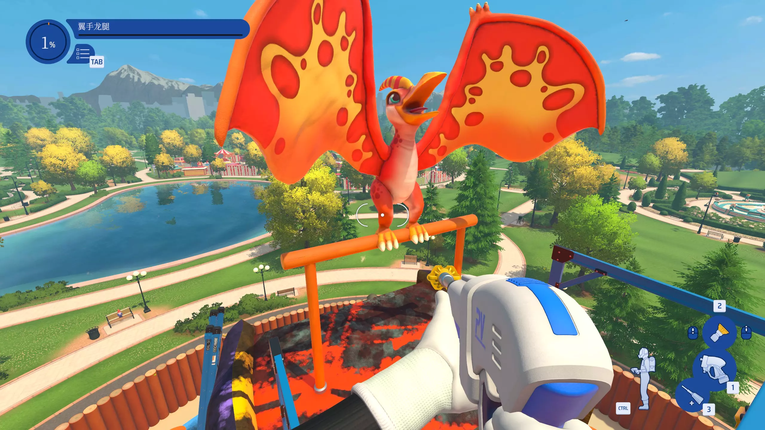 腾空而起 在攀岩公园工作时,优先清洗翼手龙。 工作开始时,先将最高点的翼手龙清洗干净即可,不包括翼手龙脚下的栖木。