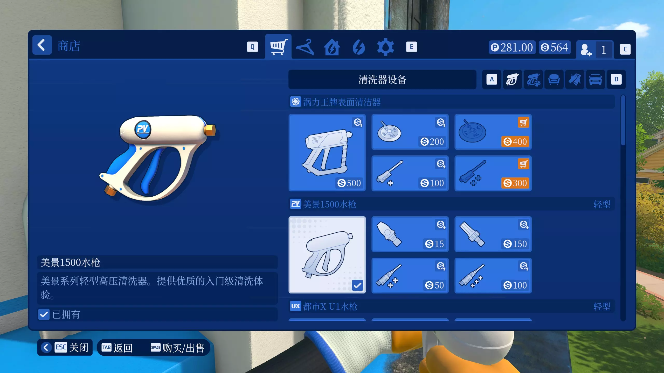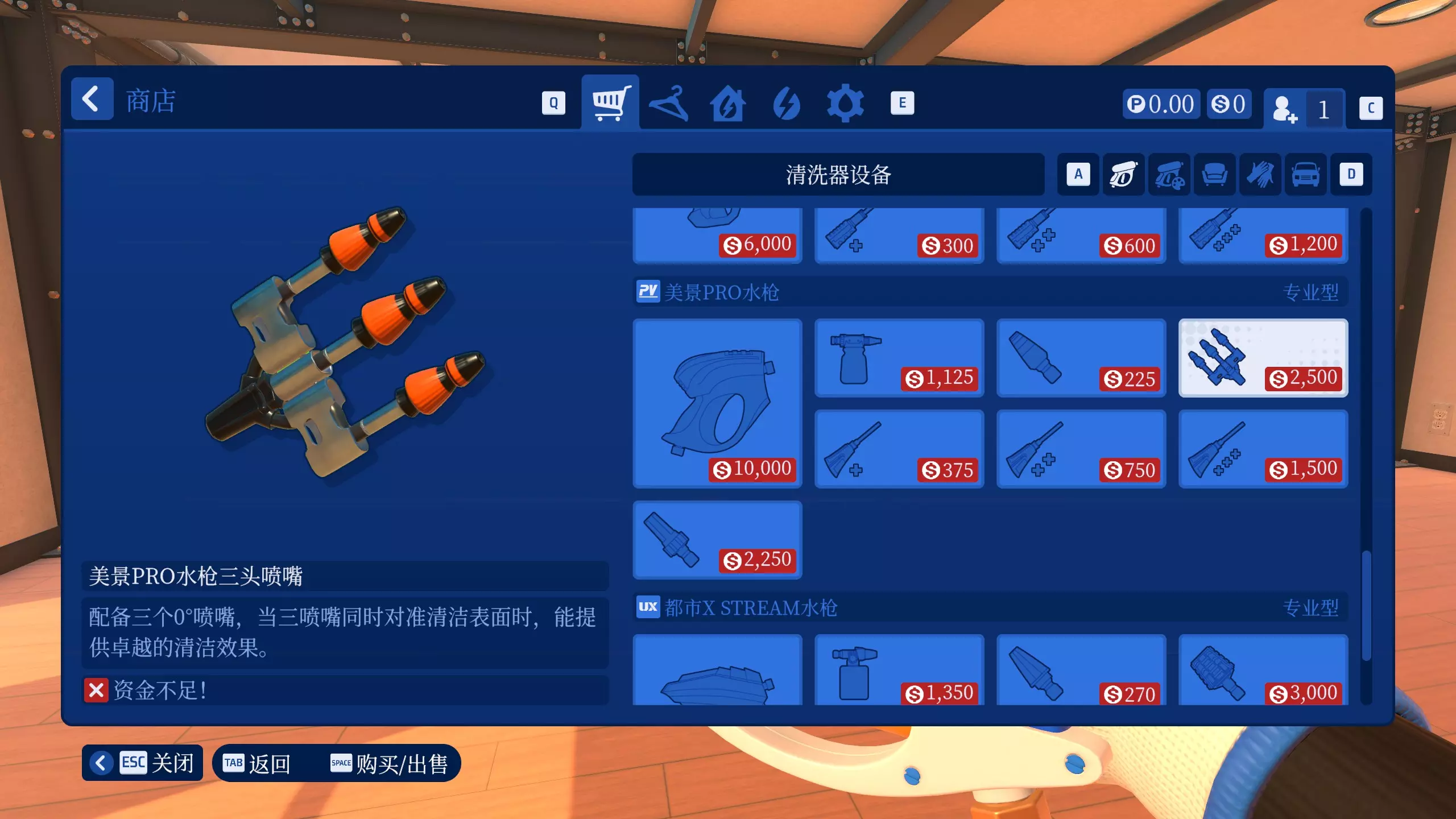 另外,与1代不同的是,已购买的清洗器和附件可以原价出售,显示为白色标价的就是可卖回的清洗器或附件。如果前期资金不足,可以卖掉旧的清洗器(初始2个除外)和附件来购买新的清洗器和附件。 每个满配清洗器所需金额如下: - 涡力王牌表面清洁器:1500 - 美景1500水枪:315 - 都市X U1水枪:380 - 美景2400水枪:3075 - 都市X U2水枪:3690 - 美景3000水枪:9150 - 都市X MAX水枪:10980 - 美景PRO水枪:18725 - 都市X STREAM水枪:22470 通过将持有金额加上已购买的清洗器及附件金额,可以快速得知自己目前能够买到且能解锁成就的清洗器。