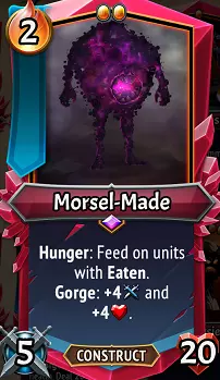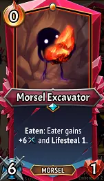 我对此有点犹豫不决。一方面,它能提供+9/+9的属性加成,在特定情况下还能免费触发吞噬效果,甚至在场面满员时也能召唤。但另一方面,它在第一回合会占据一个本可以留给其他支援单位的位置。这张牌最适合与碎肉大师配合使用,整体来说更像是一个不错的额外奖励,而非特别强大的效果。