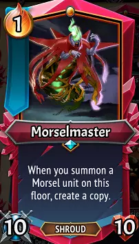 碎食大师:这是我们那些可疑的碎食生成盟友的廉价且稍需更多维护的版本。只要你尚未达到该楼层7个单位的上限,在碎食大师所在楼层召唤或使用的任何碎食都会立即被复制。如果你有稳定的碎食供应,这会非常强大,因为你可以将“最好”的碎食留到他的楼层使用,要么充分利用它们的属性加成,要么复制像生命偷取和伤害护盾这类可能救命的效果。它的属性没什么值得称道的,而且需要你从其他地方获取碎食,但对于一个能免费复制碎食的单位来说,这是相当小的代价!升级/搭配:有趣的是,碎食大师甚至能复制无卡牌的碎食,这意味着它可以与碎食制造者搭配,在结算阶段立即生成4个新碎食……有点过头?或许吧,但很有趣!钢铁商人的升级在这里不是特别重要,所以可以随意将多余的盾牌石、力量石或心石用在它身上。无氏族(U)的铁舌可以为它赋予横扫效果,并将其攻击力设为30,这非常不错。通常你会希望将这个生物与贪食单位搭配,但要注意复制碎屑的能力还有另外两种潜在用途:1) 派出攻击型碎屑,比如【U】熔岩碎屑或【U】挖掘碎屑,能提供少量后排输出,有助于逐个消灭暴露的敌人和/或清除复生堆叠(而且这两种碎屑都足以击败所有等级的收藏家!)。2) 将生命值碎屑,比如【U】暗影碎屑或【U】珠宝碎屑放在楼层前排,作为阻挡者承受多次伤害打击。