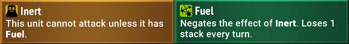 惰性/燃料:【合金构造体(U)】的专属效果。惰性意味着它只有在拥有至少1层燃料时才会进行攻击。燃料是一种仅用于维持其攻击的增益效果,每回合会衰减,可通过其专属的吞噬触发效果来补充。燃料没有其他用途。由于它是一种增益效果,若与【下军团】氏族搭配使用,则可以被传播。