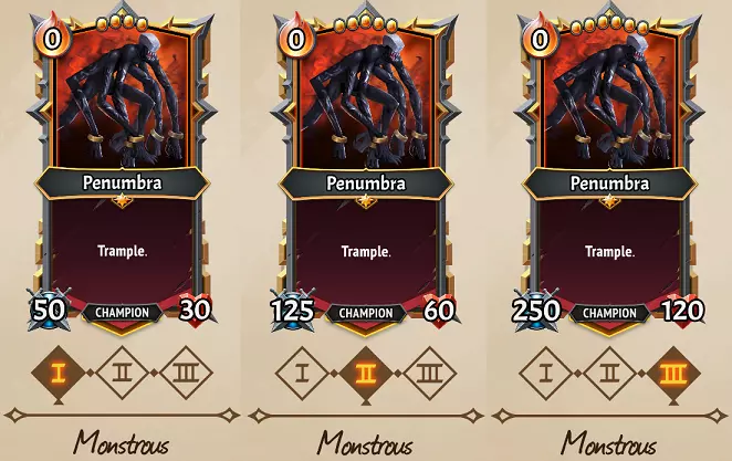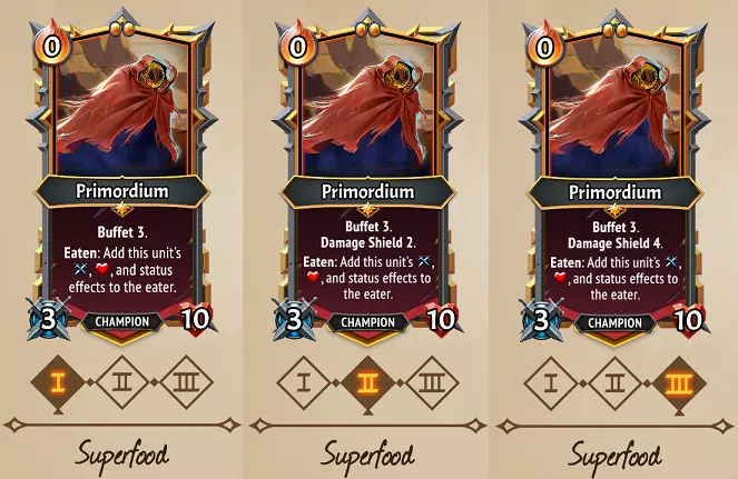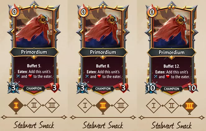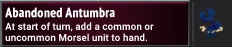 Strategies: The simplest of its paths, Primordium amps up the Attack values transferred… and that’s it! Here Primordium is gone in three turns, but transferred at least 45>90>180 Attack to another unit before it’s gone. Essentially the main value of this path is simply how low-maintenance it is. You don’t need to Deploy any Equipment or load it with status effects to be useful; it confers a nice bit of offense to presumably a Multistrike/Trample unit to exploit the big boosts in Attack. Overall this has the lowest potential ceiling of effects & stats to pass over to other units, but in comparison, it’s helpful even without requiring Gorge units, Deployed Equipment, Intrinsic spells etc. So a safe option if nothing else. Flex potential: Flexing any level of Superfood into a path will add the status effect transfer benefit, so this can be great if you started on Aggressive/Stalwart and later came upon some powerful status buffs to transfer over. If you don’t feel the need for Superfood’s level II & III Damage Shields, absolutely flex to Stalwart if offered to keep transferring those buffs! Stalwart is a great path to continue all the way through, as 12 Buffet is a big amount to take advantage, and a flex to Aggressive Edible likely isn’t worth it compared to simply eating Primordium with Equipment instead. Finally, flexing out of Aggressive Edible to Stalwart snack is a viable option. Flexing immediately out would result in 8 Buffets of 15 attack for 120 Attack, flexing after II would mean 5 Buffets of 30 for 150 Attack… those are still pretty reasonable numbers considering extra Buffet stacks means more opportunity to pass on Equipment or Fight Club bonuses that would result in higher returns after all. Other Umbra card clarifications (C) Making of a Morsel is the only card or effect that guarantees the Rare Morsel to show up… every other effect adds at least the four Uncommon Morsels to the pool of randomly-chosen options. All told, +9/+9 and a Gorge trigger is a pretty solid return for a single Ember, but this is significantly better if you have a (U) Morselmaster to duplicate the effect. Otherwise, getting multiple morsels out of cards like (C) Antumbra Assault, (U) Grovel, (U) Gem Trove, (C) Packed Morsels etc. would be a better potential return on investment, while giving access to potential Lifesteal/Damage Shields that may be even more important. (U) Cave In is Umbra’s only card that moves units between floors, and it’s kind of crazy in the fact that it drops everything, friendly and unfriendly alike. The 7 unit limit is important here, as it will drop your front-most units first, to the back of the next floor down until the limit is reached. This has some powerful boss-beating applications by putting a Freezestone on it and dropping Attacking units from one floor down behind your tanks. (C) Perils of Production is a rare effect in that it’s an immediate infusion of 3 Ember, enough to help pay for some expensive cards on your turn. You can avoid the Emberdrain punishment of this by simply playing it onto a Morsel that’s going to be eaten, or a blocker that will be destroyed by the enemies before the next round. Because there’s a bit of Rage on the card and it can be played for 0 Ember, you can also potentially give it Holdover (and Doublestack if you really want the Rage), which would continually allow you to regain 3 Ember, even if you’ve been affected by Emberdrain from this card or other effects like the mighty (R) Furnace Tap. However, note that this trick will not work if you’ve taken a Blessing of Dominion from a Celestial Alcove event… the Dominion’s Eye Blight would make the Perils of Production card cost 1 Ember instead, shutting down your Ember-engine. (C) Mine Collapse can be given a +10 or +20 Consume upgrade to destroy weak backliners and Collectors even when you have no Ember, which is very helpful since it gives you 2 Ember back for your troubles. This is a plausible use of Holdover+10 as well for both damage & Ember gain, particularly if facing Seraph the Entropic where this would be sufficient to destroy Deafening Heralds. If you don’t have an enemy weak enough to be defeated by (C) Antumbra Assault, you can always use it one of your own Morsels; two is usually better than one! A +10 Upgrade is very good on this card to help it continue to be strong enough to destroy backline enemies later in the game. This can also be particularly useful with (U) Morselmaster – if it’s already filled the floor’s capacity with Morsels, destroy one, and replace with a new one to be duplicated instead! (U) Cannibalize is a pretty good candidate for the Spellchain effect, since you can always Sacrifice one of the resulting Morsels from the first time you play it. (U) Engine Upgrade is a decent card to give Deployable to. It costs 0 Ember so it won’t mess with your Deployment costs, you can reduce the size of the room after you’ve already filled it with Deployable units, and have +1 Ember for the rest of the battle. (U) Ember Cache is a solid card if you have a small deck or plenty of Draws to ensure you’re cycling through it. If however, you’re utilizing multiple Holdover/Endless units, so you may never get through your deck in enough time to take advantage of these. The Banished & Lazarus League clans have added new ways to add Trample to units, but that doesn’t make (R) Umbra Stone any less important than it has been. The game is full of ways to get units & Champions with gigantic Attack stats, and it can be very obnoxious if that huge Attack is ‘wasted’ on weaker enemies… a fact that’s particular pronounced against Seraph Aeternus the Dominant’s waves of low-Health + Reanimate enemies. Don’t pass this one up if you’re heavily scaling Attack on your units! (R) Blazing Bolts gets much stronger after two uses, eventually striking 4 random enemies! Its upgraded versions also carry any upgrades you’ve put on it, so 