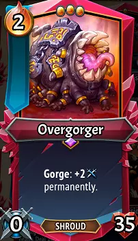 贪食魔:0点攻击力?好吧,我们最好做点什么来修复这个问题。说实话,我有点惊讶它从MT1开始就没有被加强到+3攻击力,但不管怎样……贪食魔要求你像(稀有)钢铁歌手、(稀有)进化软泥或(稀有)赏金追猎者这类单位一样,永久投资它的攻击属性。每次贪食触发都会在“吞噬”带来的常规增益基础上,为它永久增加2点攻击力。这个单位是否值得使用,很大程度上取决于你能让它触发多少次贪食,以及你是否能在游戏早期抽到它并进行投资。暗影派系在游戏早期有很强的存在感,所以如果能早期获得贪食魔,你完全可以把它当作坦克使用,并给它所有能想象到的碎肉,让它在游戏后期变成一个进攻型 powerhouse。否则,它不如(U)噬影者,甚至不如(U)合金构装体,因为它们兼具进攻和坦度的组合效果。 升级/搭配:多重打击是非常理想的选择,这样它不断增长的攻击力就能进行多次攻击。其3点体型的沉重负担使得【小石子】成为相当合理的选择,尤其是当你的牌组在某一层有大量【碎屑】可以喂给它时。35点生命值在前期足够用,但在后期之前你需要决定是否打算让它继续站在前排……如果你选择这条路,【大石子】或【泰坦石】可以帮助它获得一些生存能力,不过【大石子】带来的4点体型可能会让你在不使用【碎屑大师】/制造者盟友的情况下很难喂饱它。由于其增益效果是永久性的,所以要寻找稀有卡牌,比如【稀有】暗影分裂或【稀有】暗影尖刺,以尽可能触发多次吞噬效果!如果你想将其转型为后排攻击者,新的【稀有】贪食之口装备非常好用,因为它能让后排单位也触发吞噬效果!