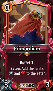 初始卡牌:叮刺 这是游戏前期的强力卡牌,相比影裂者,它偶尔能生成两个碎屑,在解决前期后排威胁方面效果显著。由于它可以升级魔法强度,基础状态下+20的消耗效果是所有冠军初始卡牌中能达到的最高伤害。不过,除非你的游戏进程中有导管或 Pyregel 之类的效果来影响这张卡牌的魔法强度,否则随着游戏推进,敌人生命值提高,它会变得越来越没用。后期是个适合净化或添加消耗效果的好选择。 关于始源的入门介绍…始源入门? 始源与游戏中其他任何冠军都不同。它的功能几乎完全像一个可以重复食用的【碎肉】,最多可食用次数等于其【盛宴】层数。除了体型和可部署状态外,它与【碎肉】的两个区别是:a)它不符合【碎肉】专属效果,例如法术牌【暗影分裂】和【暗影尖刺】;b)它会将当前的属性值转移给食用它的单位,而不是像【碎肉】的【食用】效果那样提供固定属性值。【原初之种】在MT1中就很强,但现在由于新增了可提升其属性的装备和房间效果,以及相对容易为其添加固有/双重叠加效果,它已成为游戏中最强的冠军之一。在《原始物质》的所有版本中,提升原始物质的属性都是个好主意,这里就不具体重复细节了。可部署的属性影响装备、如【U】搏击俱乐部之类的房间、固有属性增益法术,无论选择哪条路线都很有用。法术卡【R】反胃与之搭配效果极佳,因为在盛宴消耗后,它会将其咳出,随时可以再次被吞噬。享受这种循环吧!