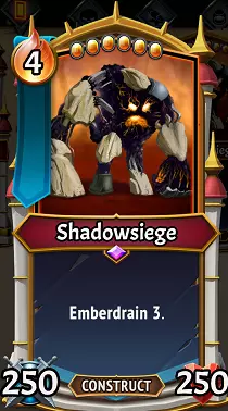暗影围城:啊哈!你以为钢铁歌手/恶魔 fiend/冠冕吞噬者体型庞大且费用高昂?来见识一下这个梗、这个传奇、这个相当荒谬的庞然大物——暗影围城!关于这个巨兽其实没太多好说的……它拥有游戏中所有旗帜单位里最高的属性,体型巨大到甚至无法放入默认的训练队列,而且就算你能投入4点部署余烬将其召唤出来,它也会以3级余烬枯竭来惩罚你。不过属性确实很棒!而且,如果在它出现时你拥有赫扎尔的部落或沼泽蠕虫的生长柴堆之心,那你可太幸运了。 升级/搭配:微晶石对这个生物来说是个很棒的选择,多重打击也能让250点攻击力作用于多个目标。速度石同样是个不错的选择。说实话,基本就是这样了,它真的不需要来自钢铁商人的其他属性或效果(当然也别给它二元论!),它只需要能在列车上使用就行!暗影派系有很多生成余烬的效果,但只有一张卡牌能降低抽到的盟友的费用,那就是【暗影】棱镜回收。这个单位有点像个笑话,但还是有办法通过无派系神器(比如救赎草图)、其他派系的卡牌(比如【红色】通渠之歌和【红色】零件回收)以及能保存或生成余烬的组合把它召唤出来,享受其超强的属性。清除余烬流失减益是熔火残党独有的能力,所以初期抵消余烬流失的最佳办法是用固有【联合】生产危机或【红色】点燃。暗影支援单位 每个氏族都有这类非旗帜卡牌单位的不同版本,但对于暗影氏族而言,你只能将一个非碎肉单位加入卡组,而且它甚至打破了支援单位通常的体型规则,会占据2个空格!在介绍碎肉单位之前,我们先来详细说说这个单位。