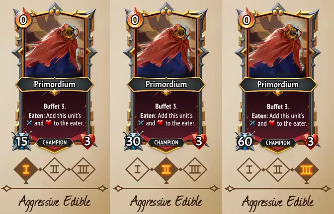 策略:既然能吃12次原初物质,何必只吃3次呢?这条路线乍看之下可能比较弱势,但通过叠加大量【盛宴】效果能获得两个重要优势。1)在首领战阶段,【无情】效果下,碎屑通常撑不过一回合,而原初物质在这条路线下却可能持续多回合。像【U】坩埚收集者这样的单位可以不断吞噬原初物质,持续刷新其生命偷取效果,从而在首领战中存活极长时间。或者【U】合金构造体即使在碎屑耗尽后,也能持续获得充能。2)如果你能用装备和法术卡牌提升原初物质的属性,那么多次叠加其属性将带来更显著的累积效果。也就是说,即便你什么都不做,只给原初装备一个可部署(U)玻璃大炮,当它在三级被吞噬时,最终至少会传递720点攻击和120点生命值给吞噬它的单位。哇哦! 攻击性可食用单位: