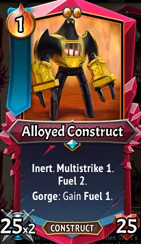 合金构造体:希望你看到这些属性时的第一反应是,它比普通的稀有单位强得多,事实也几乎如此!机械人先生拥有极高的初始属性,但它具有“惰性”特性,只有在拥有至少1点燃料时,才会在自身回合进行攻击,这是它独有的增益效果。如果合金构造体耗尽燃料层数,它就会原地承受伤害直至被击败,导致那出色的25×2攻击属性白白浪费——如果你希望在无情状态下持续攻击 Boss,这尤其令人心碎。它通过吞噬触发效果来恢复燃料,因此只要用碎屑或原质为其“充能”,它就能正常运作。在这个氏族中,有很多方法能让合金单位进食,所以这通常不是大问题,更大的问题是它通常必须站在战场前排才能进食,这迫使你在构筑时必须考虑为它搭配坦克或输出相关的效果。 升级/搭配:要让这个金属大块头发挥作用,首先要考虑的是燃料,所以它需要尽可能获得“碎屑”的支持。接下来要解决的是如何升级它,因为随着游戏进程,25点生命值作为前排单位是撑不了多久的,它很可能会承受敌人大部分的攻击。为了解决这个问题,你可以选择泰坦石、大石块或心石,并希望能吃到(U)碎屑挖掘机,让它获得生命偷取来恢复生命值。相反,如果要增强其进攻能力,你可能需要力量石、大宝石、速度石,甚至另一颗多重打击石来叠加伤害。由于燃料是一种增益效果,二元论理论上可以使燃料获取量翻倍,但除非与其他状态增益效果搭配,否则这是一个相当弱的效果。奇怪的是,无尽在这里反而更合理,因为它能保留从碎屑获得的属性,并且在重新召唤时恢复2点燃料。寻找装备卡牌来帮助它生存和/或利用其多重打击造成高额伤害是个不错的主意;安布拉的【暴食之喉】(R)让合金机器人即使不在前线也能获得燃料,这使其有潜力专注于输出伤害……不过这通常会将其燃料获取限制在每回合1点,从而在无情阶段变得脆弱。这是一个需要精心操作的机器人!