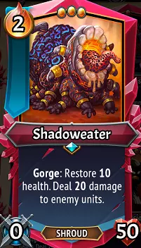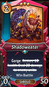 【暴食之喉】是一张新的装备卡,它添加了技能:撕咬(冷却1),效果为牺牲一个友方单位,获得+15/+15属性,若相关则同时触发被吞噬和暴食效果。我将在本指南的后续部分讨论一些使用它的潜在策略,但有两个重要方面需要了解。1)它甚至能让后排的单位触发暴食!当后排的清场单位/伤害输出者能够通过残片获得属性和增益时,这会带来非常重大的影响。2)它让你有可能在自己的回合触发暴食/被吞噬效果,而无需使用如【盛宴】和【暗影尖刺】这样的法术,也不需要【残片构造体】这个单位。 暗影派系的独特效果