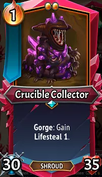 熔炉收集者:还好,这比合金体简单多了。这个像水晶口水工厂一样的单位,以其体型和成本而言,拥有相当不错的30/35属性,并且在暴食时还能获得1点生命偷取。虽然30点攻击看起来像是要作为进攻主力,但它真正的优势在于坦克能力……只要它吃下一个残片,高攻击就能让它在每次攻击时稳定回血,在前线自我续航的同时,还能从残片中获得属性加成。这使得【熔炉收藏家】在无情阶段成为极其出色的坦克,因为如果它积累了足够的生命偷取层数,且 Boss 无法在一回合内将其摧毁,它或许就能一次又一次地将自身生命值回满! 升级/搭配:我最喜欢的两个升级是 a)【大晶石】,它能将生命值大幅提升至 85,并提供 45 点基础攻击力,以借助生命偷取来恢复生命值。b)【泰坦晶石】,随着游戏后期敌人波次的威胁加剧,它将有助于提升其长期生存能力。像【心石】和【力量石】这类标准升级也很不错,理论上你也可以选择【速度石】,如果你希望它能快速行动并立即自我治疗,而非等待一波敌人的攻击。考虑到30点基础攻击力,多重打击听起来不错,但要注意每次打击都会消耗一层生命偷取,这对于在无情状态下维持生命偷取并不理想。二元论会让它每次吞噬获得2层生命偷取,但除非你找到其他方法确保它能持续存活足够长时间来维持生命偷取,否则效果并不太显著。