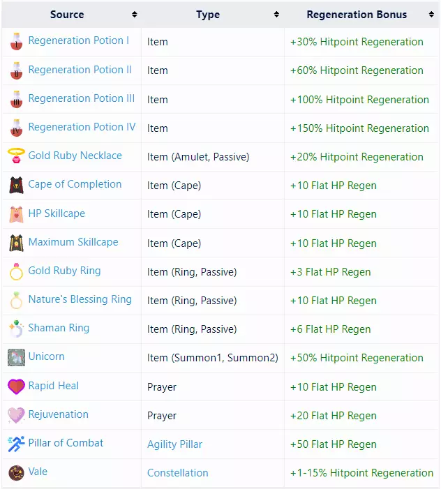 龙盾:+30最大生命值 家养宠物:+10最大生命值 增益: 技能:+10 生命值回复 成就:+10 恒定生命值回复 多面手:+10 恒定生命值回复 药水:+30%、60%、100%、150% 生命值回复 戒指: 黄金戒指:+3 恒定生命值回复 自然祝福:+10 恒定生命值回复 萨满戒指:+6 恒定生命值回复 伙伴:独角兽 +50% 生命值回复 远程战斗