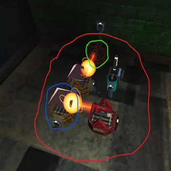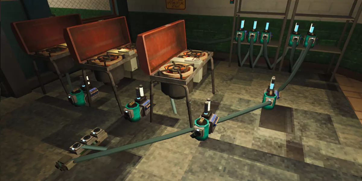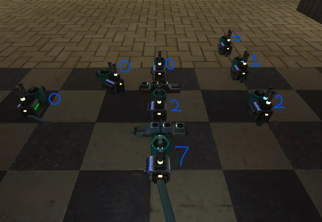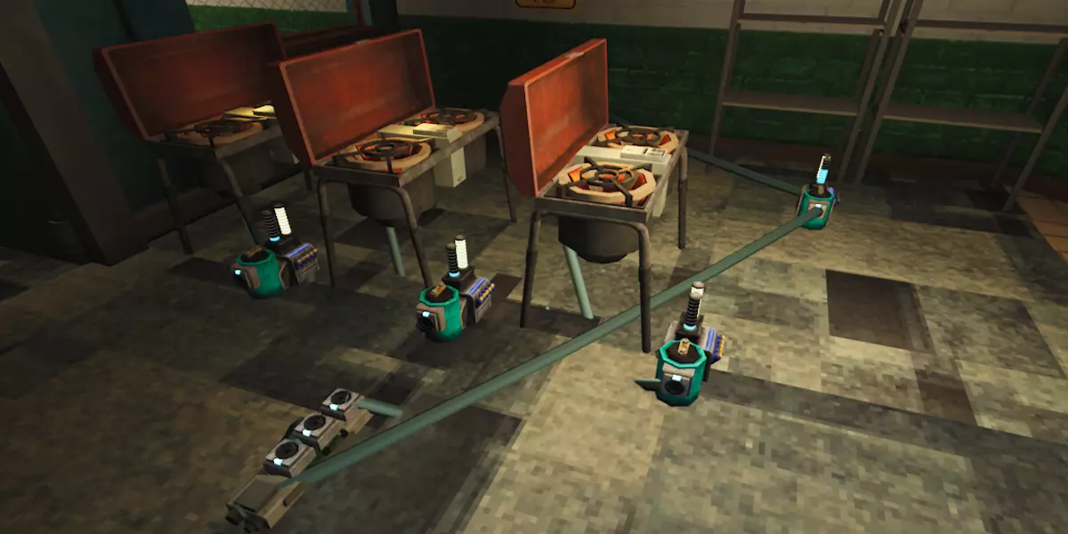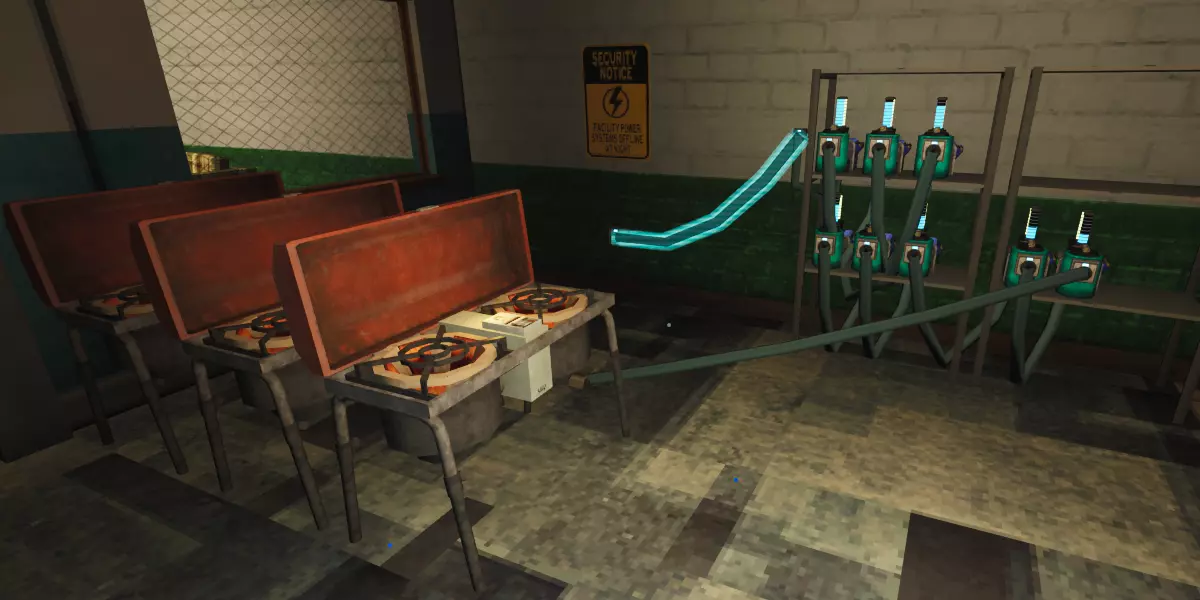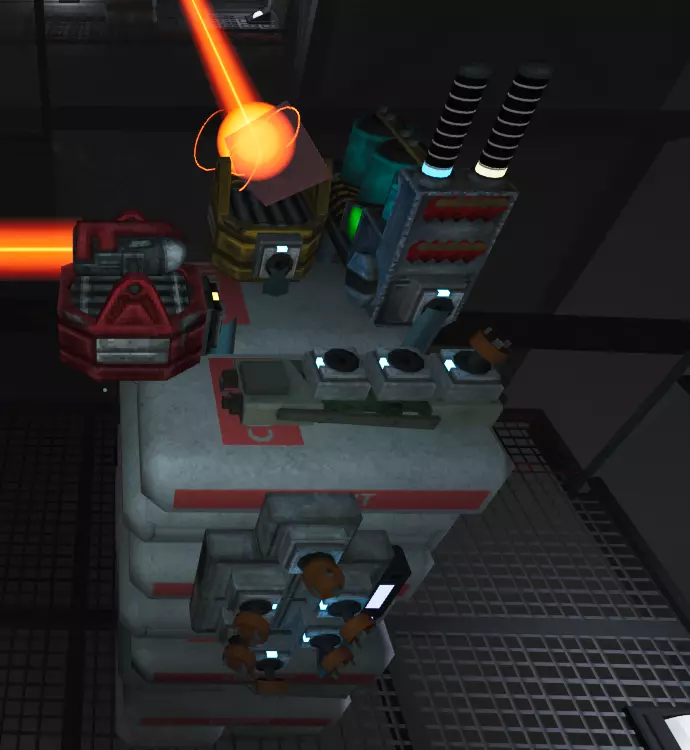 激光发射器:顾名思义,激光发射器通过电源发射激光,是所有电路的起点。 激光能量转换器:将激光能量转换为能源。 激光棱镜:将一束激光分裂成3束独立激光,其中2束分别为蓝色和绿色。同时会使激光功率减弱三分之一。 激光反射器:将激光重定向至其指向的方向。同时会使激光功率减弱三分之一。 激光在无法继续重定向前,最多可被重定向或通过棱镜分裂3次。激光为电池充电的速度比插座或环境激光慢近三分之一。需要注意的是,激光的功率不会改变其为电池充电的电量。在1.0更新前,如果激光击中人造物体(路障、路障、沙袋墙等),则不会消耗电池电量;但遗憾的是,1.0版本发布后,无论激光击中什么物体,都会消耗电量。 电力负载