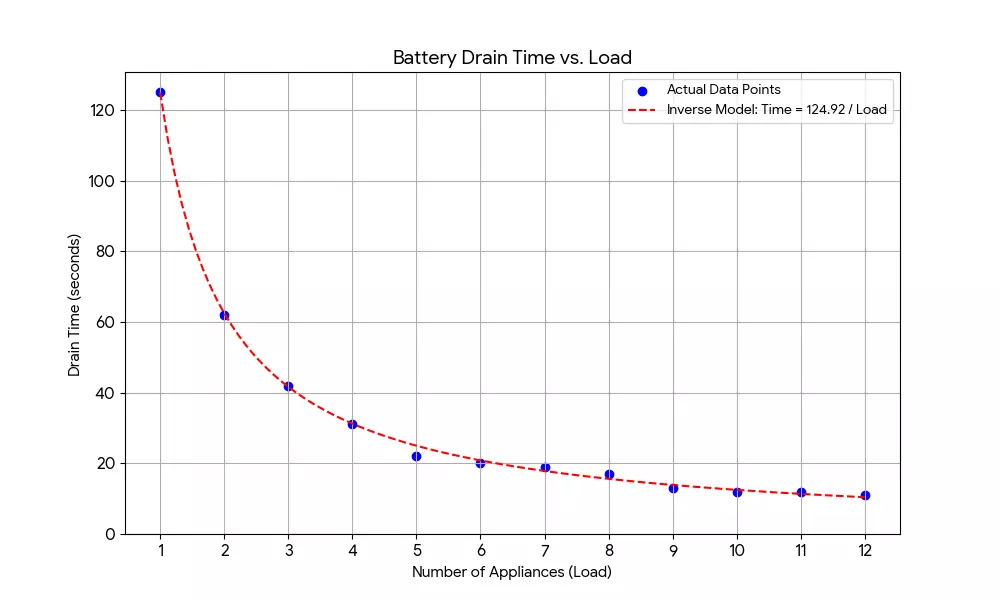 在这个示例中,你可以看到数组原点处的电池负载为7,因为总共有7个物体(电池)连接到它。标记为负载2的电池总共有2个物体连接,标记为负载1的电池只有1个其他物体连接,而标记为负载0的电池则没有物体连接。 向数组中添加任何物体,都会使其分支处一直到原点电池的负载增加1,但不会改变其他分支的负载,因为它们与这个新物体没有连接。此数组仅用作负载工作原理的示例,并且是一个非常耗能的数组,所以不要使用它。理解负载对于掌握电力系统的高级结构至关重要。 负载背后的数学原理简单来说,是电池输出能量时所应用的一个乘法变量。电池的负载越大,为驱动一个设备所消耗的能量就越多。这是非常不利的,因为即使负载仅为2,你也会浪费电池一半的输出能量。由于负载是乘法而非线性的,当阵列上的负载增加时,效率系数的下降幅度会减小:负载为1时效率减半,而负载超过10后,效率损失仅约为1%。但这并不意味着你应该在基地中始终施加负载。临时电池负载与持续时间数据如下: 负载 - 秒数 1 - 125 2 - 62 3 - 42 4 - 31 5 - 22 6 - 20 7 - 19 8 - 17 9 - 13 10 - 12 11 - 12 12 - 11 此为图表下方的数据表。请注意,我的表格和图表中未包含毫秒数,因此与游戏相比不够精确,但信息仍具有参考价值。