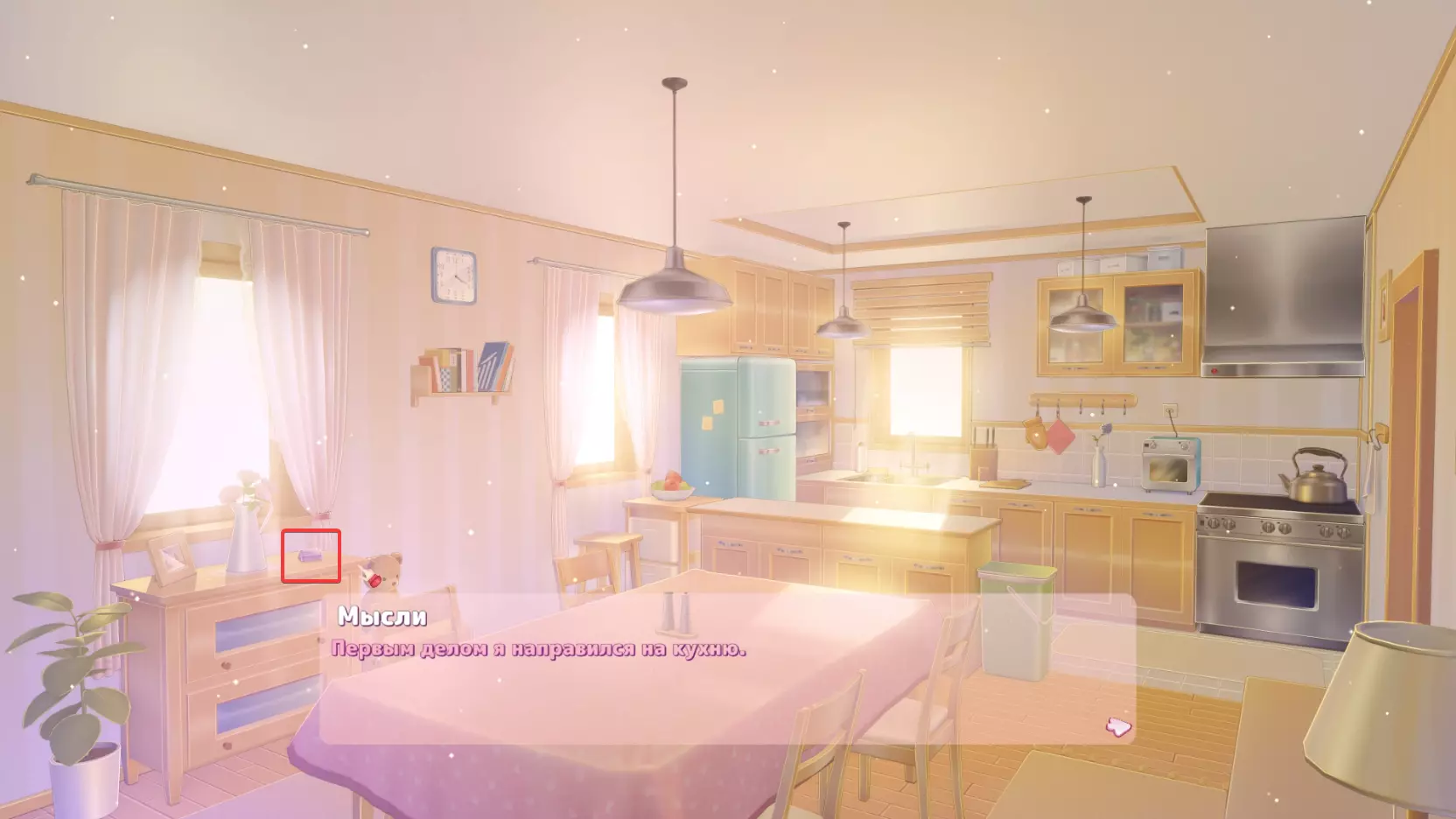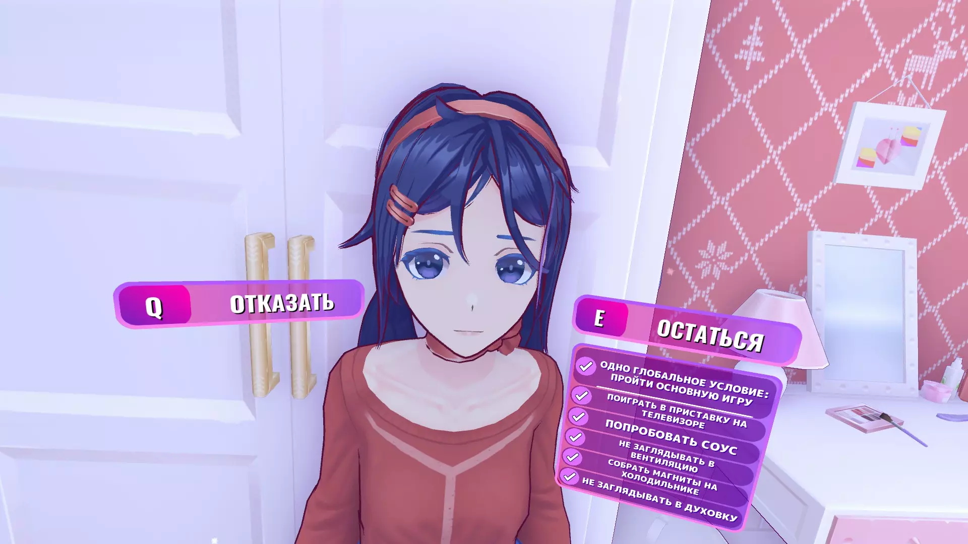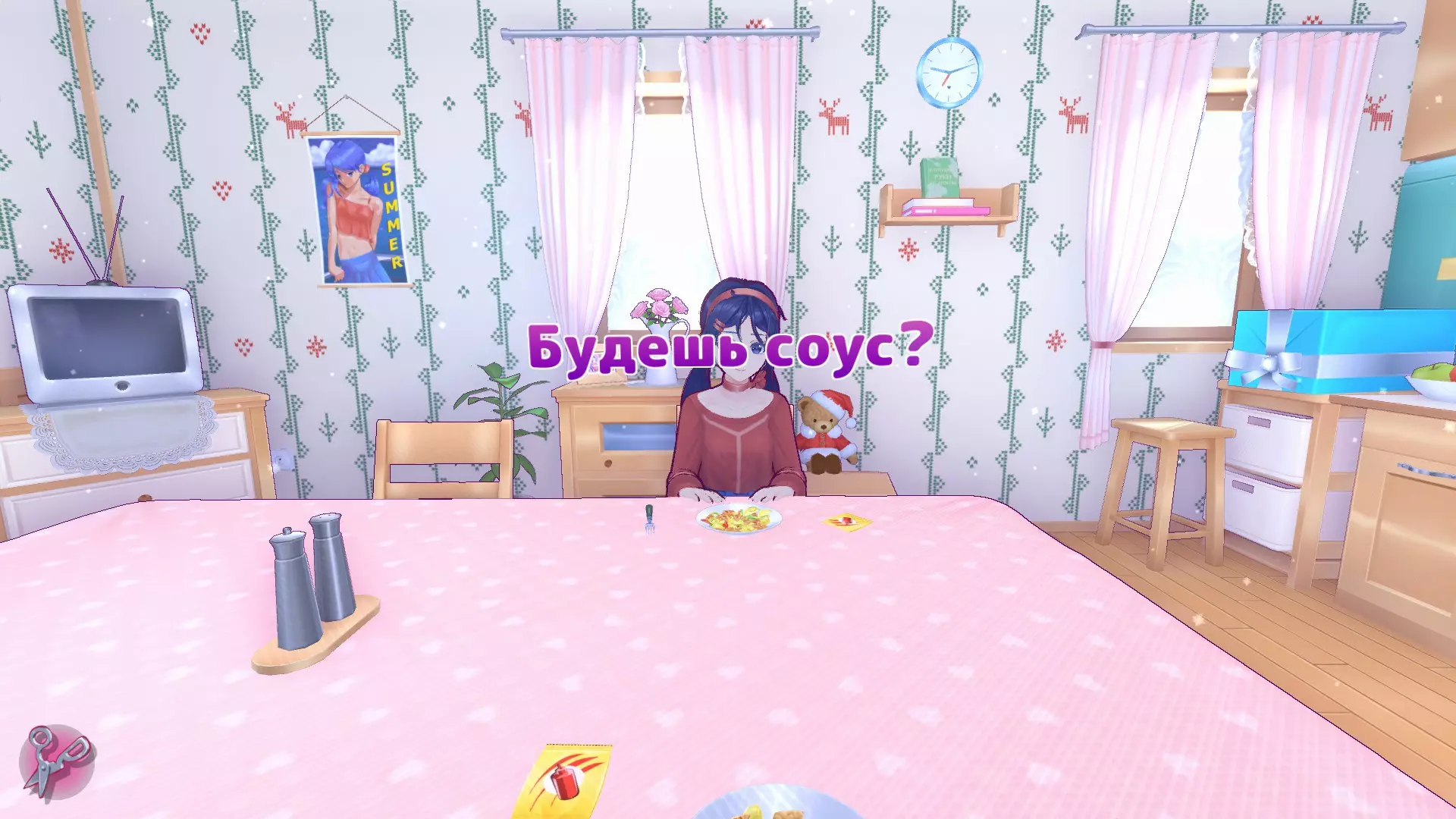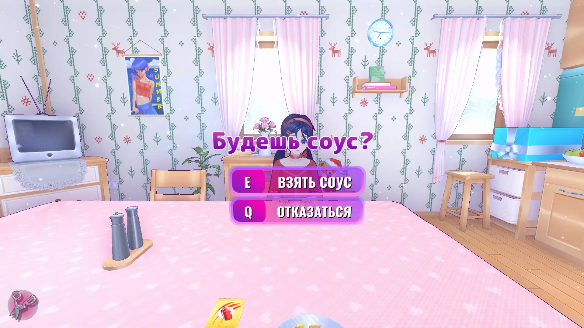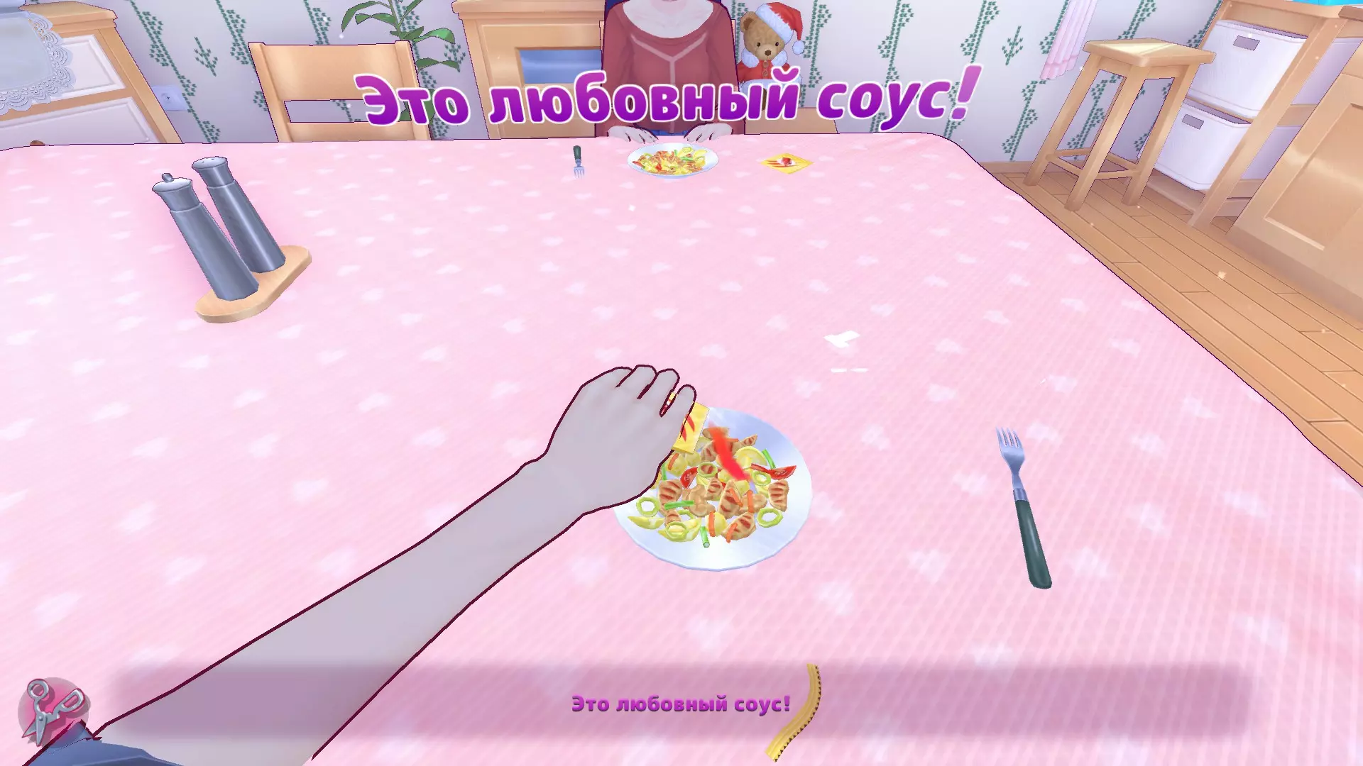 切完胡萝卜后,米塔会让我们去浴室拿剪刀。当我们坐到桌子旁时,她会给我们“爱情酱汁”,同意喝下酱汁就能获得成就。