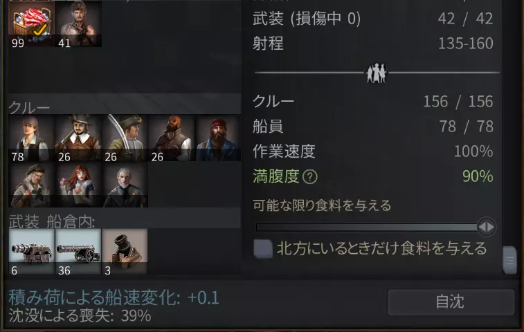 出港后打开船舱画面。 在船舱内左键点击食量,选择“自动消费”。 通过右下角的滑块调整许可量。 取消勾选“仅在北方时提供食物”。 游戏中期以后,在工坊制作的【粮食】变得重要。 制作【粮食】需要①新鲜的肉、②朗姆酒、③生粮品,因此建议不要出售②和③,将其保存起来。 前往渔村和贸易运输队(渔村或随机地点出现的贸易运输队),携带“鱼”可以与他们交换各种物品。武器 舷侧炮:低伤害、高DPM、广射界、中射程 长炮:中伤害、低DPM、窄射界、长射程 加农炮:大伤害、中DPM、中射界、短射程 船首尾炮:包含高精度长射程炮、大威力短射程炮、性能较差的连装炮三种,建议忽略连装炮! 特殊炮(如希腊火):威力强大,但仅限拥有专用槽位的船只装备。 武器类型:分为海盗武器(银色)和工艺武器(金色)。工艺武器射界和射程较好,操作顺手,但伤害较低,弹药消耗快;海盗武器则完全相反。制作武器需要专用工坊和大量材料,请注意。 如果在市场上出售制作武器所需的材料,或许能凑够购买海盗武器所需金额的一半左右。 顺便一提,交易公会的玩家制作武器时可享受25%的材料折扣,因此没有折扣的 solo 玩家进行制作从一开始就处于不利地位。制作前请仔细考虑。 击沉海盗船可获得海盗代币。代币可在海盗湾等海盗据点兑换海盗武器。便宜的是【提督炮】,人气高的是【英洛克炮】 20磅炮-提督炮:40代币 36磅炮-英洛克炮:100代币 连发大炮在发射时可能会因卡弹导致“连发”故障并损坏。连发故障不会对己方船只造成伤害,但大炮会消失。迫击炮不会发生连发故障,但设有炮身寿命,每次射击都会产生磨损。 专业船员 专业船员是拥有专门技术技能的乘员,可以在城镇的酒馆或私有岛的酒吧雇佣。 在私有岛的酒吧消耗75劳动力,可以招募特定领域的人才。无法招募“探险”领域的人才,但他们常常乘坐木筏在海上漂流。 在单人游戏模式中,可以获得一定数量的专业船员。如果让“探险队长”登船,加入的专业船员数量会进一步增加。 专业船员登船出海后会产生工资,海上执勤满36小时后,下次入港时会离舰。