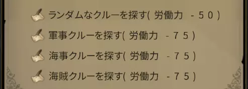 食物 获得饮食许可的船员会自行消耗已许可的食物。未获得许可的食物,无论船员的饥饿度如何下降,都绝对不会被消耗。 饥饿度充足的船员工作效率会提升。当饥饿度下降时,船员将无法在登陆点进行调查(采集),在北方海域甚至会死亡。 初期可以先许可购买价格较低的【新鲜的肉】等食物。【鱼】属于贵重物品,建议不要许可。 进入港口后,所有船员的饥饿度会完全恢复,因此如果只在港口周边活动,也可以选择不许可食物。